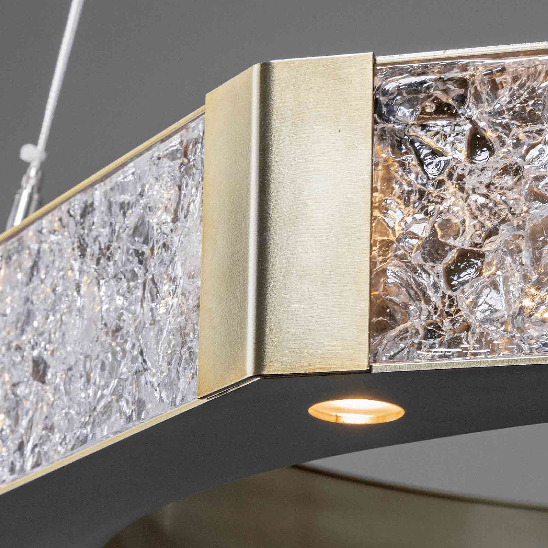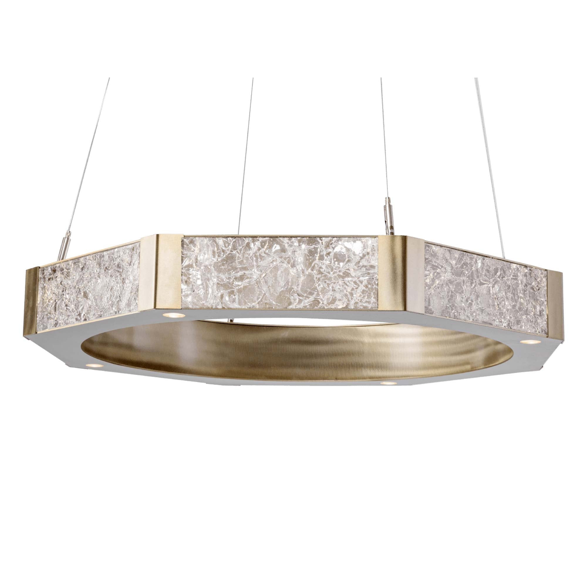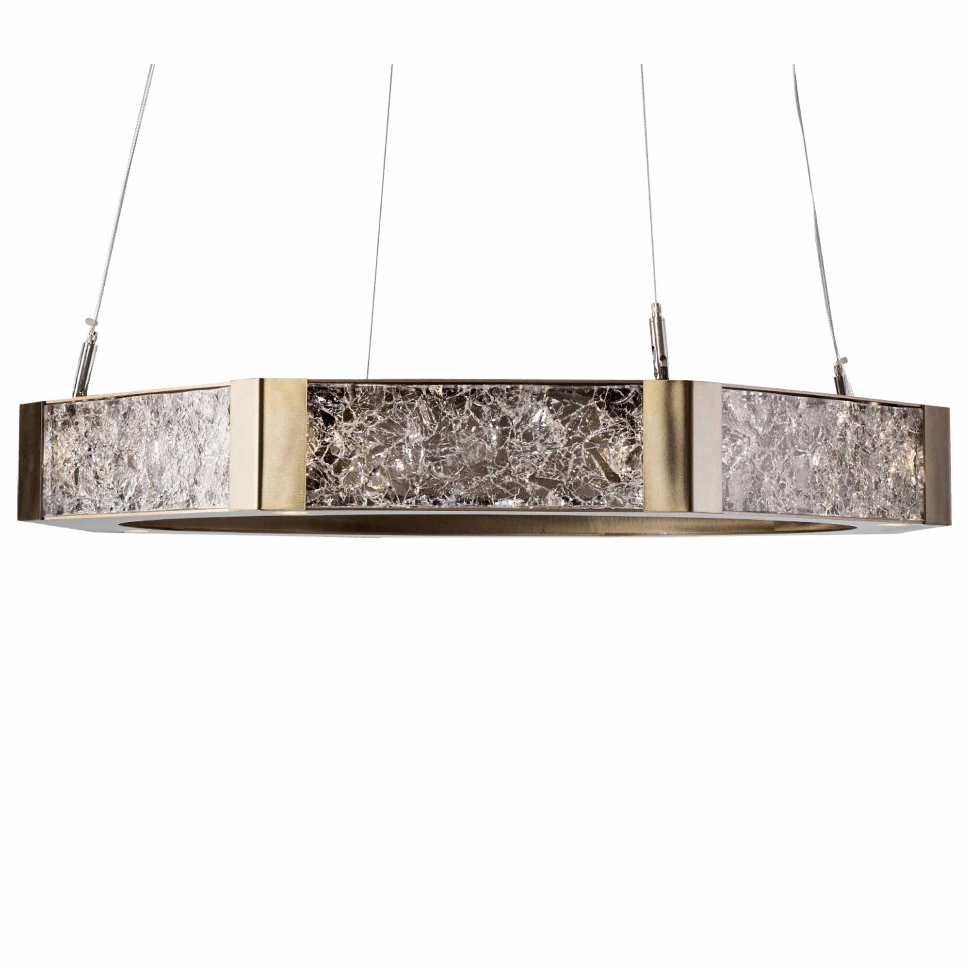 Gorgeous light is cast through the unique glass panels that encircle the Glacier LED Chandelier from Hammerton Studio. Striking texture in the hand-crafted glass is juxtaposed with smooth, sleek metal framing for a truly engaging presentation suitable to any living space.