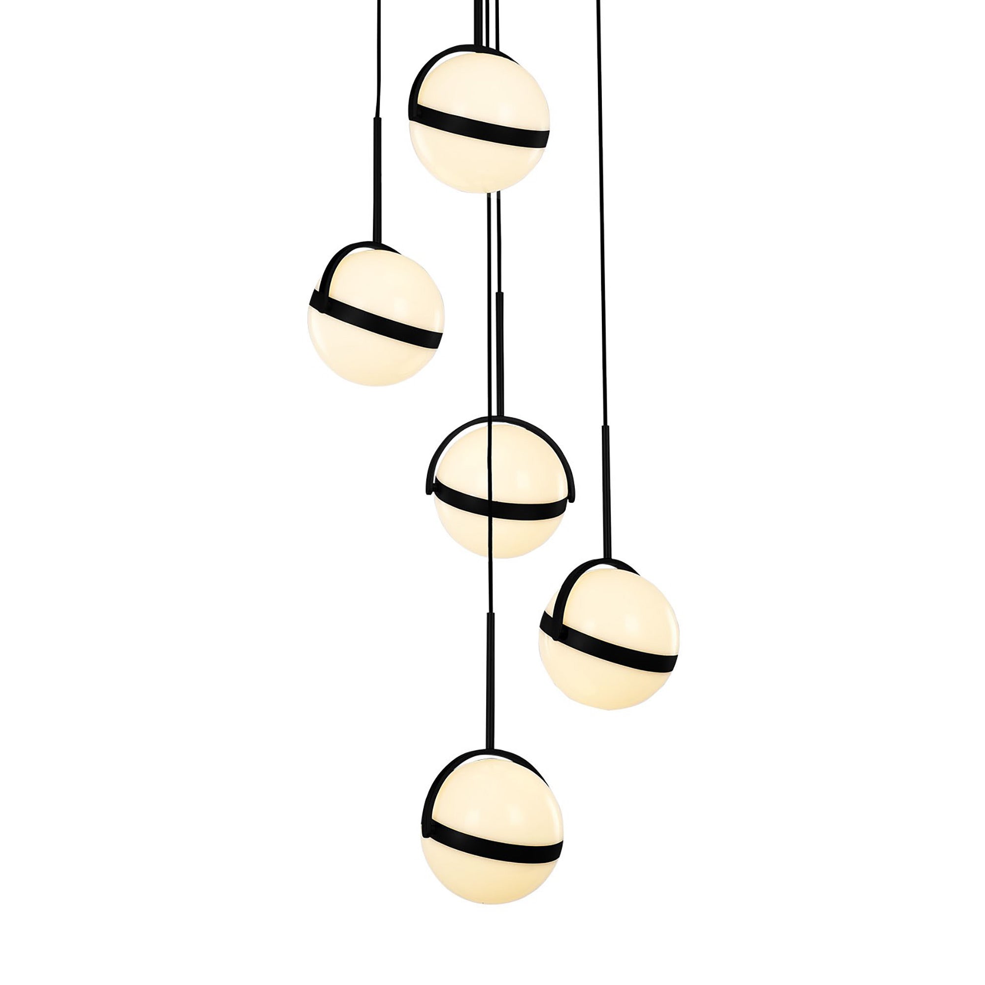 Suspended at varying heights, each glowing orb shade on the Globo Multi-Light LED Pendant Light from Alora Lighting is highlighted with contrasting metal bands that add industrial flair.