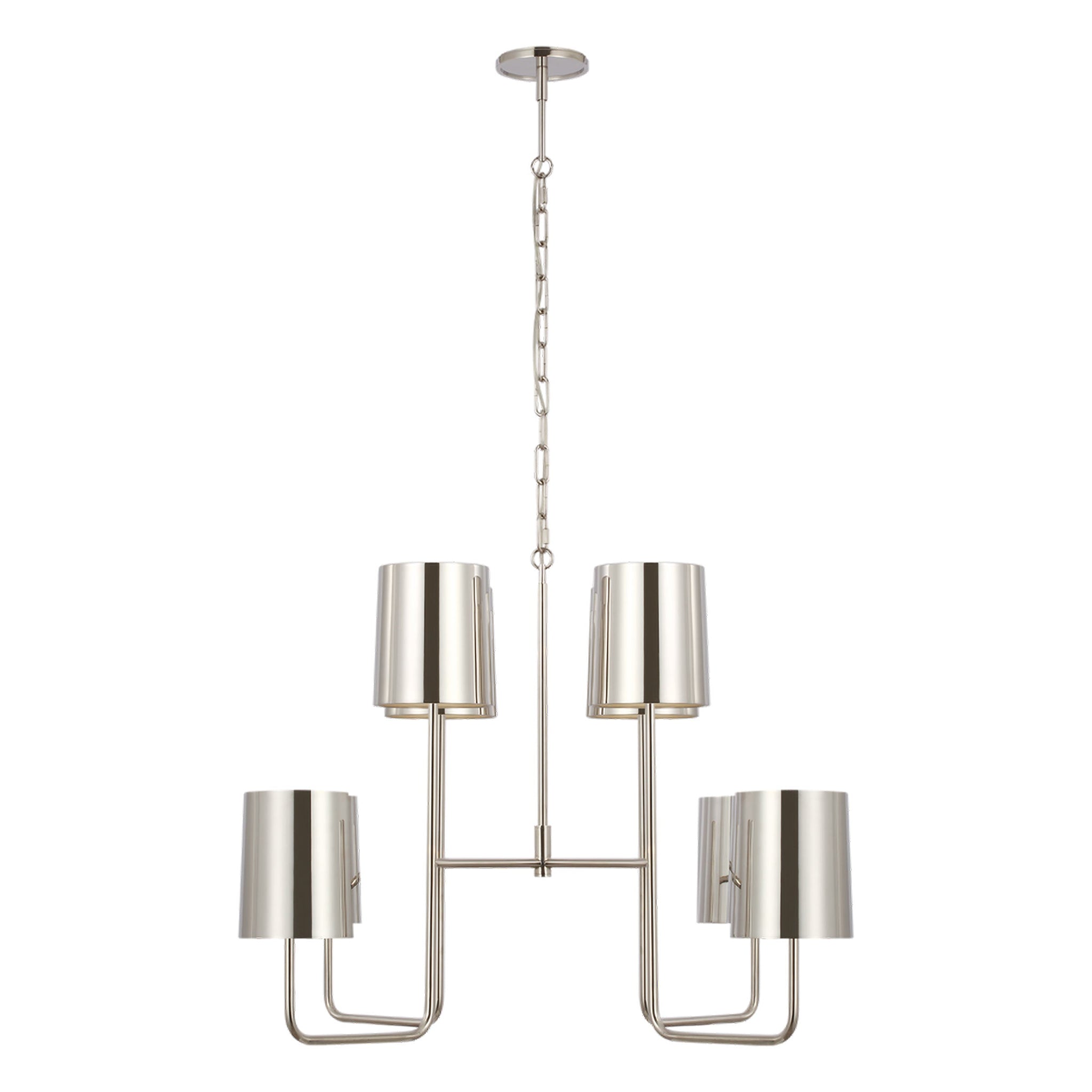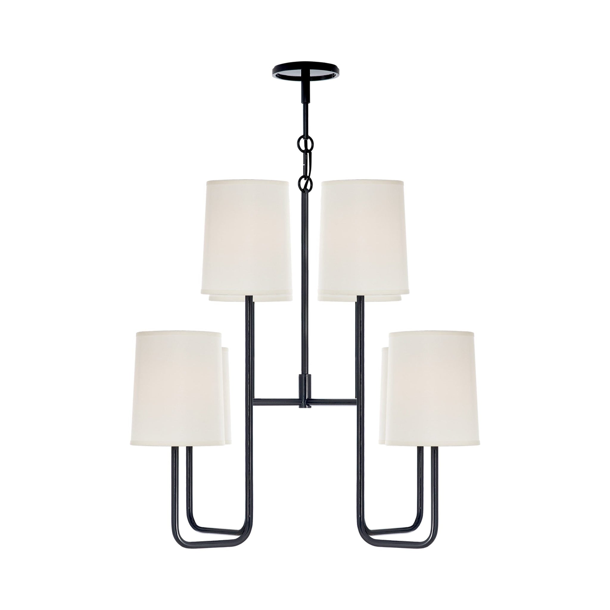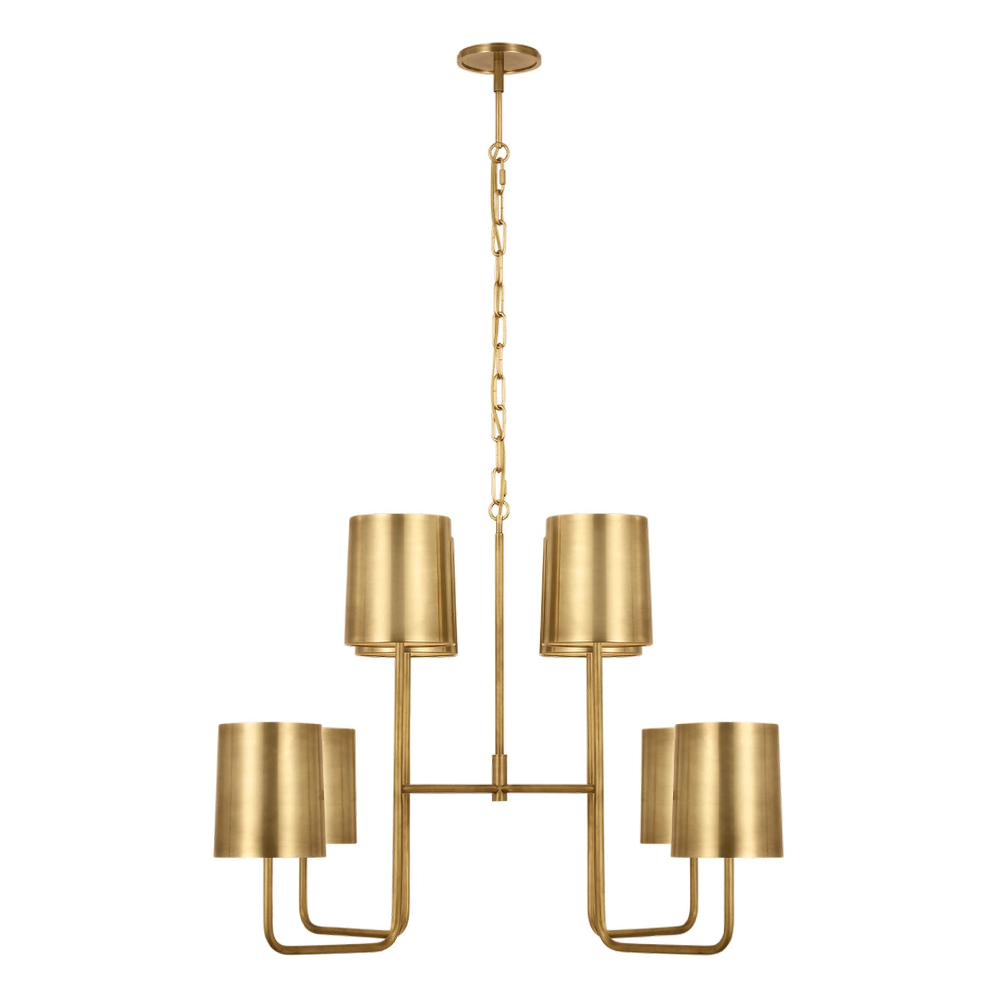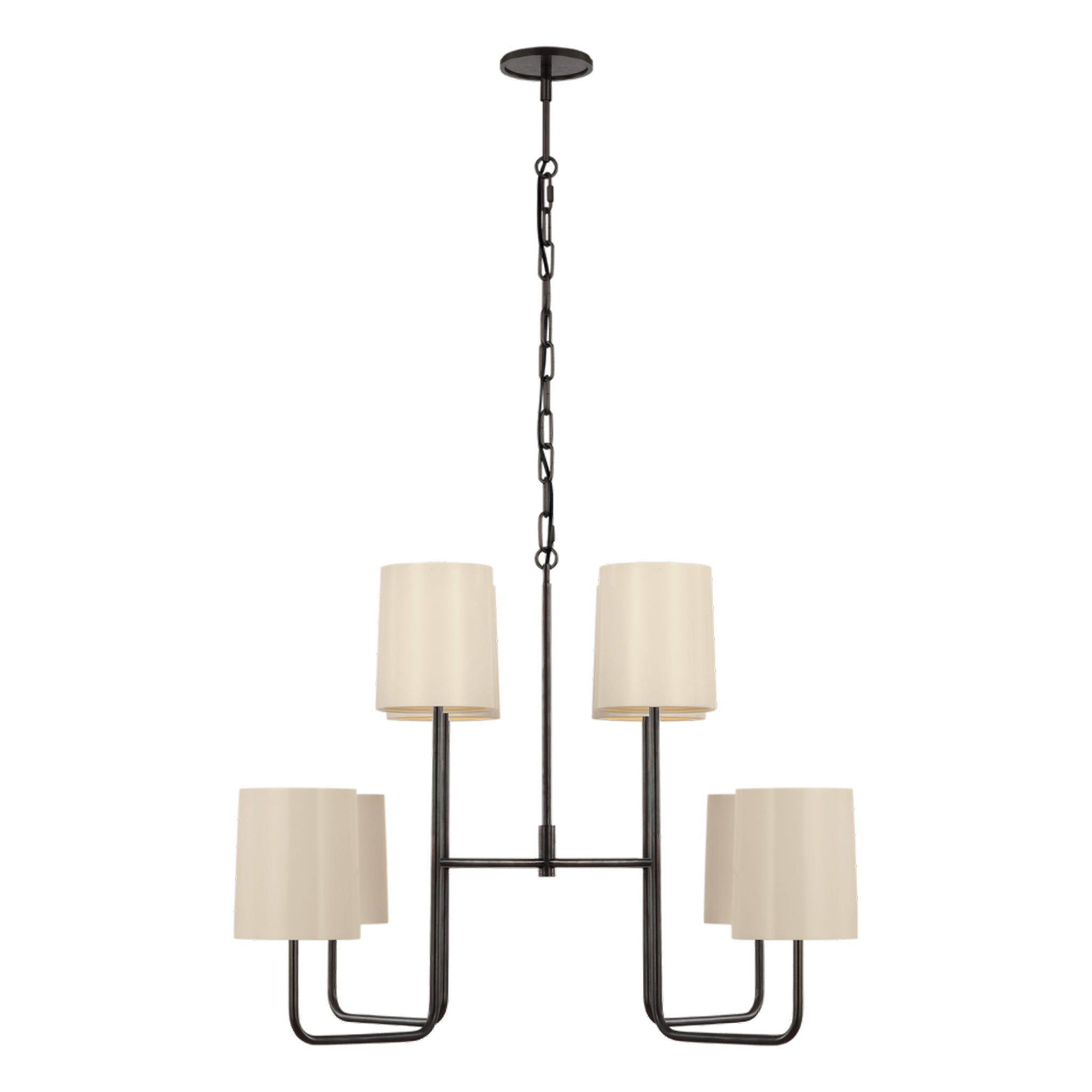 Four arms display a classic candelabra design on the Go Lightly Chandelier from Visual Comfort Signature. This piece pulls together small dining looks overlooking the cityscape.