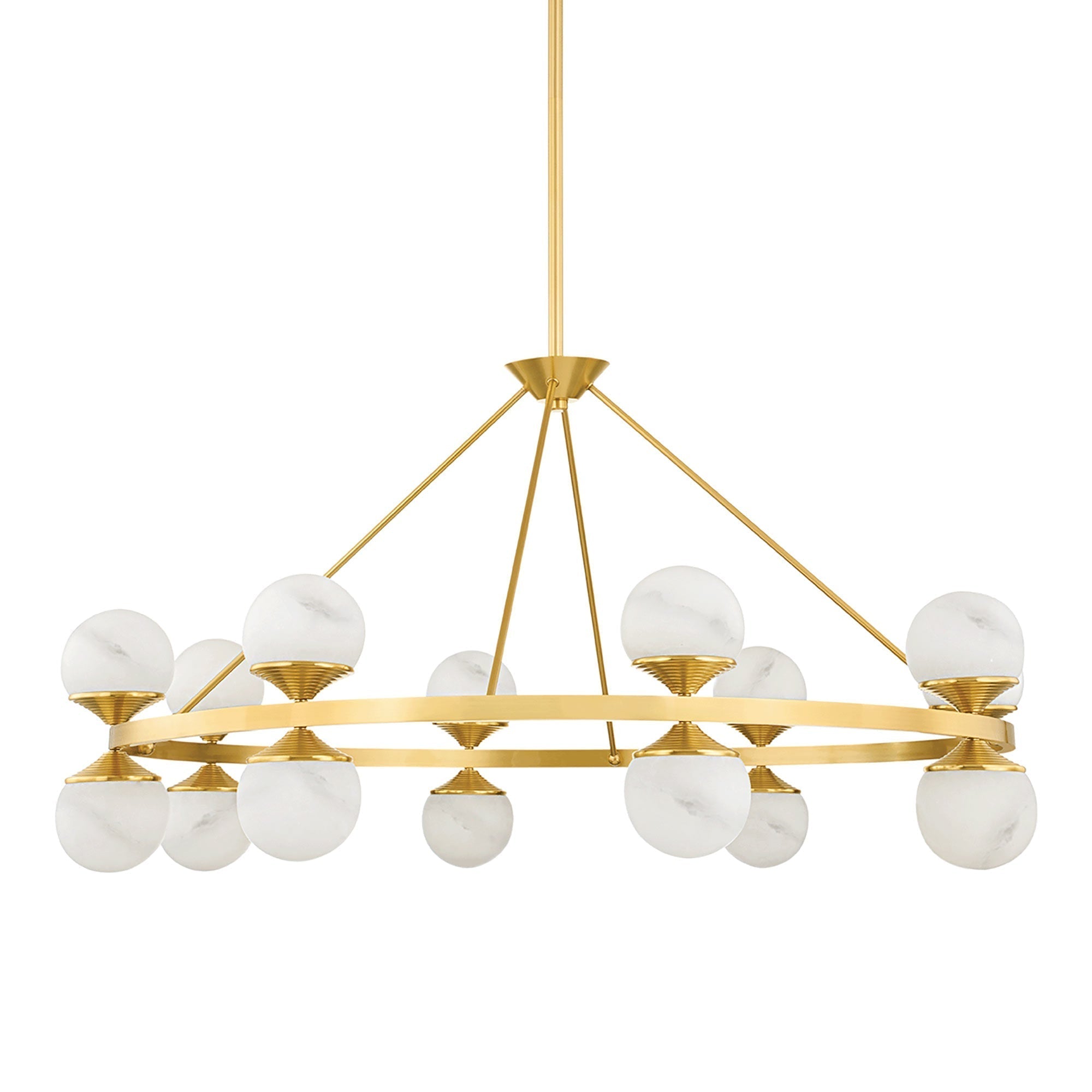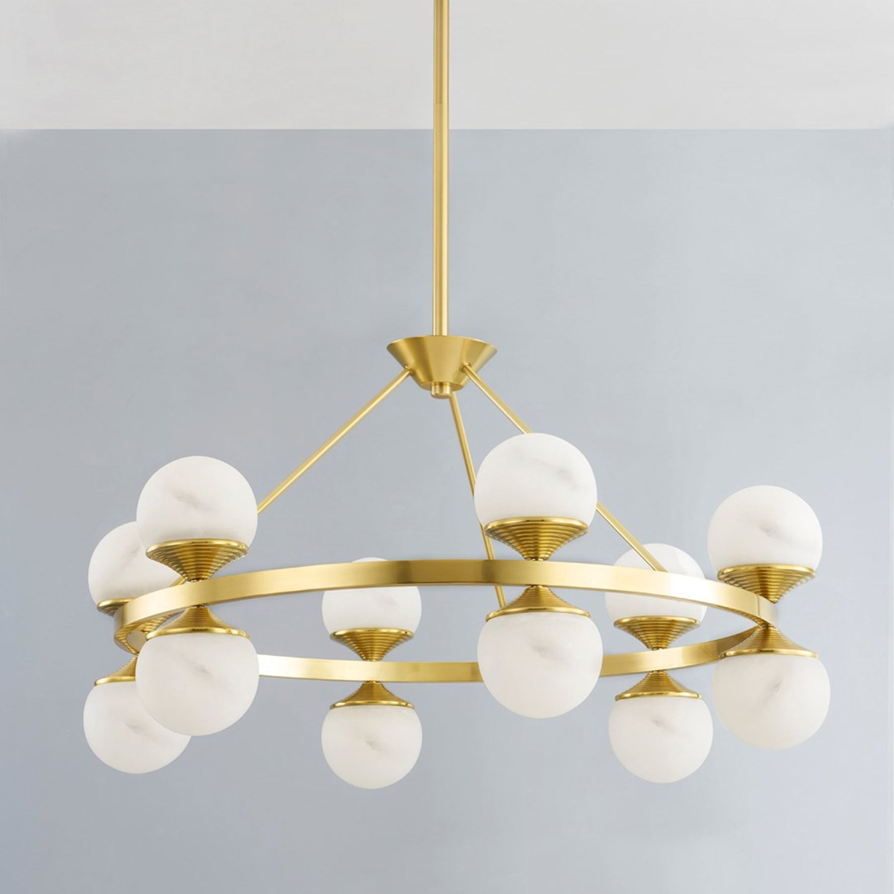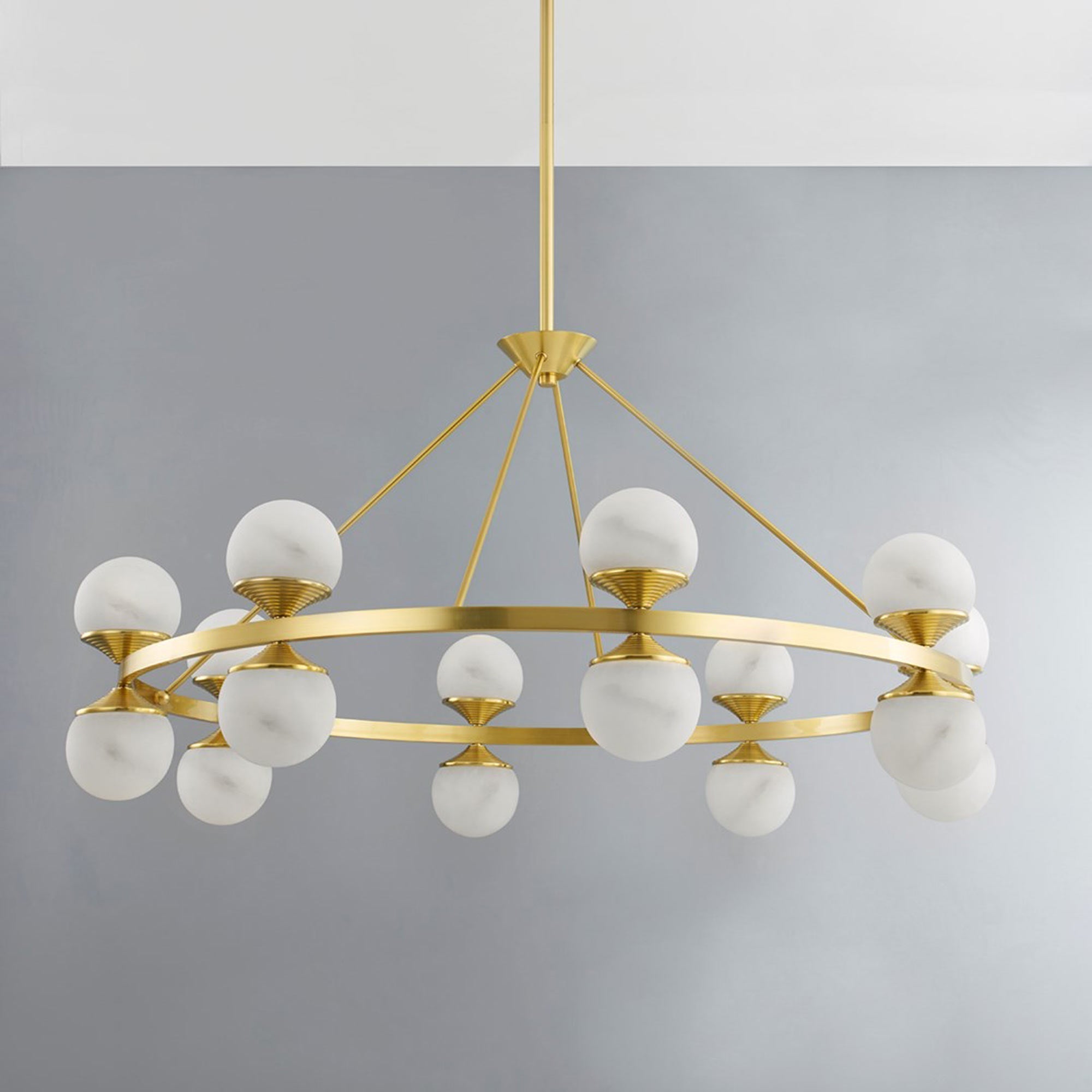 Subtle yet artistic accenting adds style power to a glam fixture with retro influence. The Grafton LED Chandelier from Hudson Valley Lighting indulges in earthy elegance, fashioning carefully placed white Spanish alabaster globe shades around an aged brass finish metal ring frame and balanced with a tripod suspension design. This energy-efficient fixture offers delightful nostalgic charm.