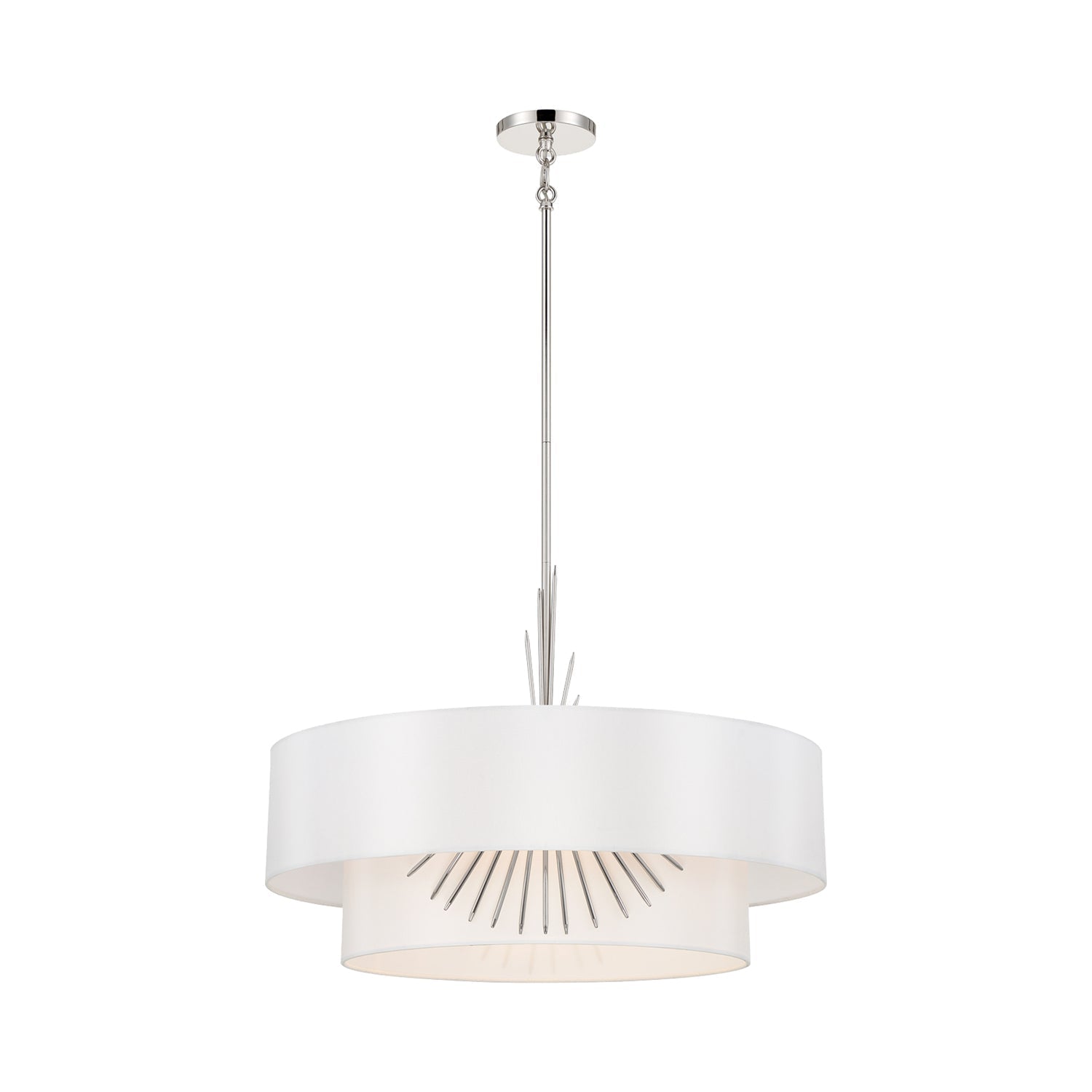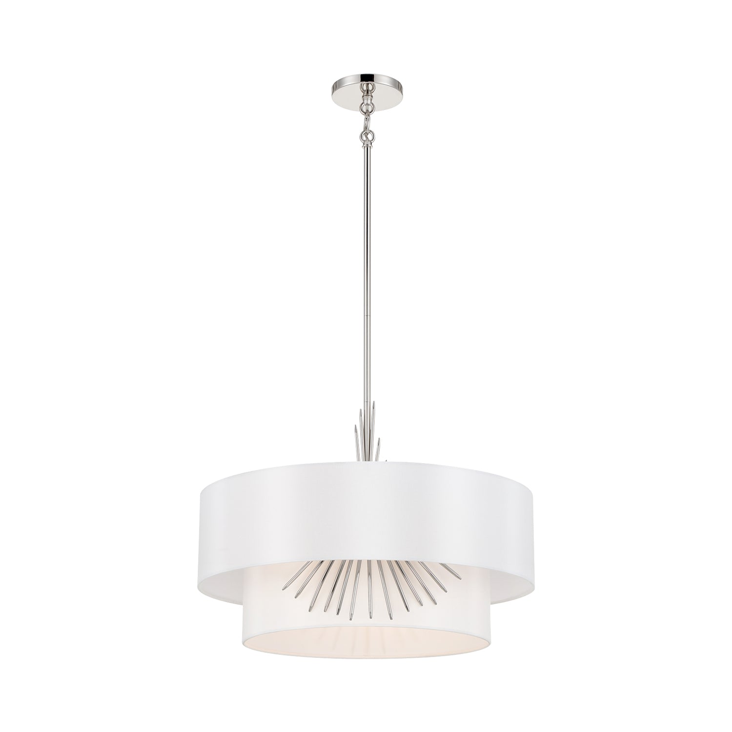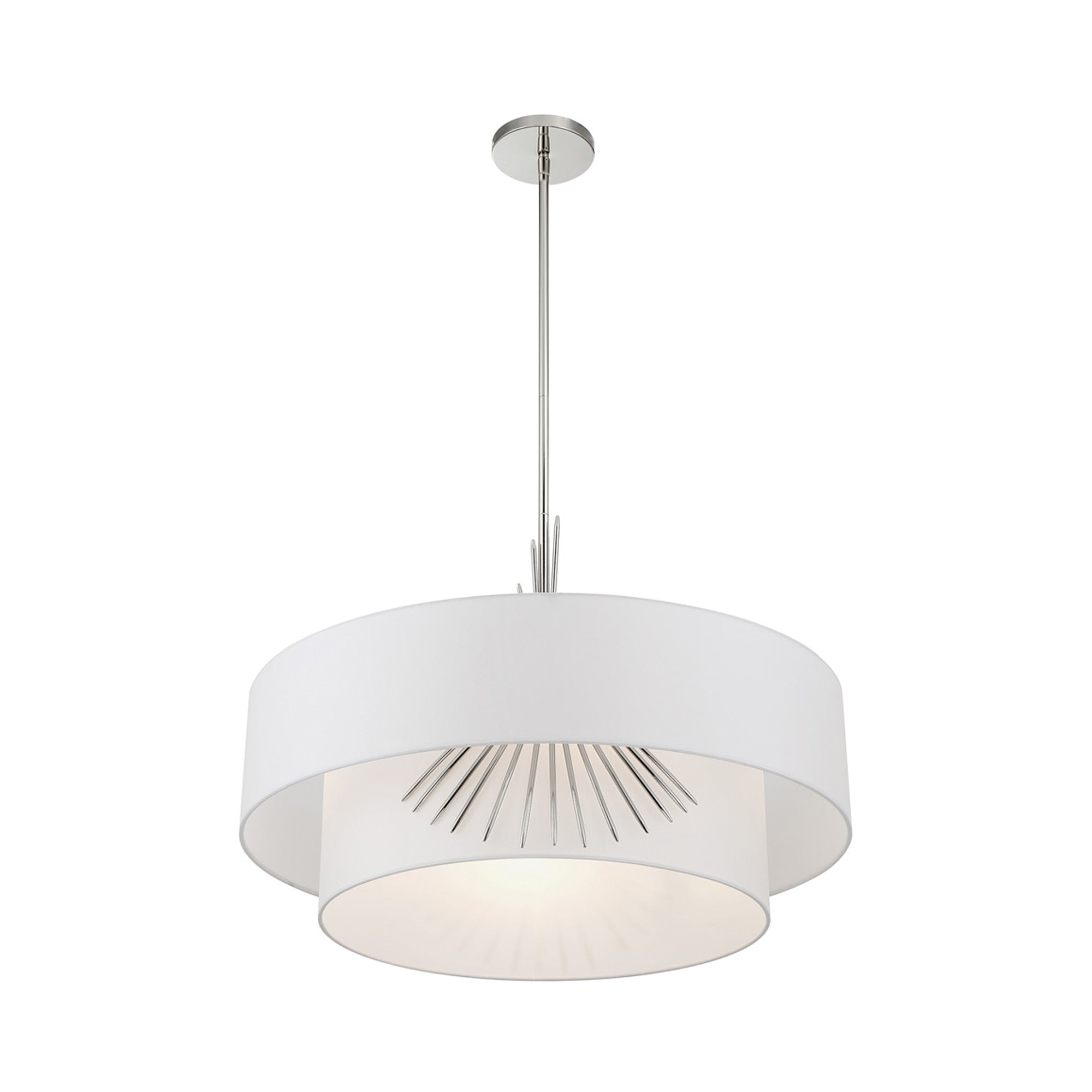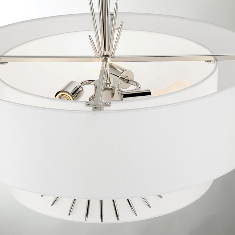 The exquisite and glam look of white silk dominates a chic feature of a decadent light fixture with both elegance and simplicity merging to add versatility. Symmetry works in artisan ways to create the Gramercy Pendant Light from George Kovacs, maintaining a low profile with charming metal accenting that invokes iconic tradition. Choose this pendant for its ethereal aesthetic and ability to lighten any mood.
