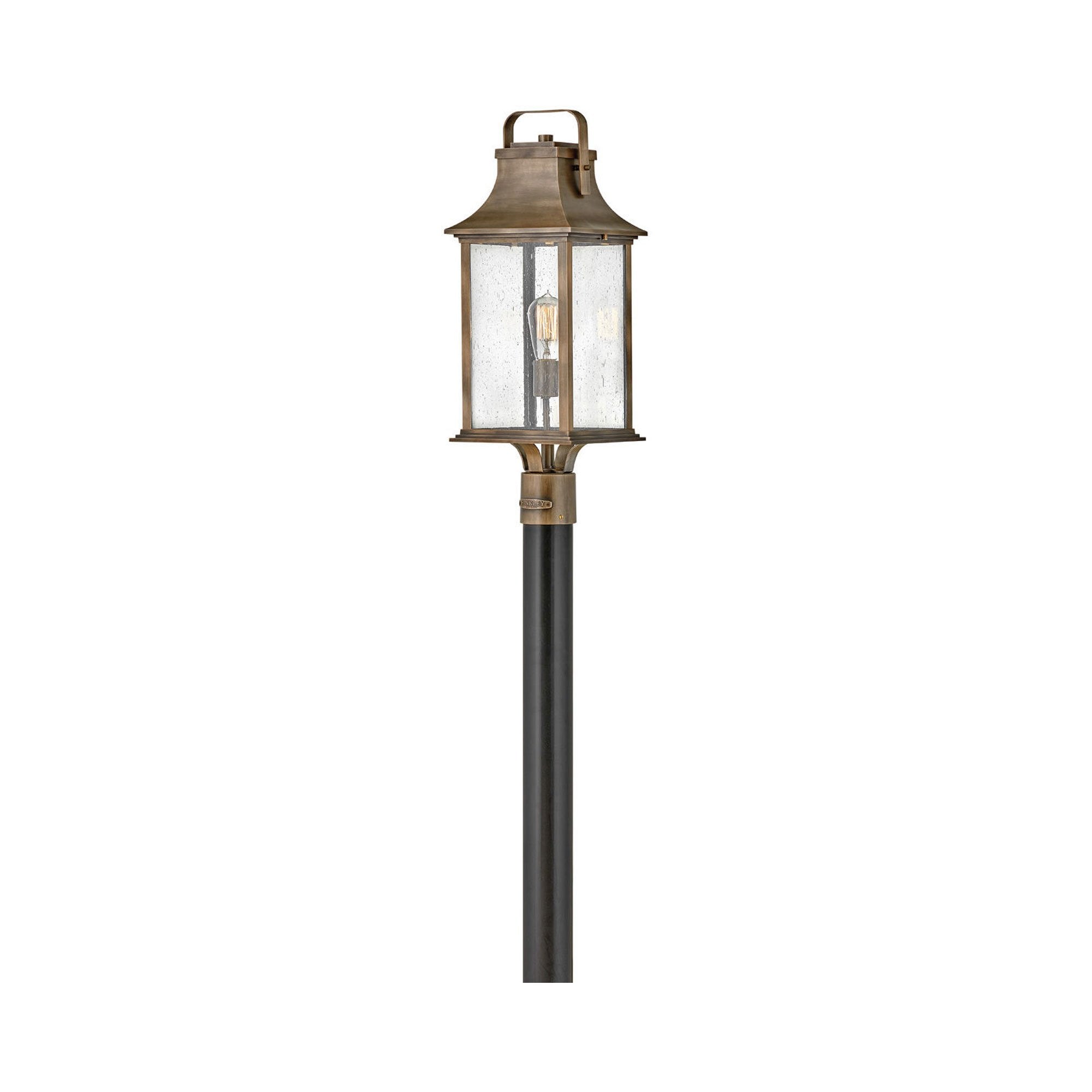Seedy glass panels add watery elegance to the Grant Outdoor Post Lantern Light from Hinkley. A timeless addition to a front walk or garden path, its lantern design adds richness and character to any exterior.