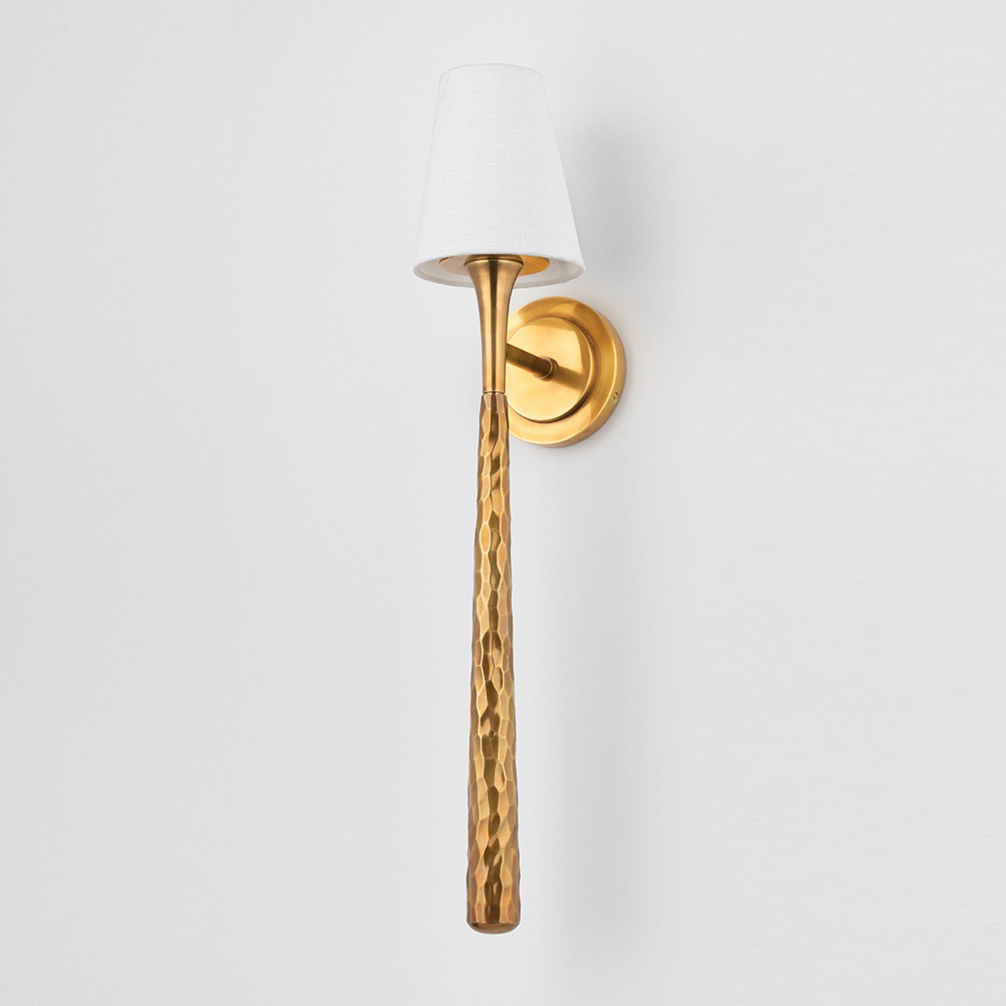 Classic reworking of a conventional lamp design tells the story of modern elegance as the Greta Wall Light from Corbett Lighting becomes an integral part of interior lighting. Vintage brass finish metal is texturized and stretched into an elongated stem capped with a petite white linen shade, offering a radiant warmth and a delicate aesthetic.