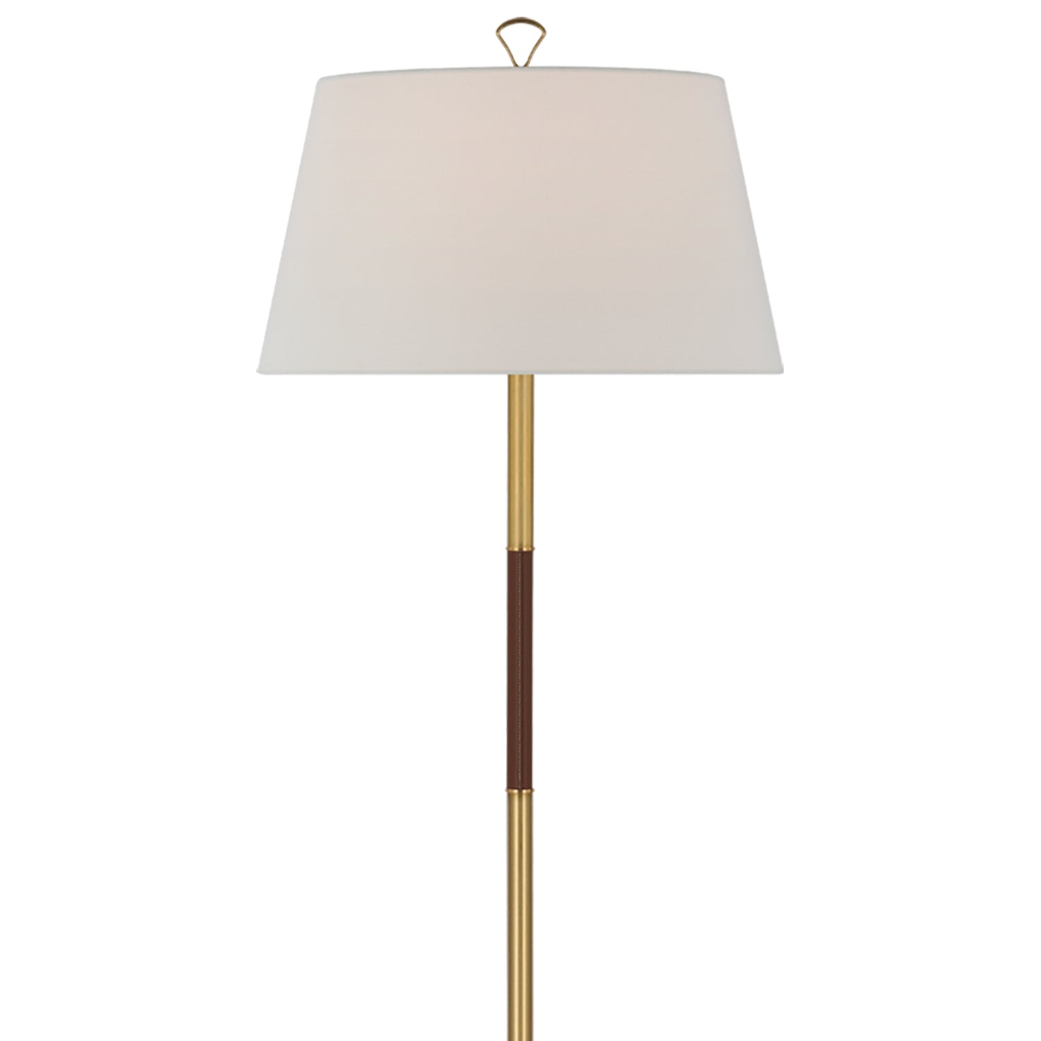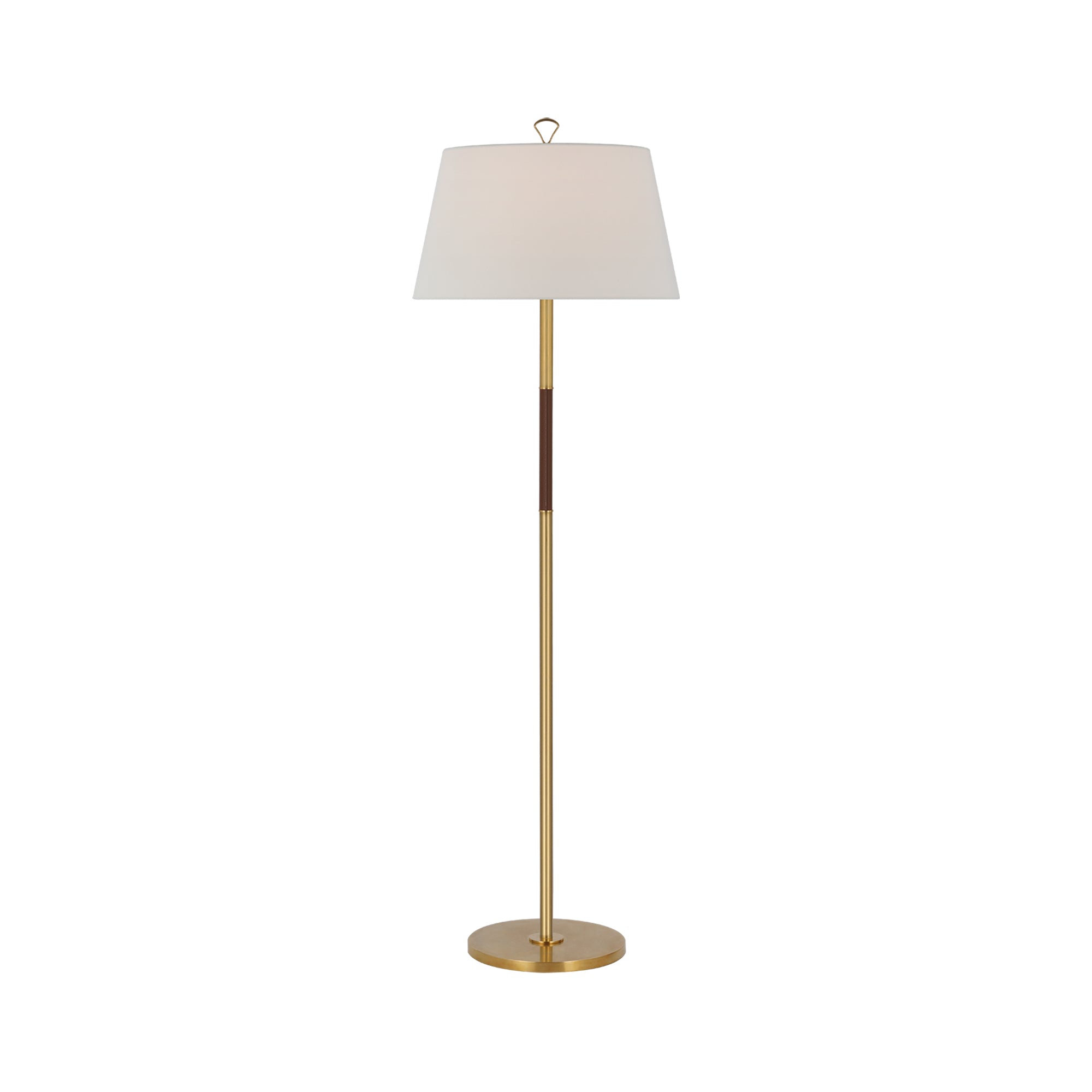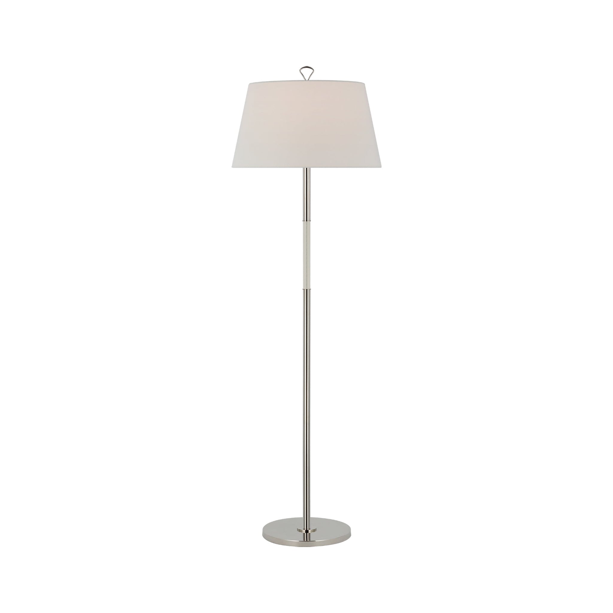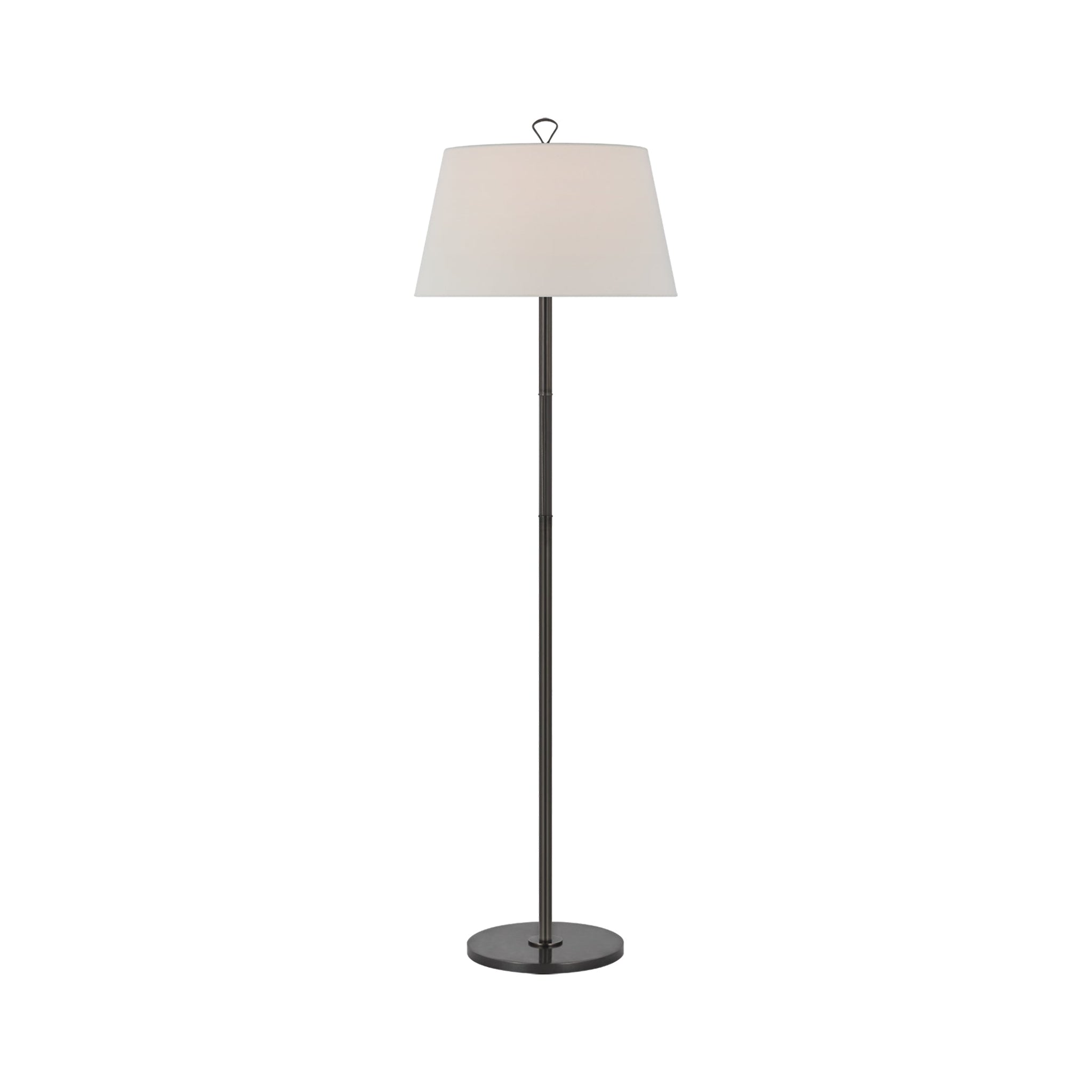 A scaled-down configuration retains the versatility you crave in lighting for various modern living spaces. Metal construction is classic and clean as the Griffin Floor Lamp from Visual Comfort Signature makes a definitive statement with its linear stem and round base, crowned with a classic linen shade. The result is an all-purpose source of ambient lighting that endures through decor restructuring.