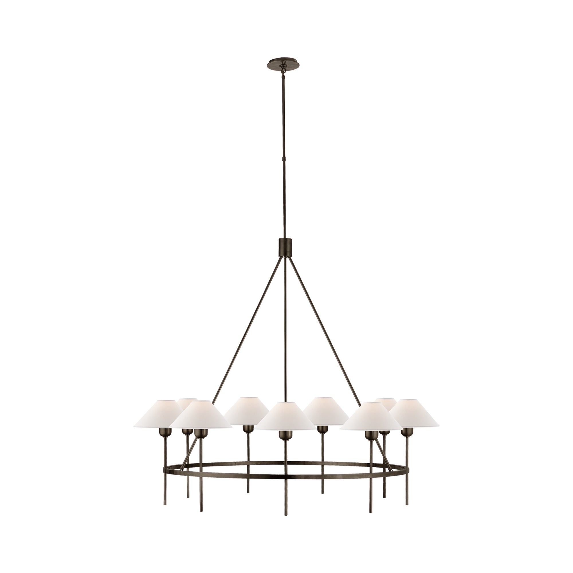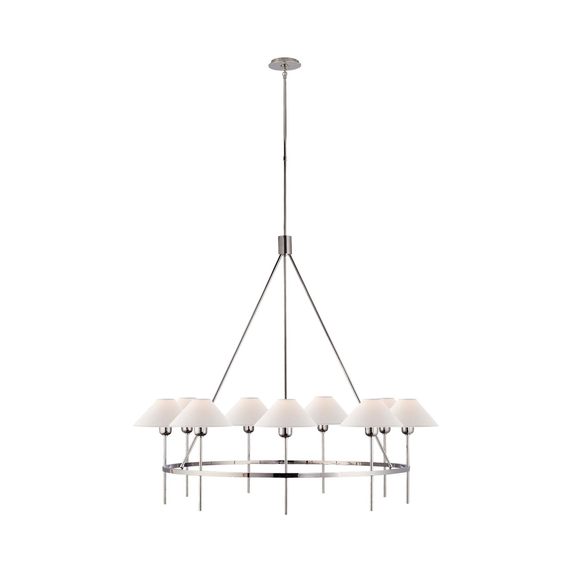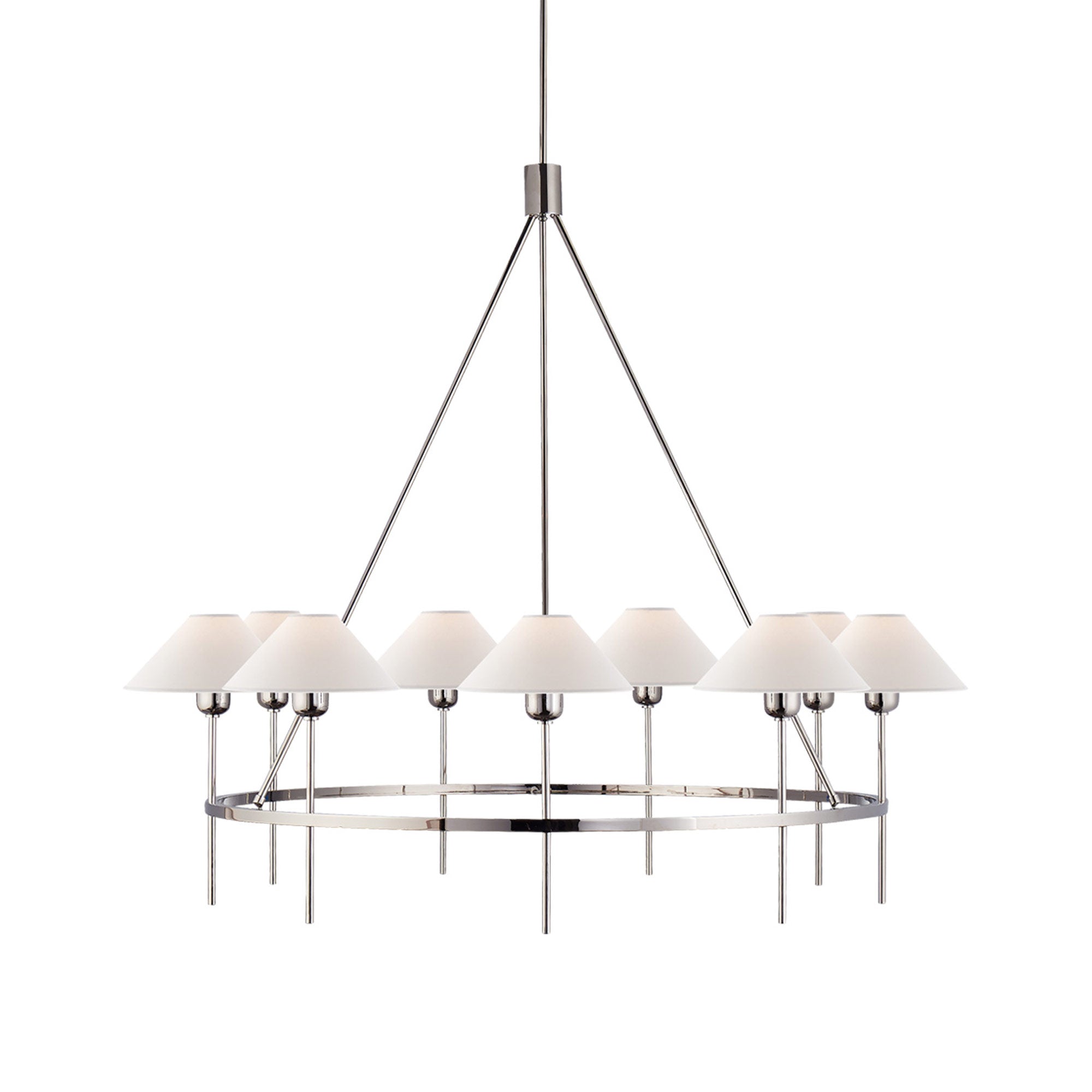 Take a moment to soak up the delicate charm of the Hackney Chandelier from Visual Comfort Signature and its tempting Asian-inspired design factor. This ring chandelier builds on a classic metal frame, embellished with dainty glass shades that take on an umbrella silhouette. Choose this delightful fixture for a dining space or entryway.
