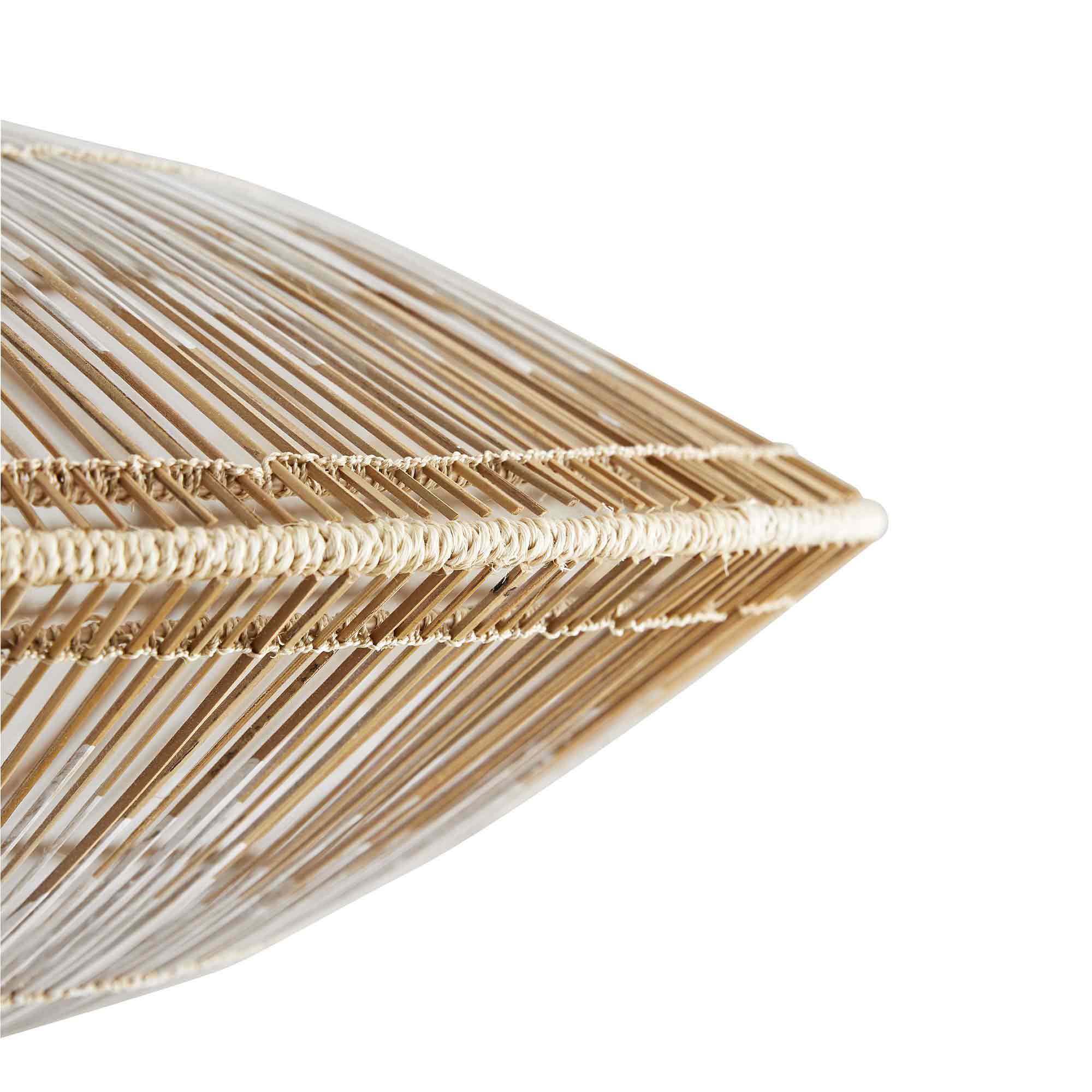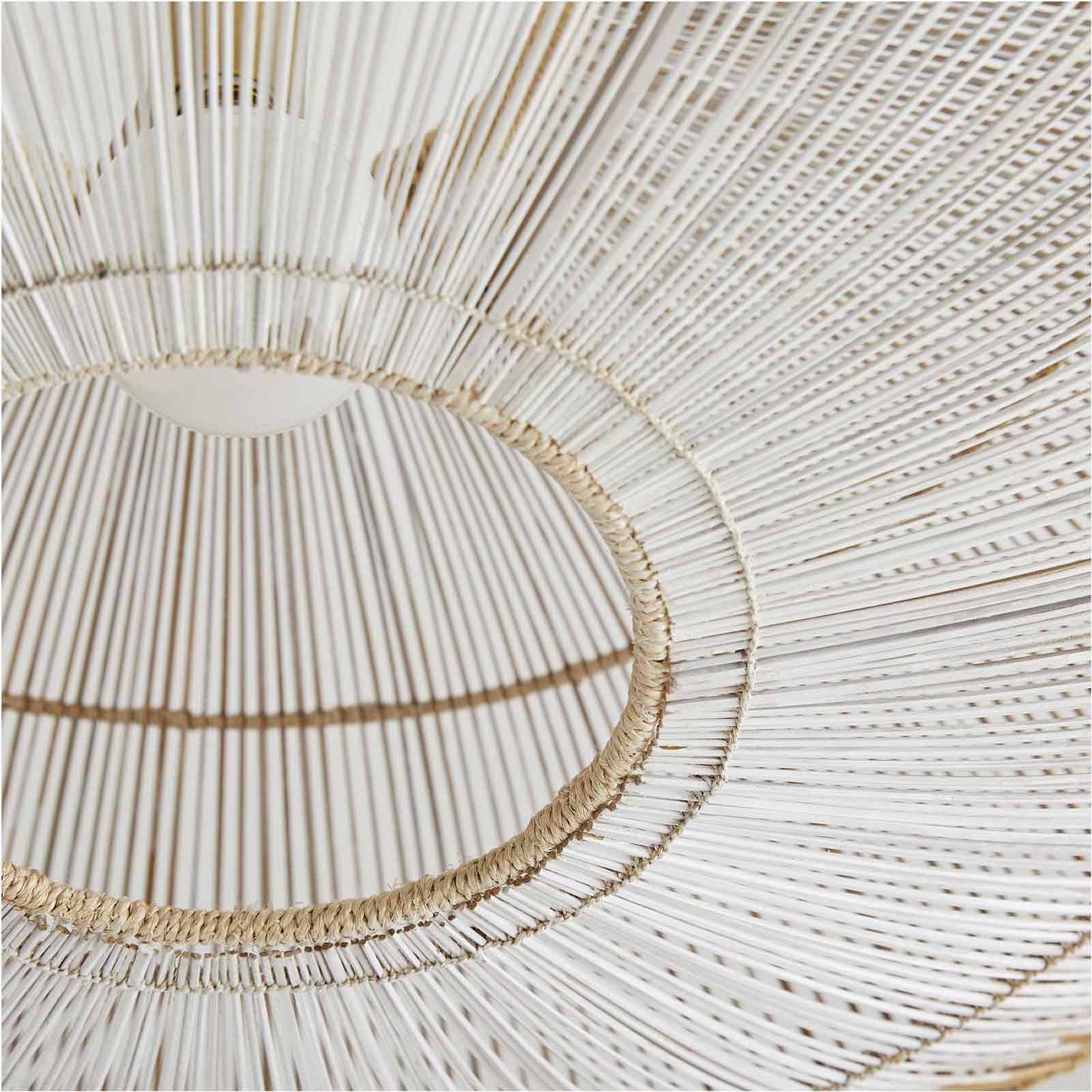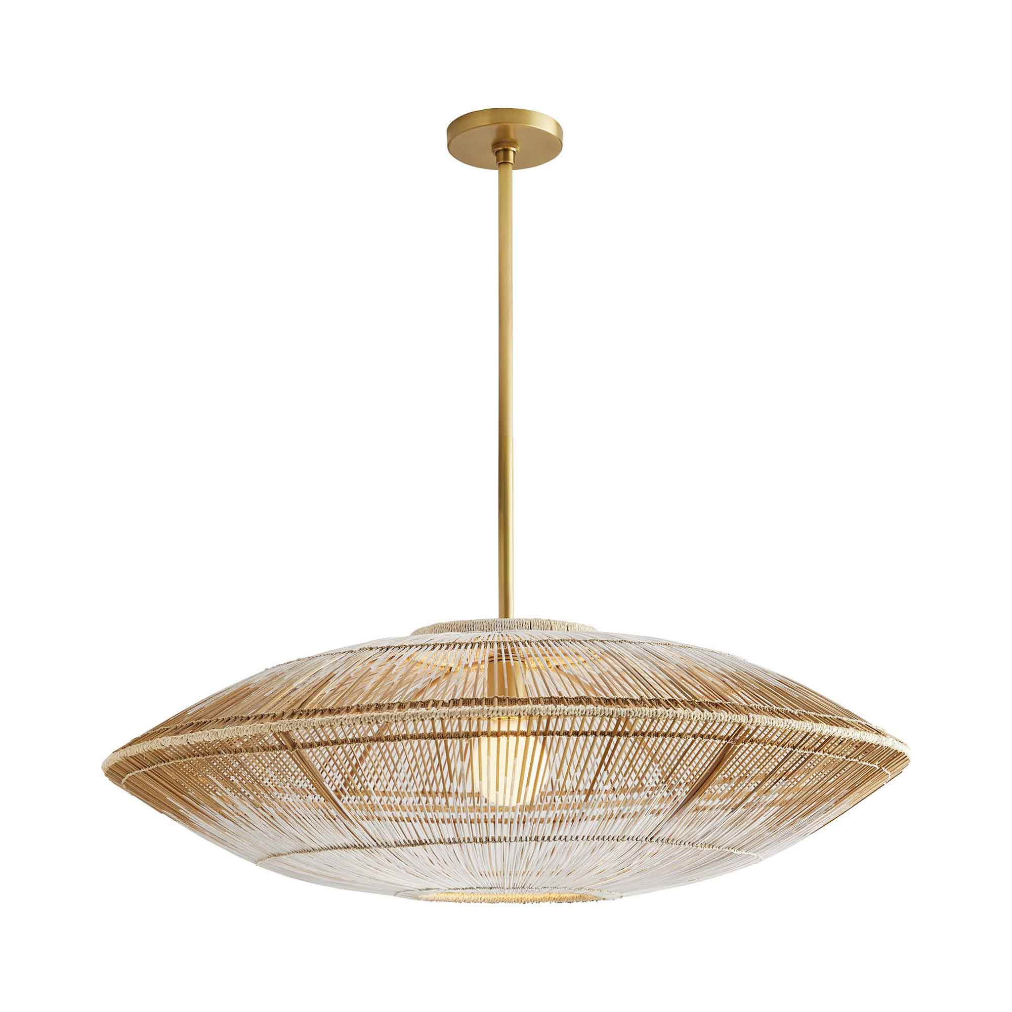 Delicately woven with slim ribs for a textured, natural effect create the silhouette of the Hadya Pendant Light from Arteriors. Saucer-shaped and perfect for a welcoming entry or breakfast nook, this pendant includes an abaca-wrapped edge and a white ombre finish for a light, airy ambiance. An antique brass accent finish adds warmth and is a charming nod to the mid-century inspirations of its engaging silhouette.