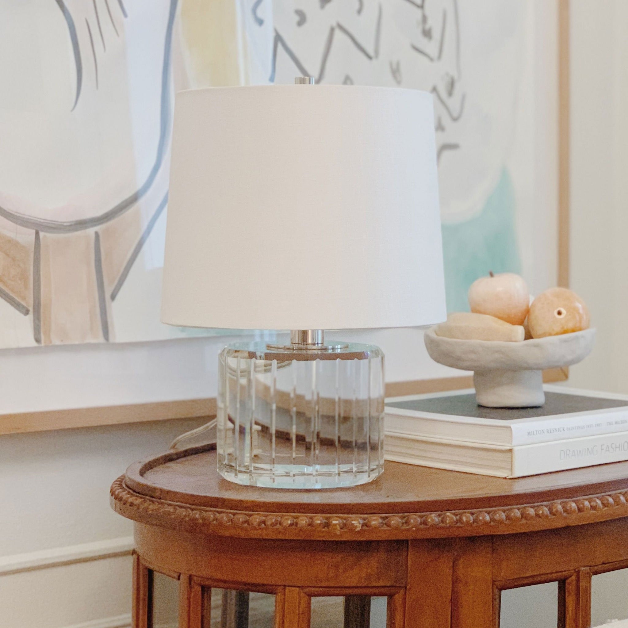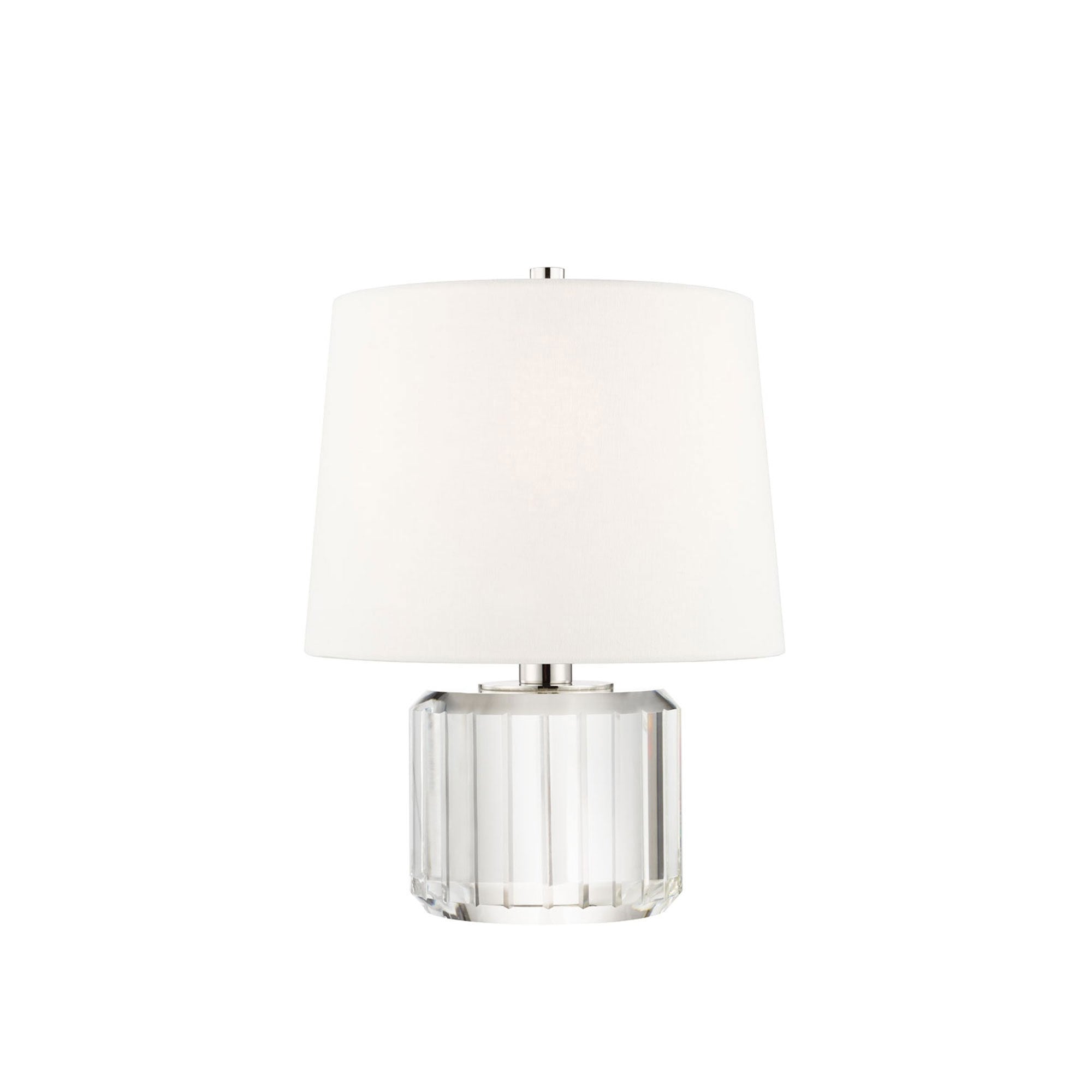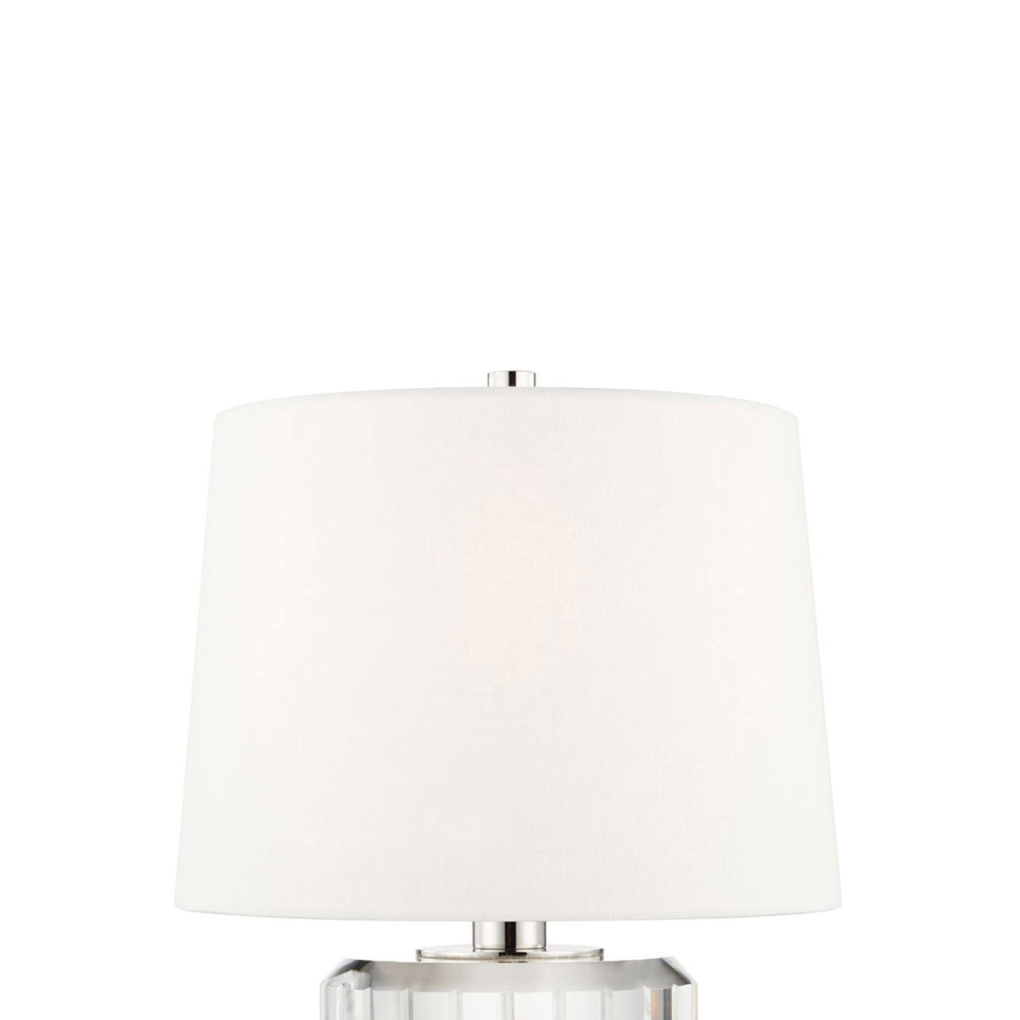 Dense blocks of furrowed glass resembling works of imposing architecture, Hague adds textural depth to a space. Its nickel finish and linen shade contribute to its air of cool modernism.