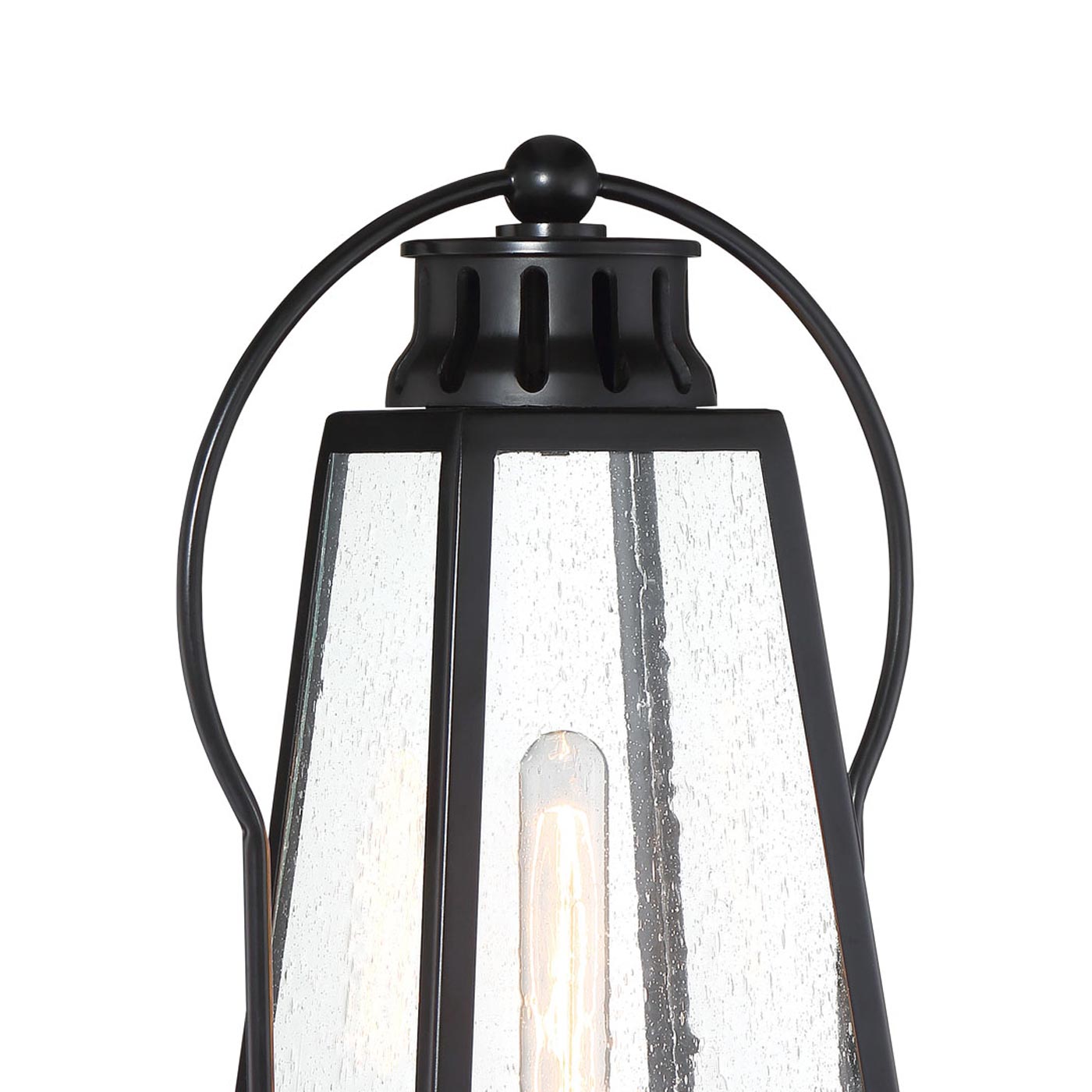 Embellished with subtle yet artistic vibes, the Halder Bridge Outdoor Post Light from The Great Outdoors creates a sophisticated feel in a landscaped space or along a pathway. Slender metal elements with a bold sand black finish include a charming halo accent on a lantern-inspired frame. Clear seeded glass panels complete a list of elements offering romantic elegance.