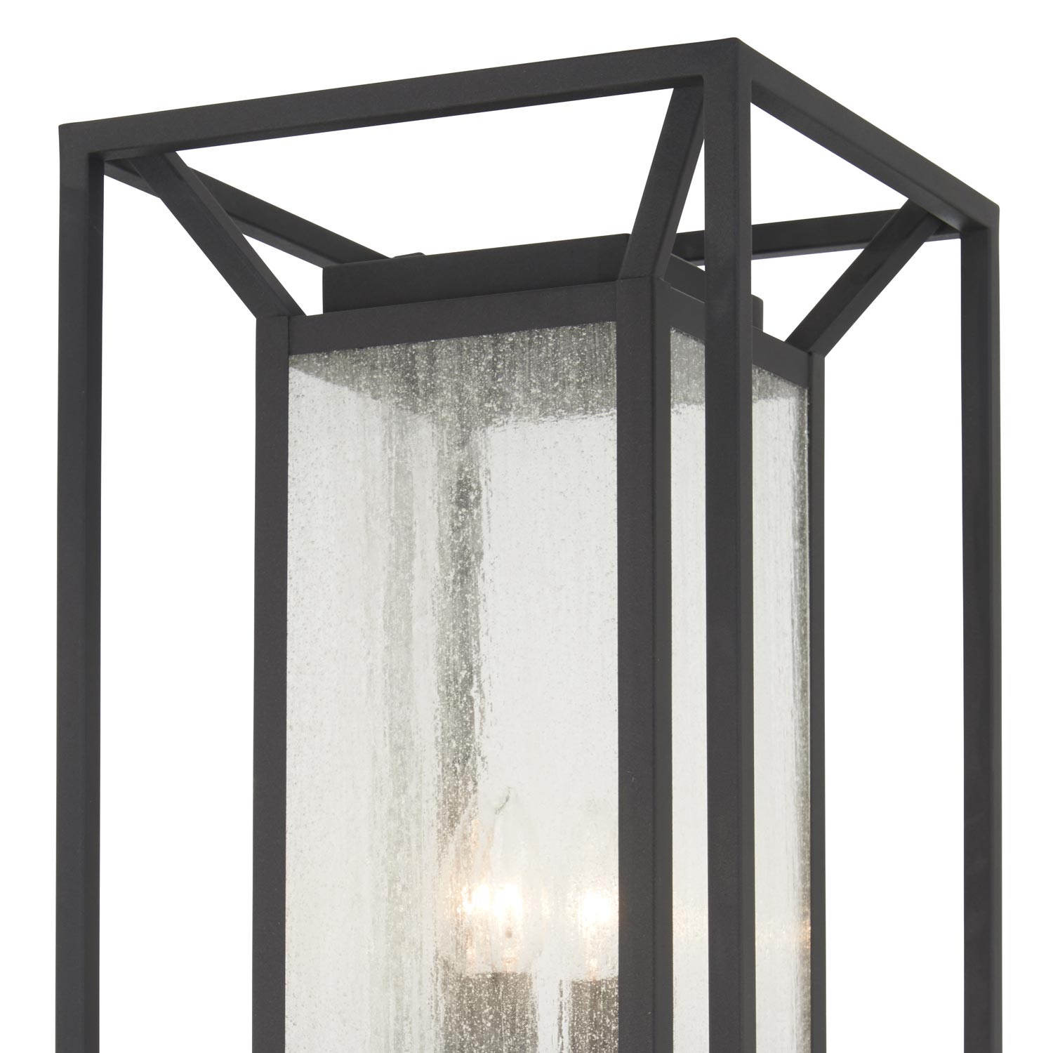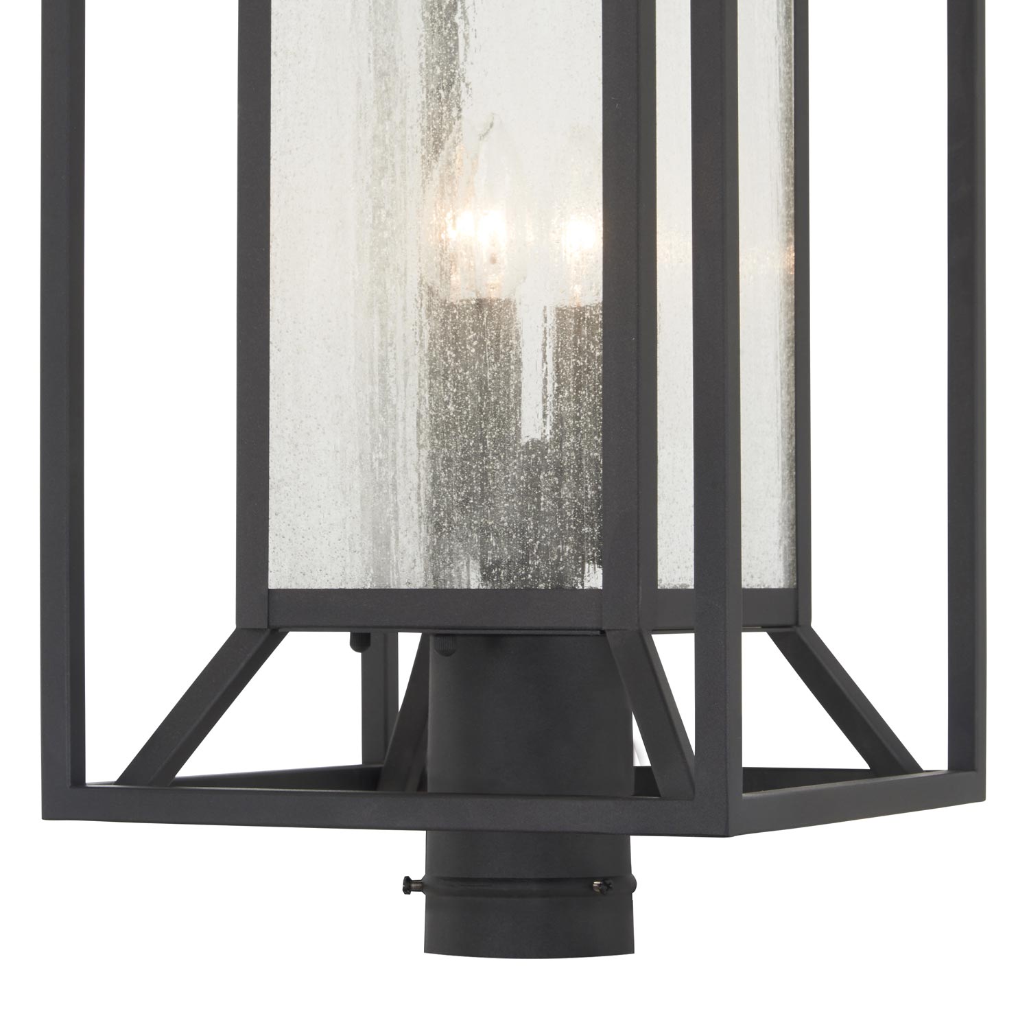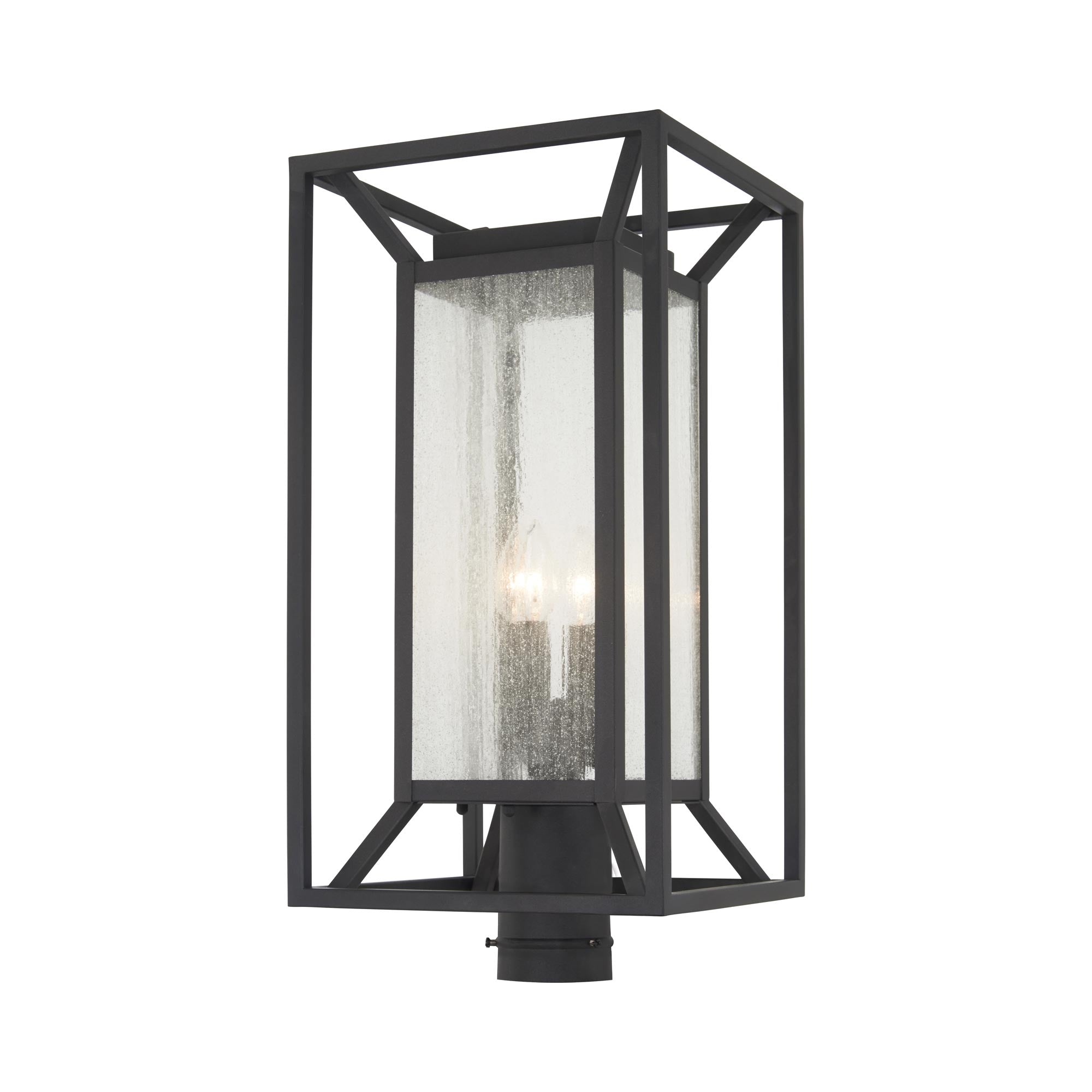 Harness the power of minimalism with a complex geometric design, adding an updated elegance to pathways and custom garden spaces. Fashioned of metal with a bold sand coal finish, the Harbor View Outdoor Post Light from The Great Outdoors creates an illusory puzzle using slender straight lines and angles. Clear seeded glass panels surround a boxy interior frame, softening the crisp motif of this classic fixture.