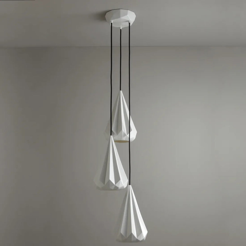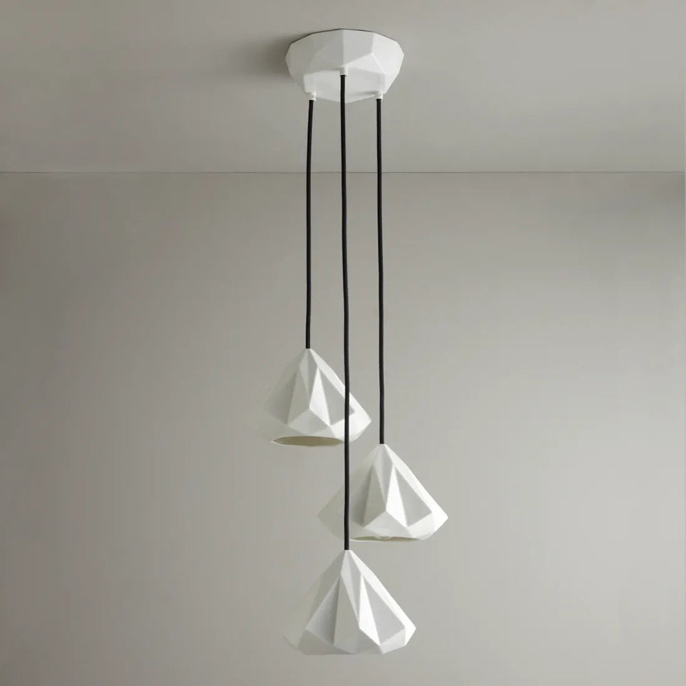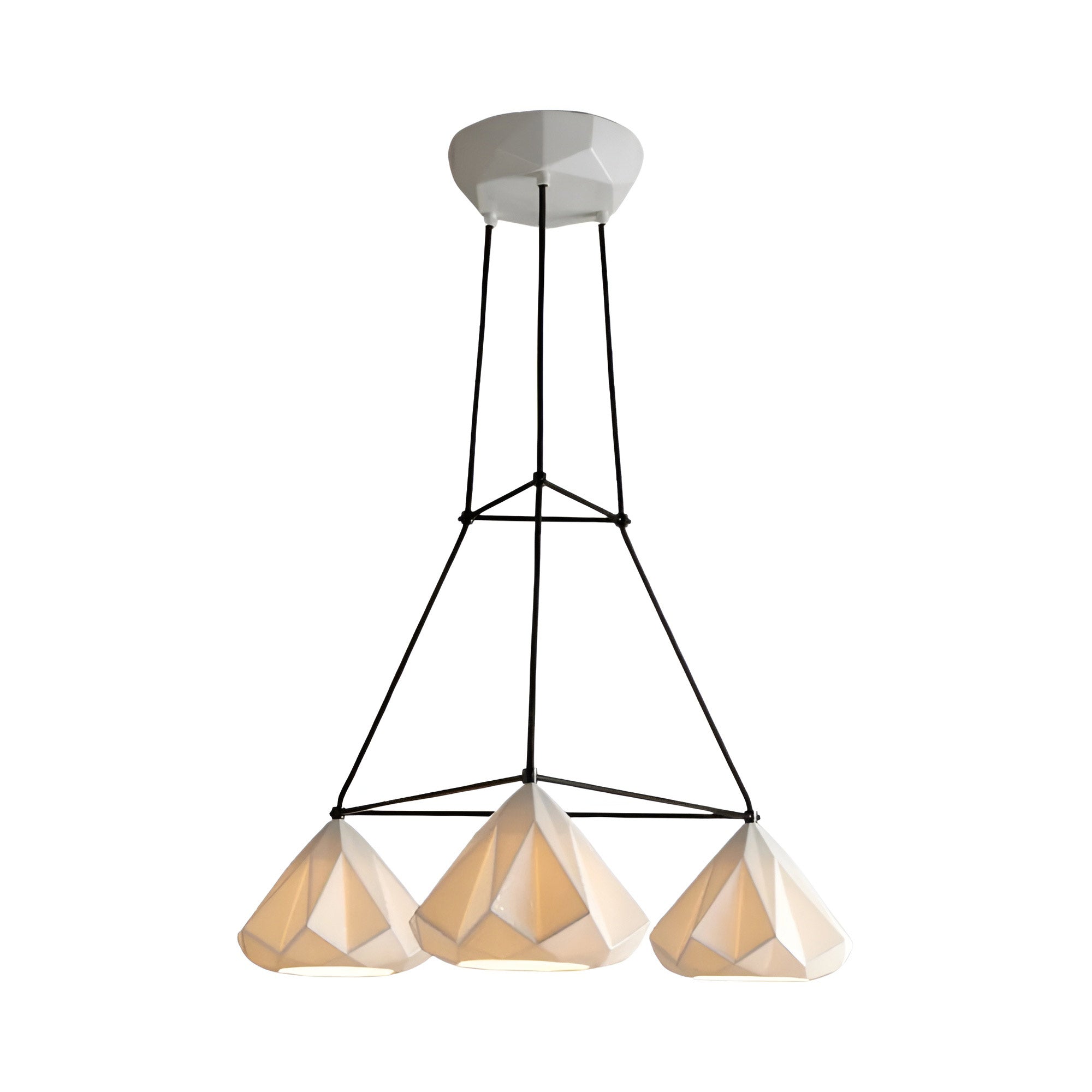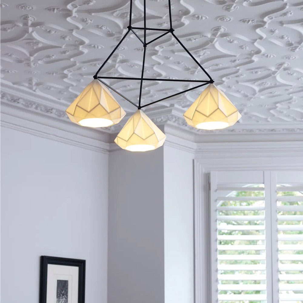 Delicate natural bone china revives an elegant ceramic vibe with the subtle charm of pottery as design inspiration as the Hatton Multi-Light Pendant Light from Original BTC adds versatile and sculptural elegance to a modern space. Ceramic natural white shades create a faceted gem motif as they glow with illumination over a dining ensemble or in a living room. Black suspension cables are bold and adjustable as they put customizing options in the hands of the beholder.
