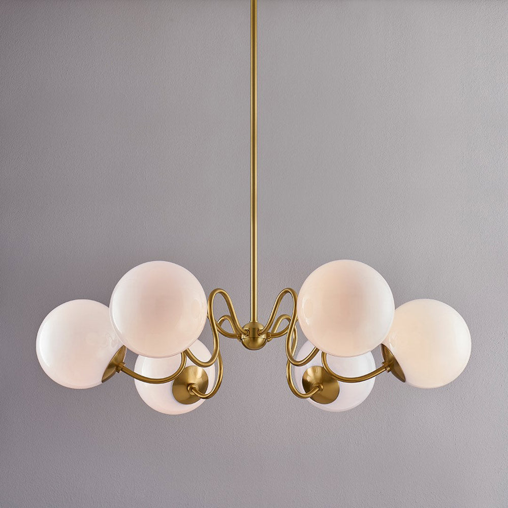 Delightful with a bit of decadence, the Havana Chandelier from Mitzi brings a new approach to lighting décor and a fresh supply of whimsy. A celebratory motif grabs attention as it offers opal glossy globe shades that emulate floating balloons, adding a sense of authentic lightness and sensibility. Gleaming metal framing adopts an auspicious and fun curvy semi-ribbon silhouette to put finishing touches on a light fixture that becomes a focal point.