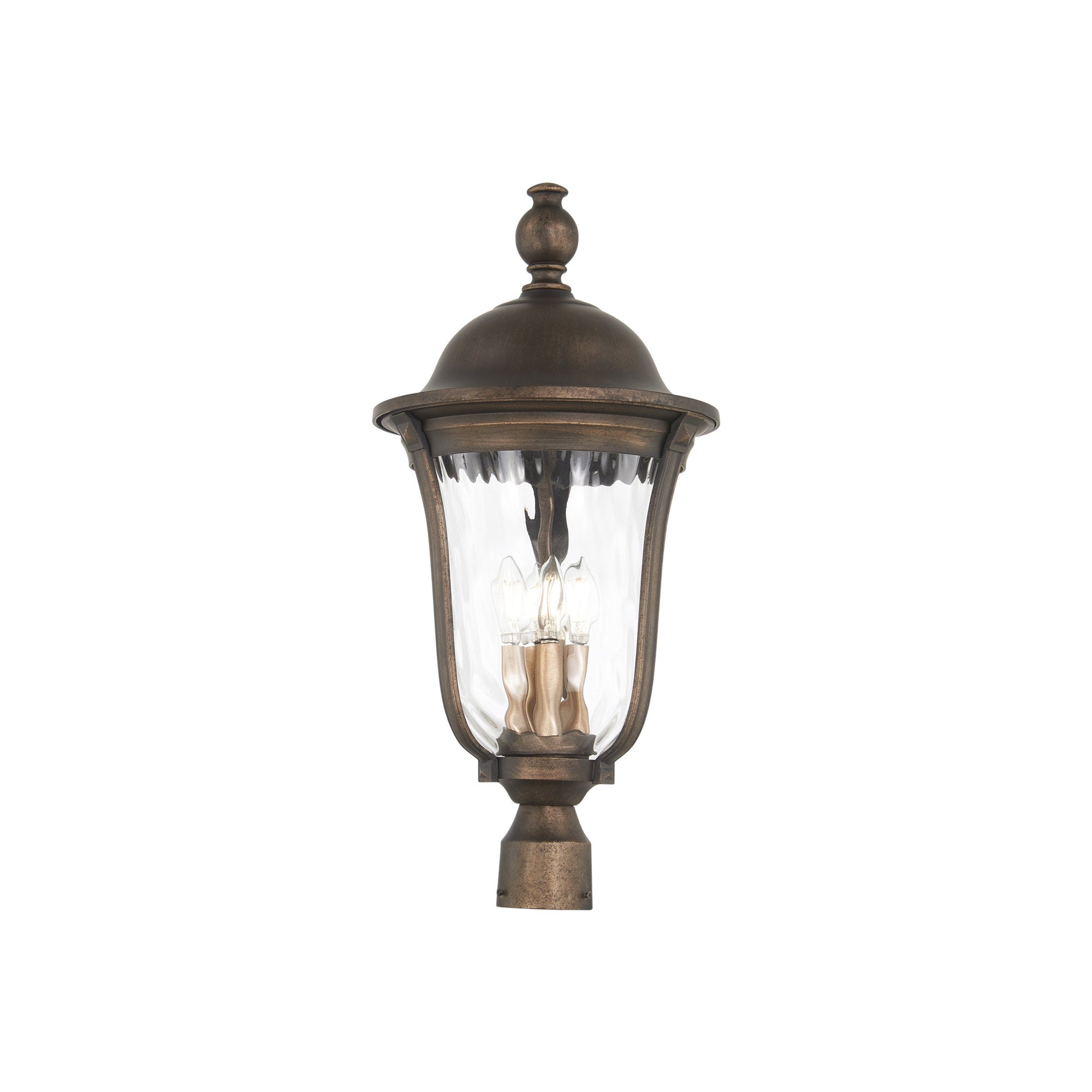 Bring the conventional interior glam look from light fixtures to an exterior space with a post light that transforms a custom garden space, manicured yard, or pleasing pathway. The Havenwood Outdoor Post Light from The Great Outdoors delivers exquisite beauty beginning with a lush Tauira bronze finish metal lantern-like frame dressed up with silver accents, creating an intriguing palette. Candelabra lights glow through the heady look of clear hammered glass, dialing up the level of romantic artistry.