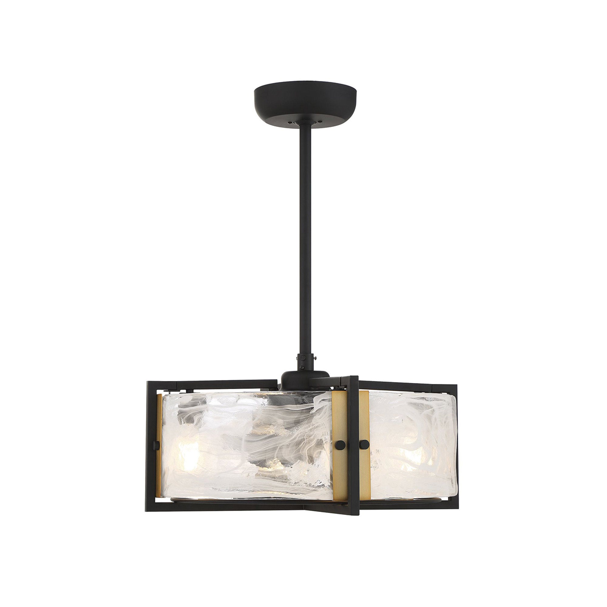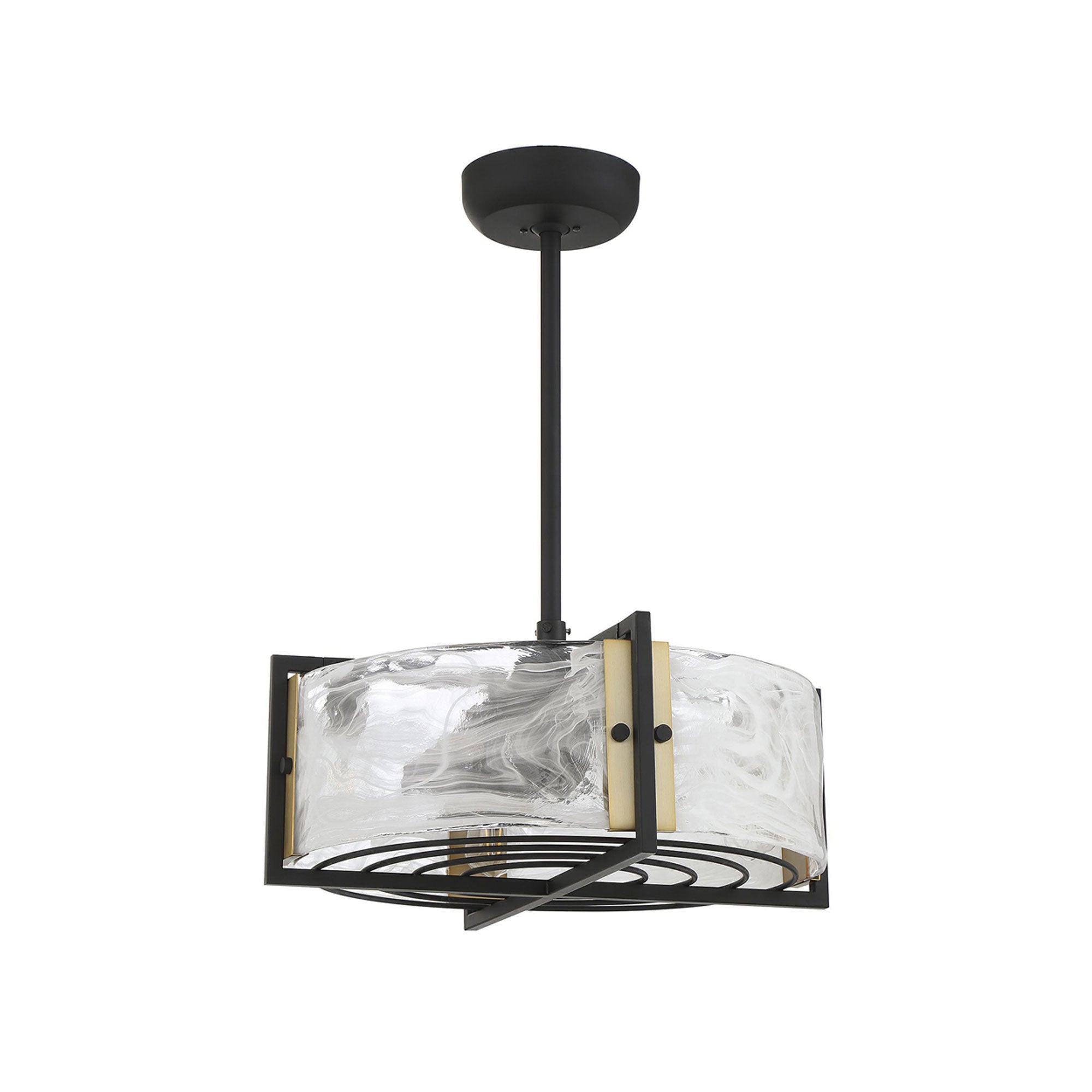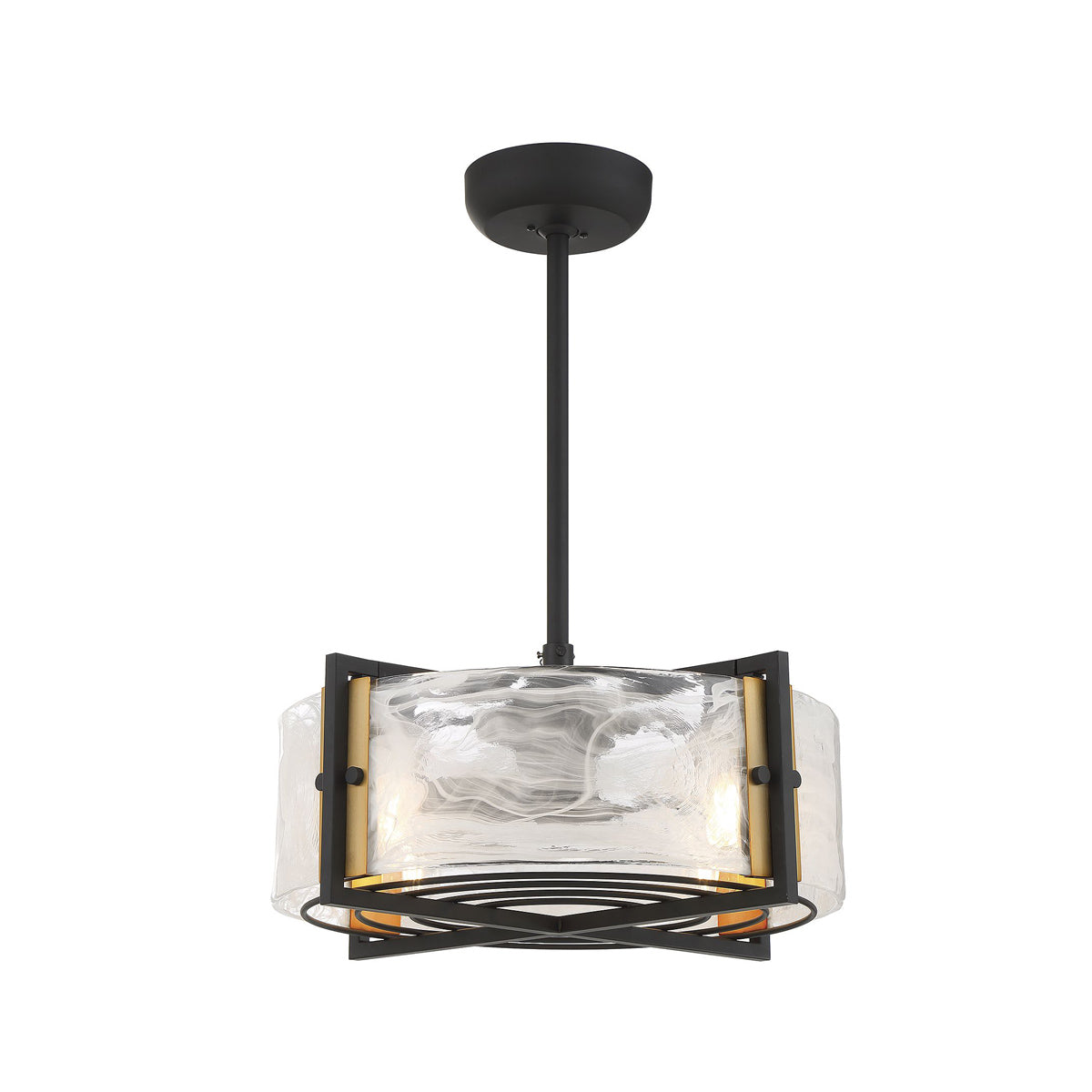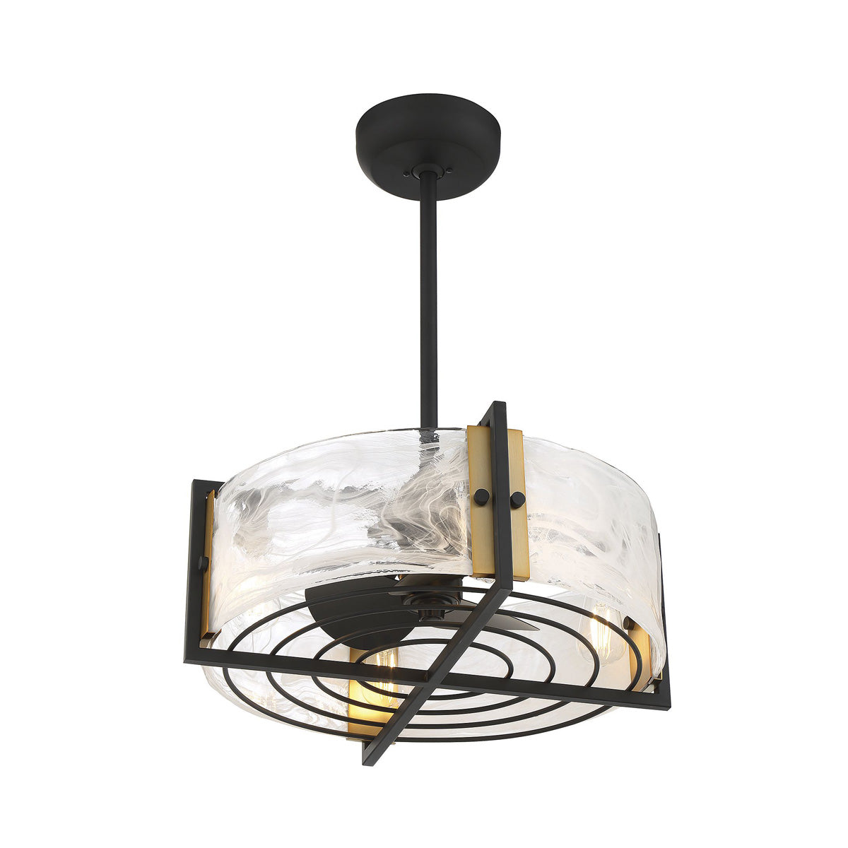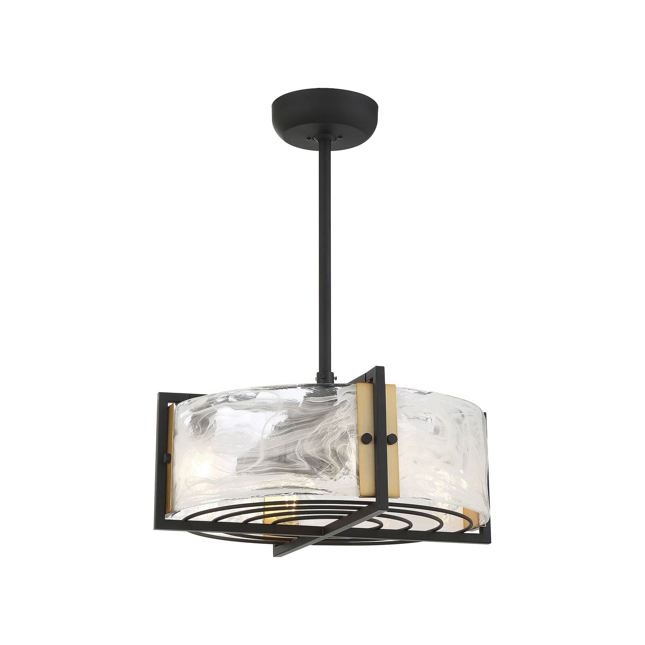 Ambitious style works from both industrial and glam artistry perspectives as the Hayward Fan D'Lier from Savoy House offers a truly different look in interior design. A combination of air circulation and glam style adds an immediate benefit to modern and transitional settings. Embrace bold matte black finish geometric framing dressed up with warm brass accents, and a decadent strie piastre glass circular shade gathering every element together and presenting a striking fixture.