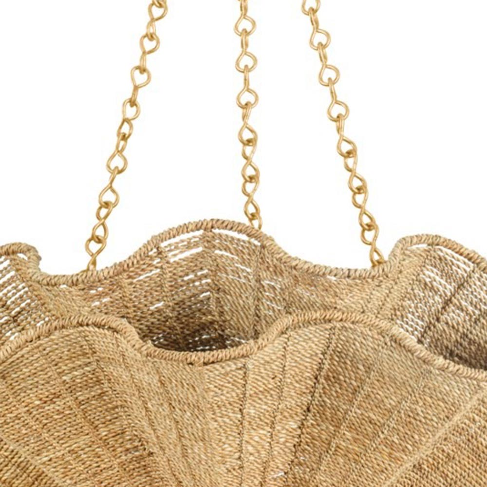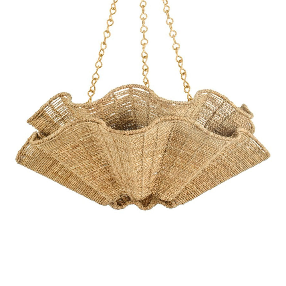 Captivating artistry brings coastal and natural motifs into a new sphere with a fixture that makes a clear statement. A clamshell silhouette blends two large shaves in the Hayworth Chandelier from Hudson Valley Lighting, both woven from Abaca rope with a neutral tone. A tri-part chain link suspension and canopy show off warm brilliance as a bit of contrasting style.