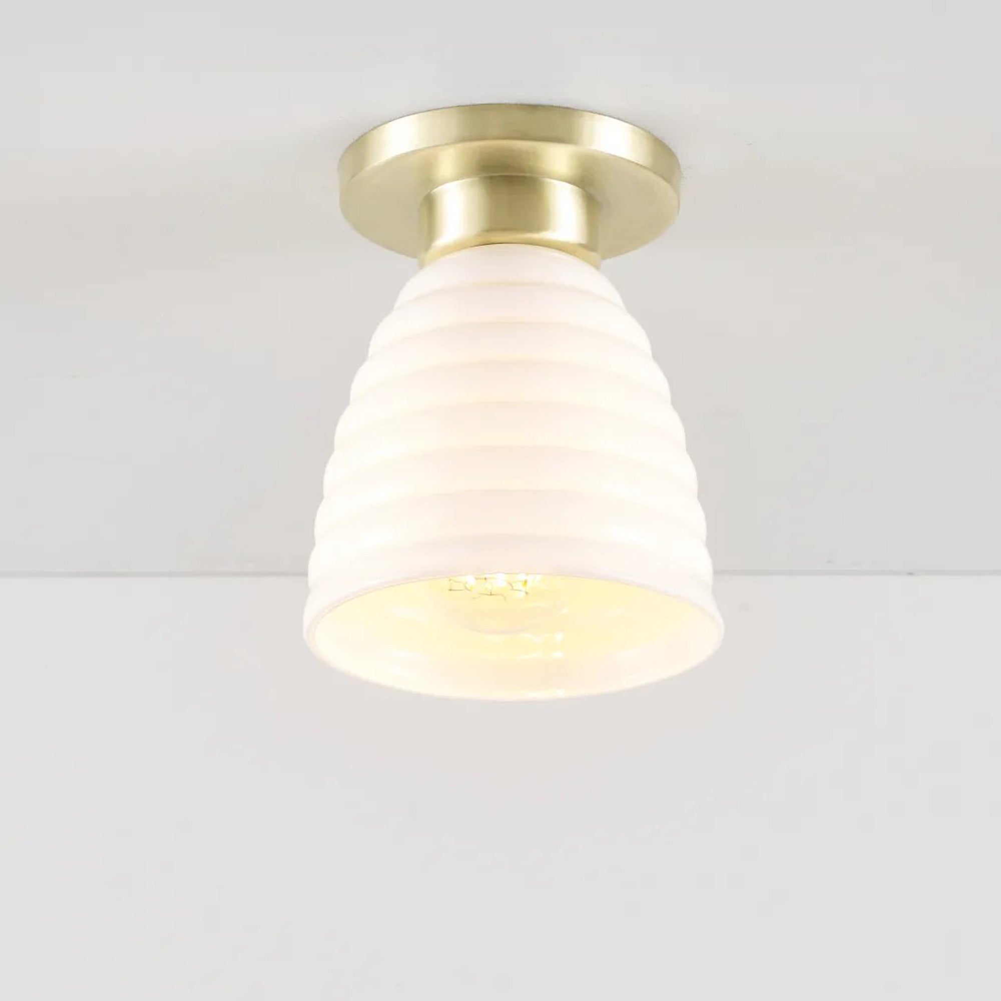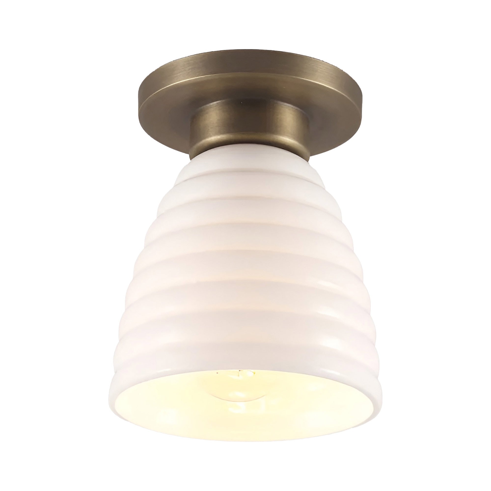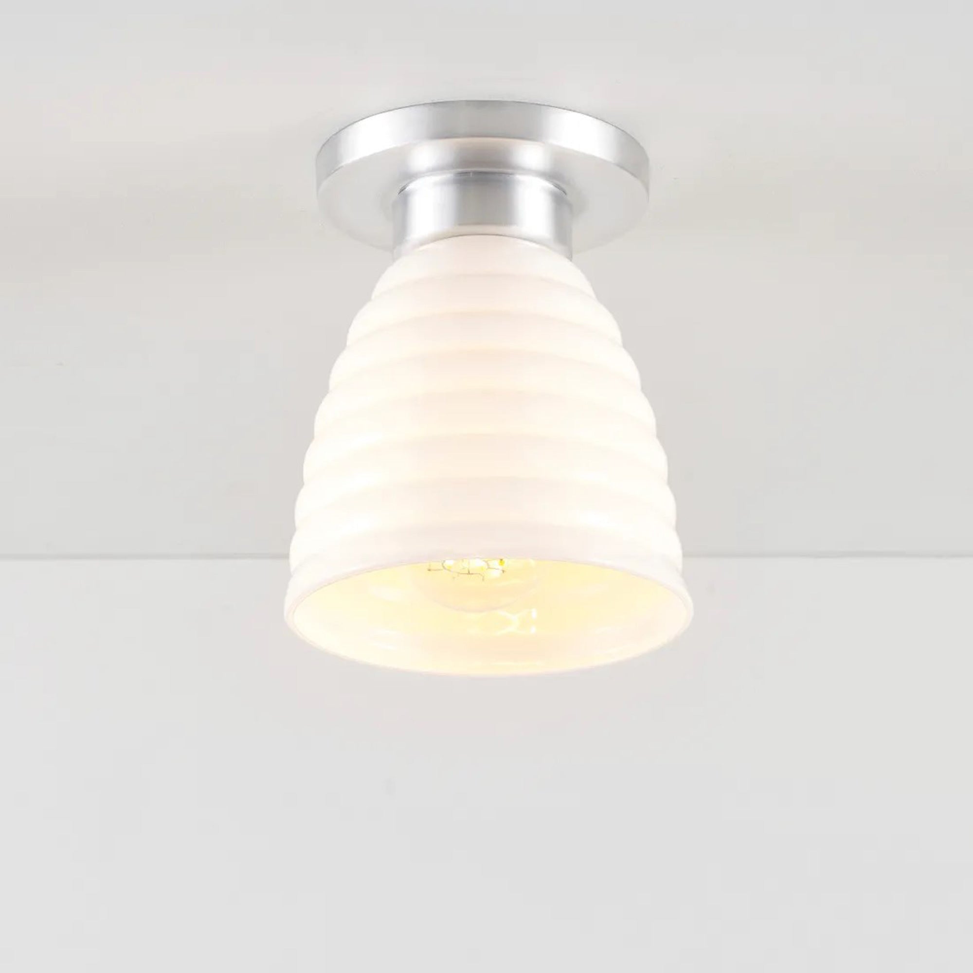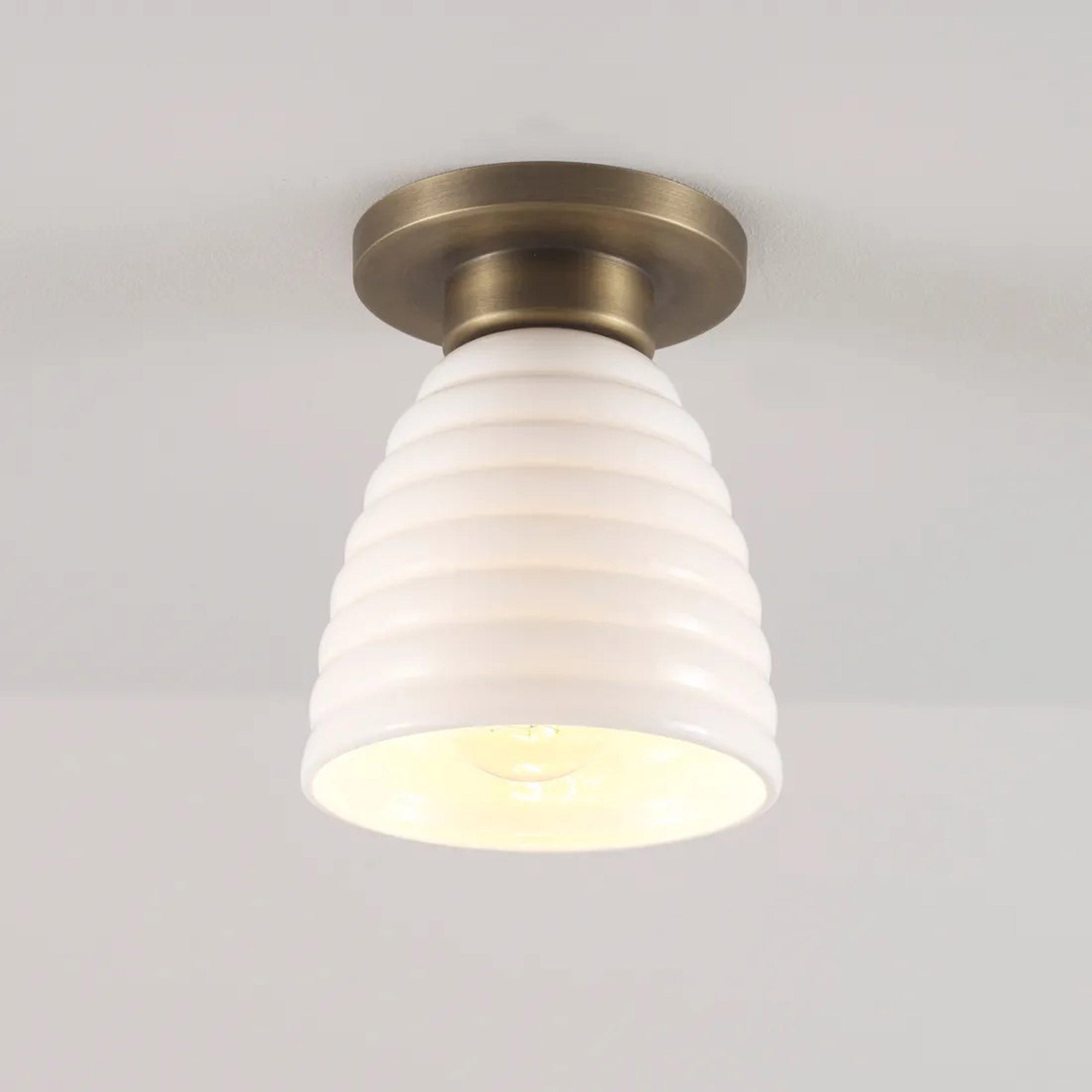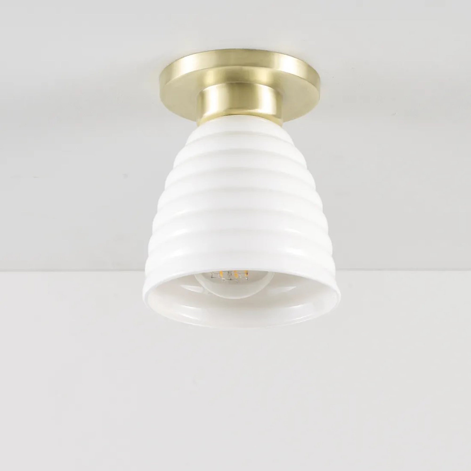 Delightful and timeless ceramic creates an artisanal organic motif as the Hector Bibendum Flush Mount Ceiling Light from Original BTC shows off a tempting avenue to soft illumination. Shapely metal framing of a tiered canopy complements the long dome silhouette of a natural bone china shade with textural ribbing. This smooth blend translates to a pristine aesthetic with no shortage of versatility.