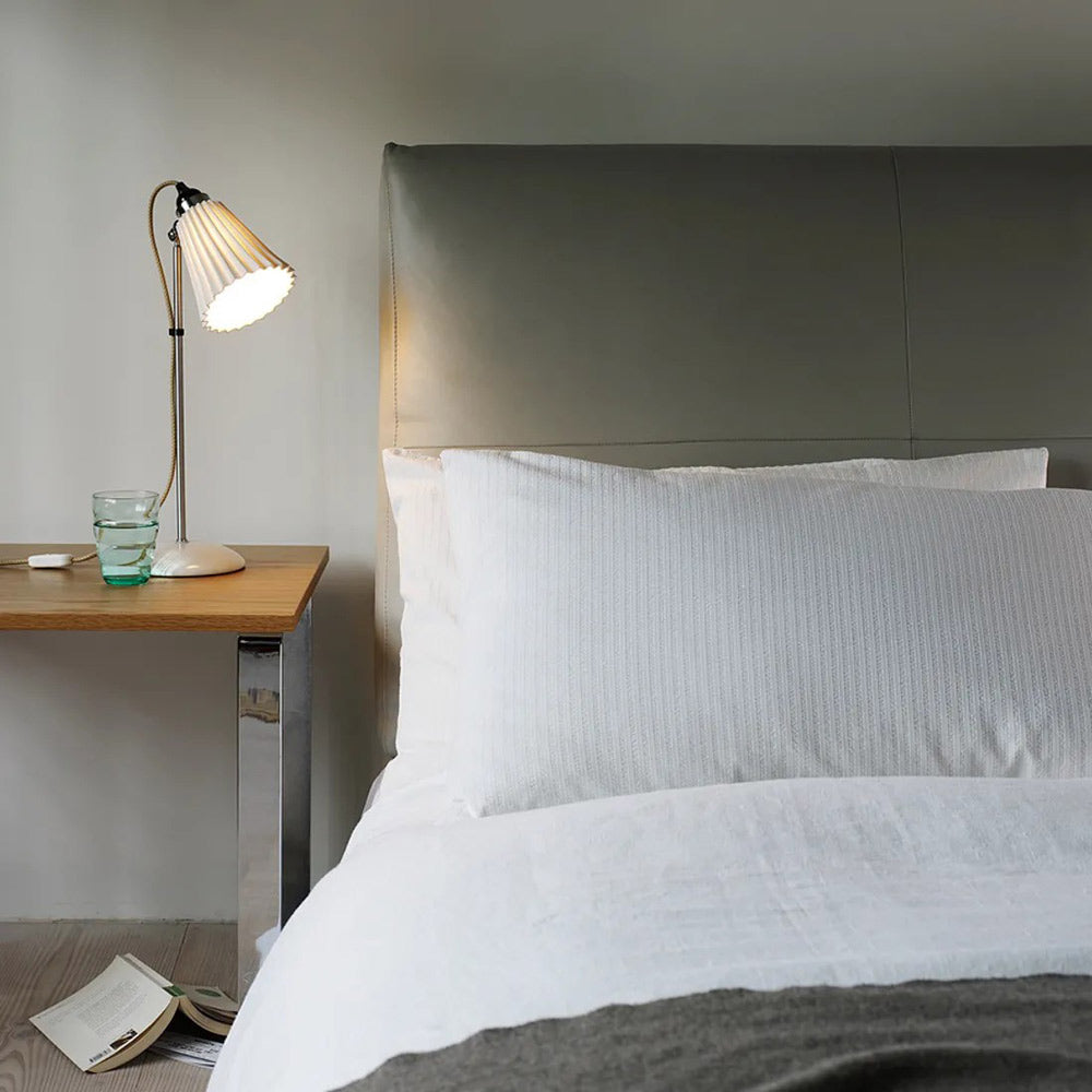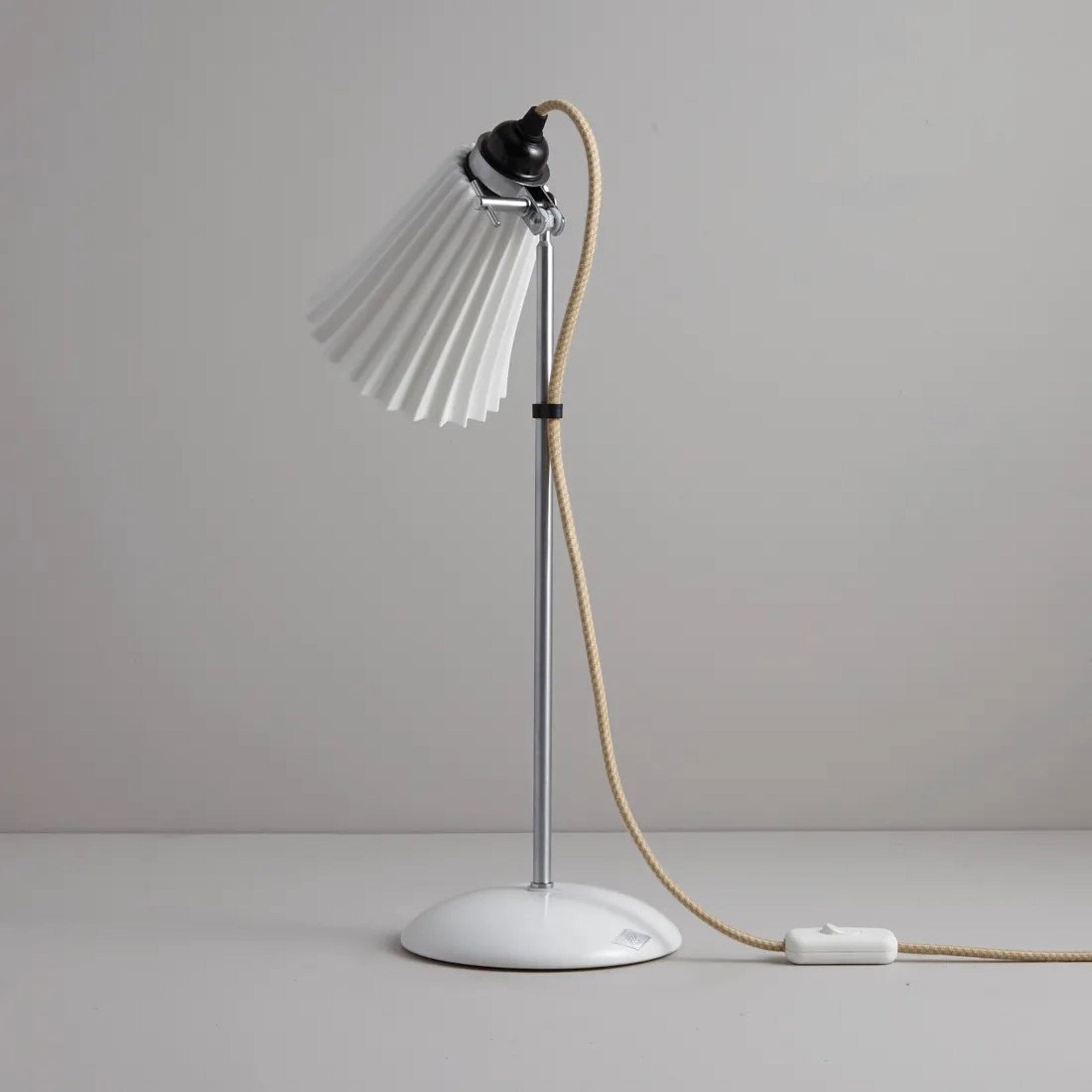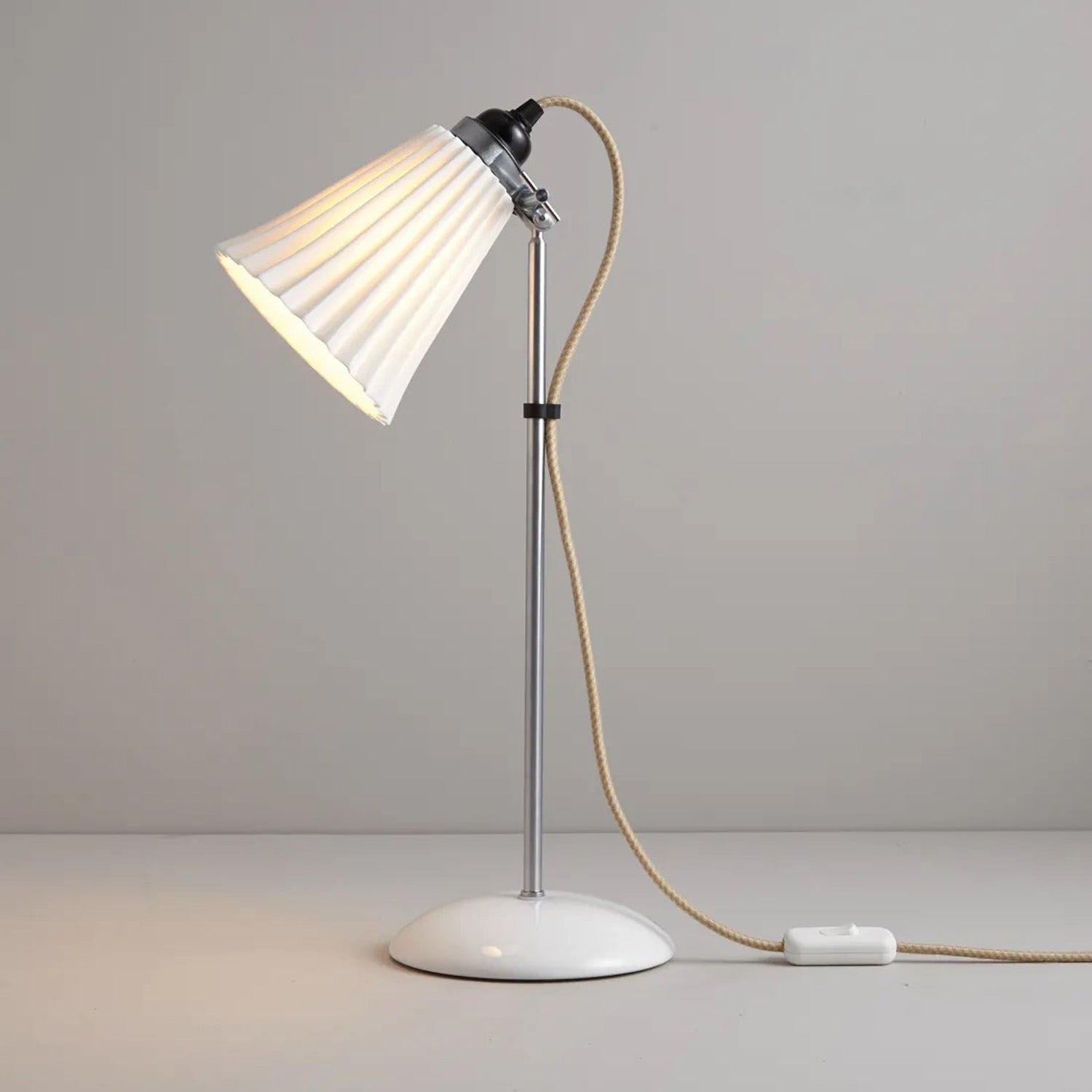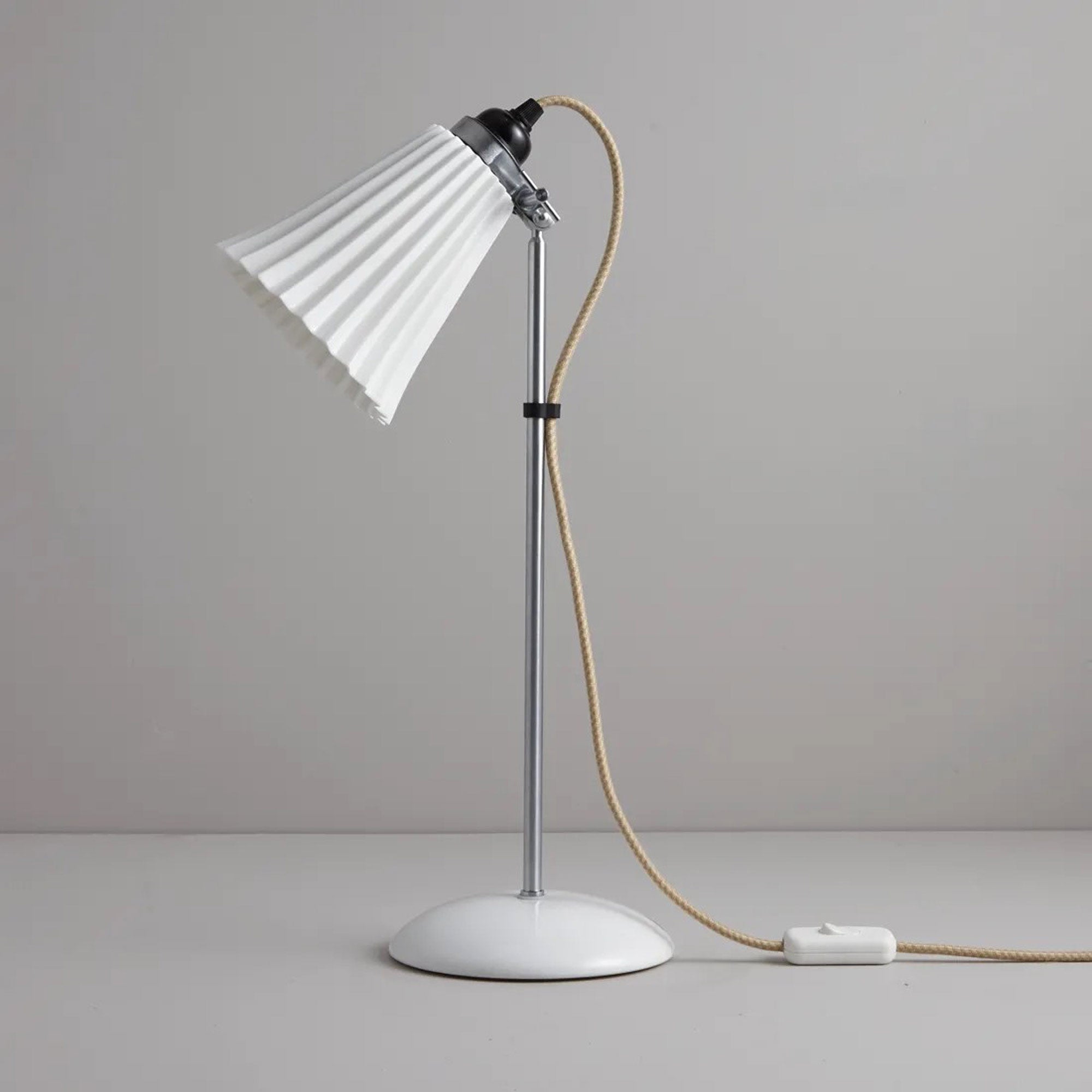 The Hector Pleat Table Lamp from Original BTC magnifies the classic presentation of mixed motifs and sends soft, glowing light at precise angles. Adjustability of metal framing impacts a smooth, pleated natural white bone shade, the artisan part of a studio-inspired design.
