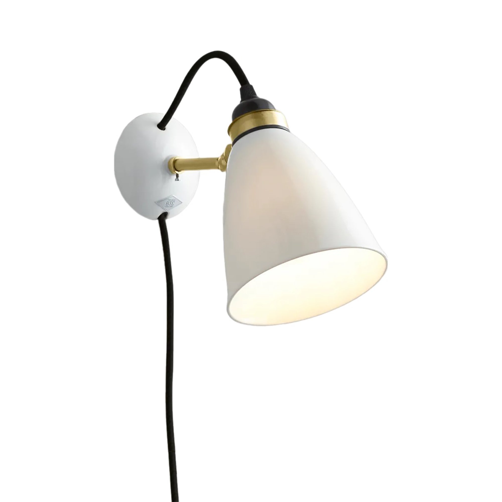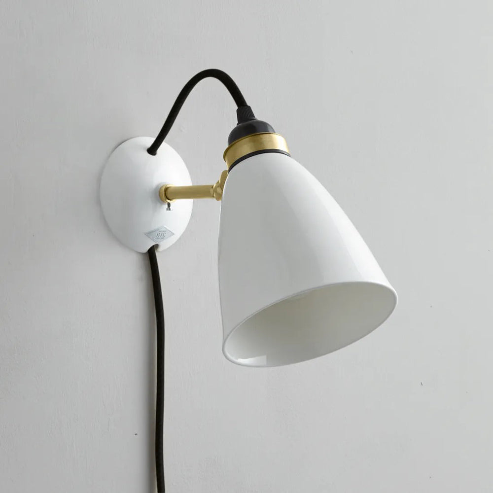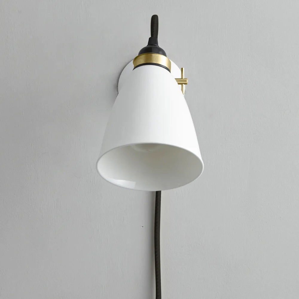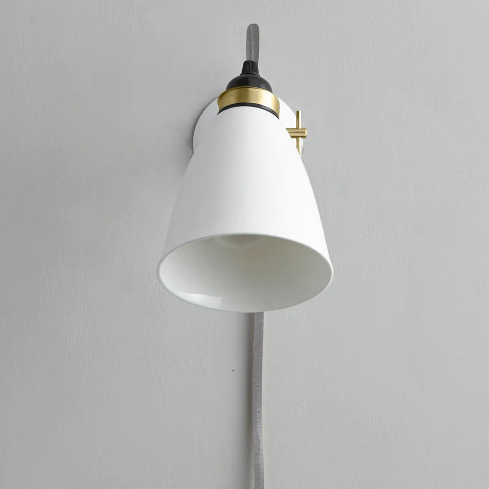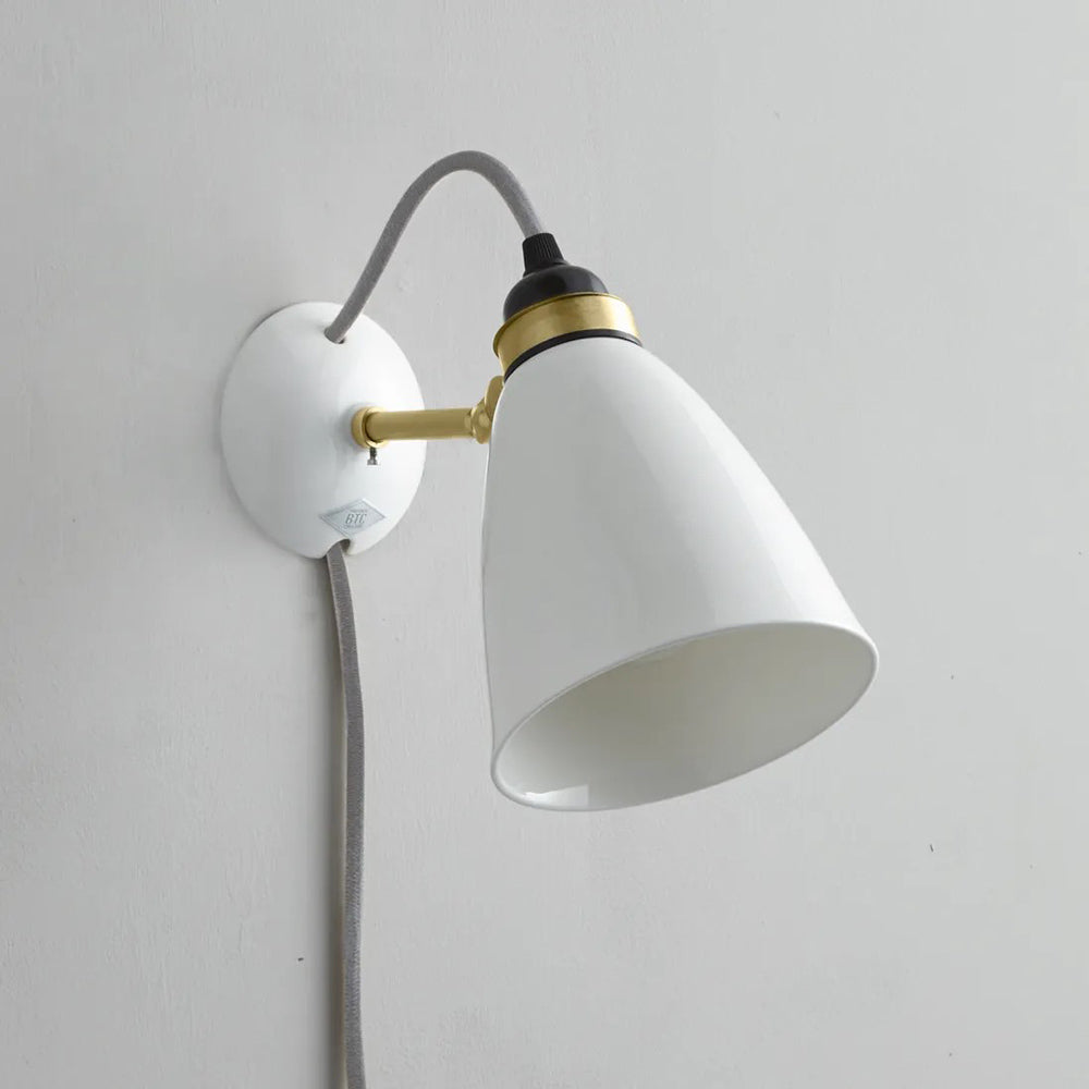 The Hector Plug-In Wall Light from Original BTC takes a basic studio motif and embellishes it with delicate ceramic and contrasting palette impacts. Smooth natural white bone china fashions a dome shade and wall mount that threads cotton cabling and avoids clutter. Metal accents include an adjustability element allowing for targeted lighting.