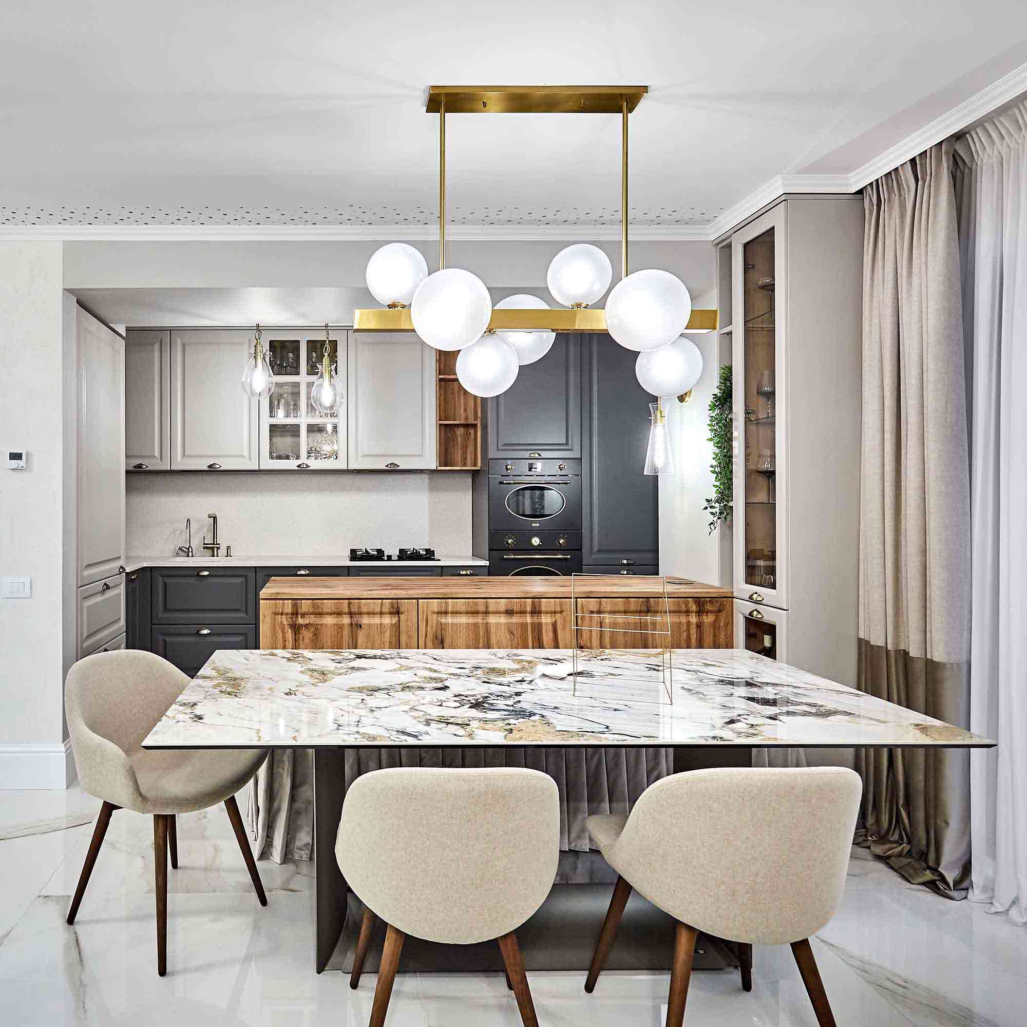 Globe shades in multiple sizes create the illusion of effervescent bubbles for the Hinsdale Linear Pendant Light from Hudson Valley Lighting.