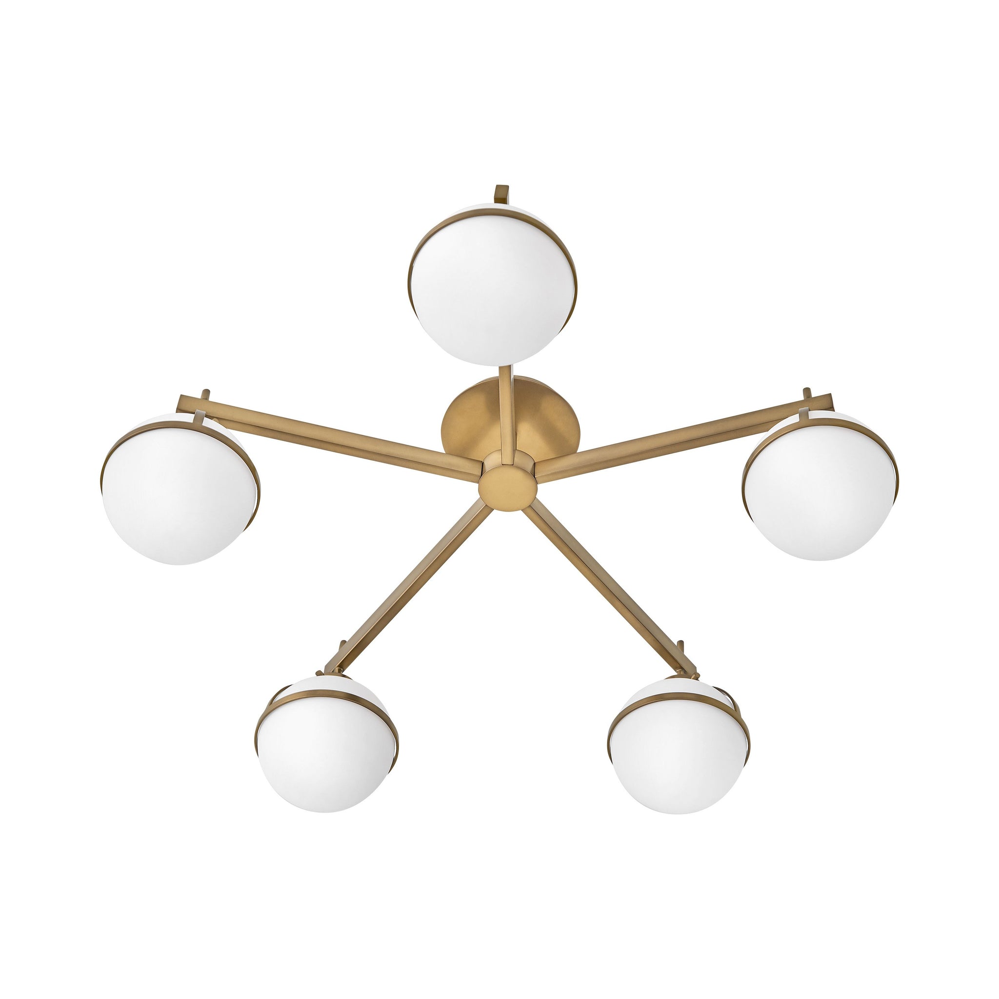 The distinctive vintage globe design of Hollis invokes a mid-century mood; yet its clean lines and sophisticated silhouette provide versatility for a variety of decors. The extra-large semi-flush provides superior lighting for rooms with lower ceilings. Etched opal glass globes shine against a Heritage Brass or a Black finish.