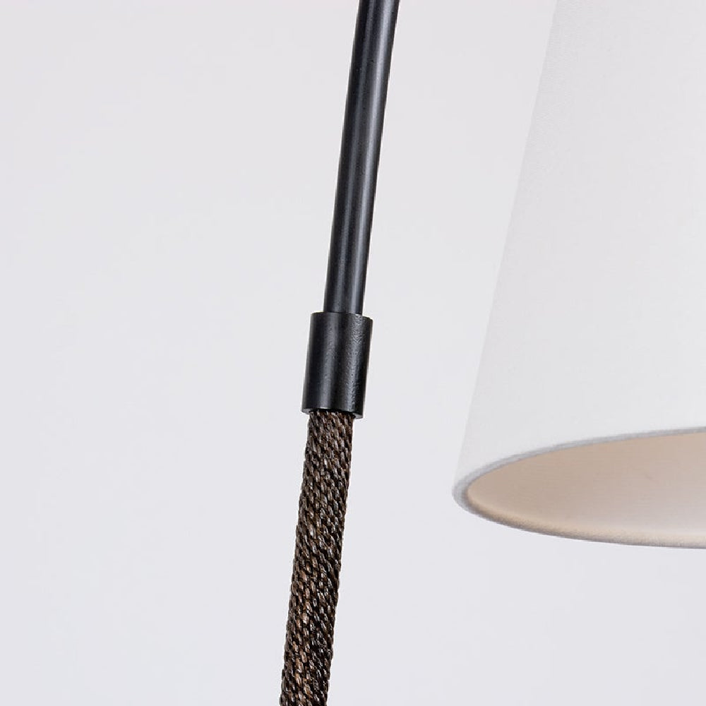 Fluidity and sharp contrast meet in the middle to deliver a notable light source that lifts the mood in a modern setting. A pronounced forged iron finish stem tilts subtly into a hook as the Holliston Floor Lamp from Troy Lighting, shaping a visually divine silhouette and cupping a classic white linen shade. The surprise element of dyed alpaca rope introduces an exotic flavor to this sculptural lamp, adding a sense of textured calm.