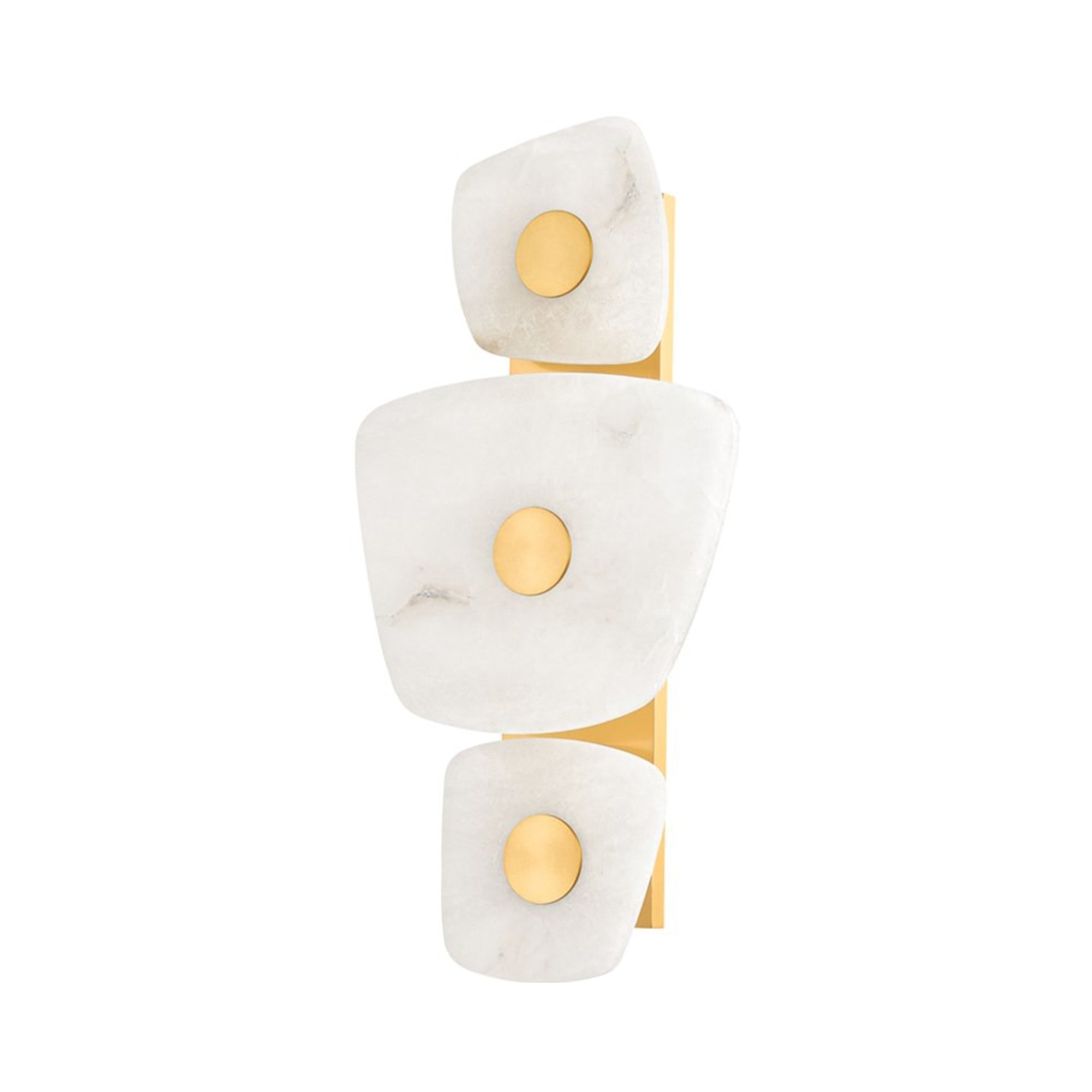 The ultimate blend of Art Deco and chic glam stands out in the design of a classic fixture. The Holmdel LED Wall Light from Hudson Valley Lighting elicits captivating optical attention with its mix of Art Deco and sheer exquisite style, as natural alabaster discs with creative silhouetting align over an aged brass frame, secured with matching accents. Energy-efficient illumination glows through discs, each appearing slightly varied due to the use of natural materials.