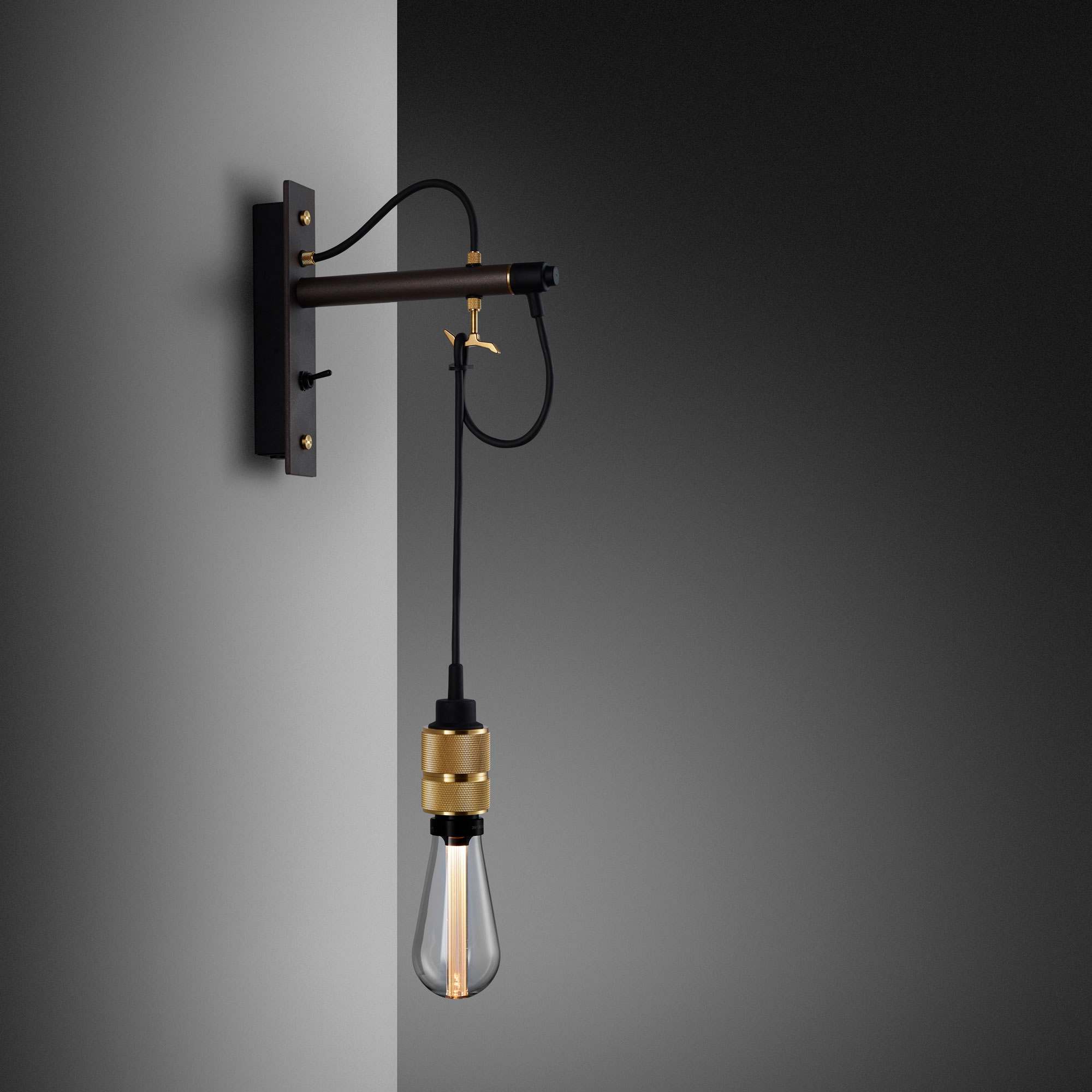 Repurpose the romantic look of industrial farmhouse lore with the Hooked Nude Wall Light from Buster + Punch. Its busy design motif features metal framing with a casually looped suspension cord dangling an exposed bulb adjustable to accommodate a custom height. This fixture hits the feel of a low-key style motif with flexibility.