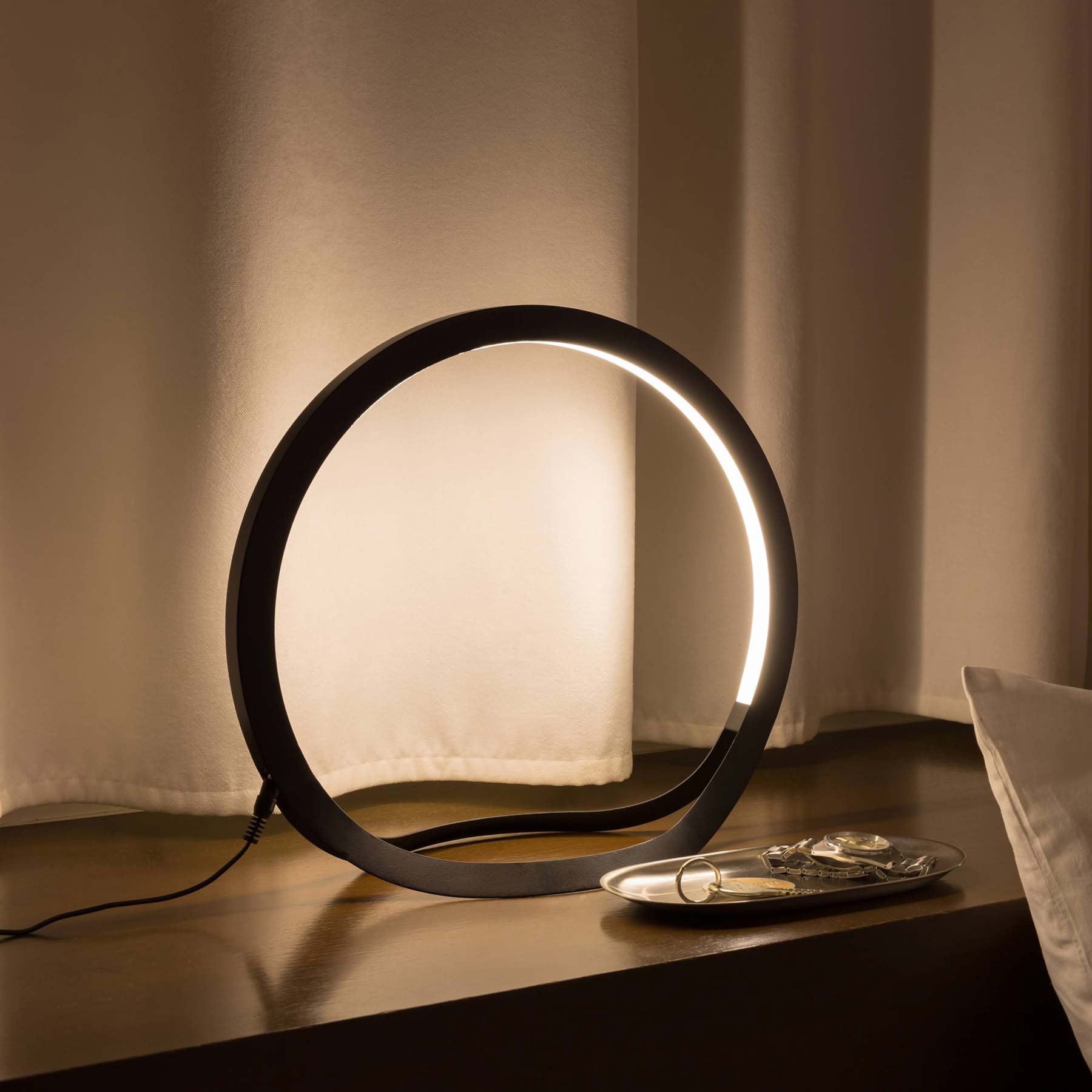 Representing the circle of life in a low-key aesthetic, the Hoop LED Table Lamp from Y.S.M simplifies a design-forward look in energy-efficient lighting. Sculptural silhouetting with an openwork frame delivers devout transparency as this charming lamp and its delicate aesthetic bring surprising design power in a living room or bedrooms.
