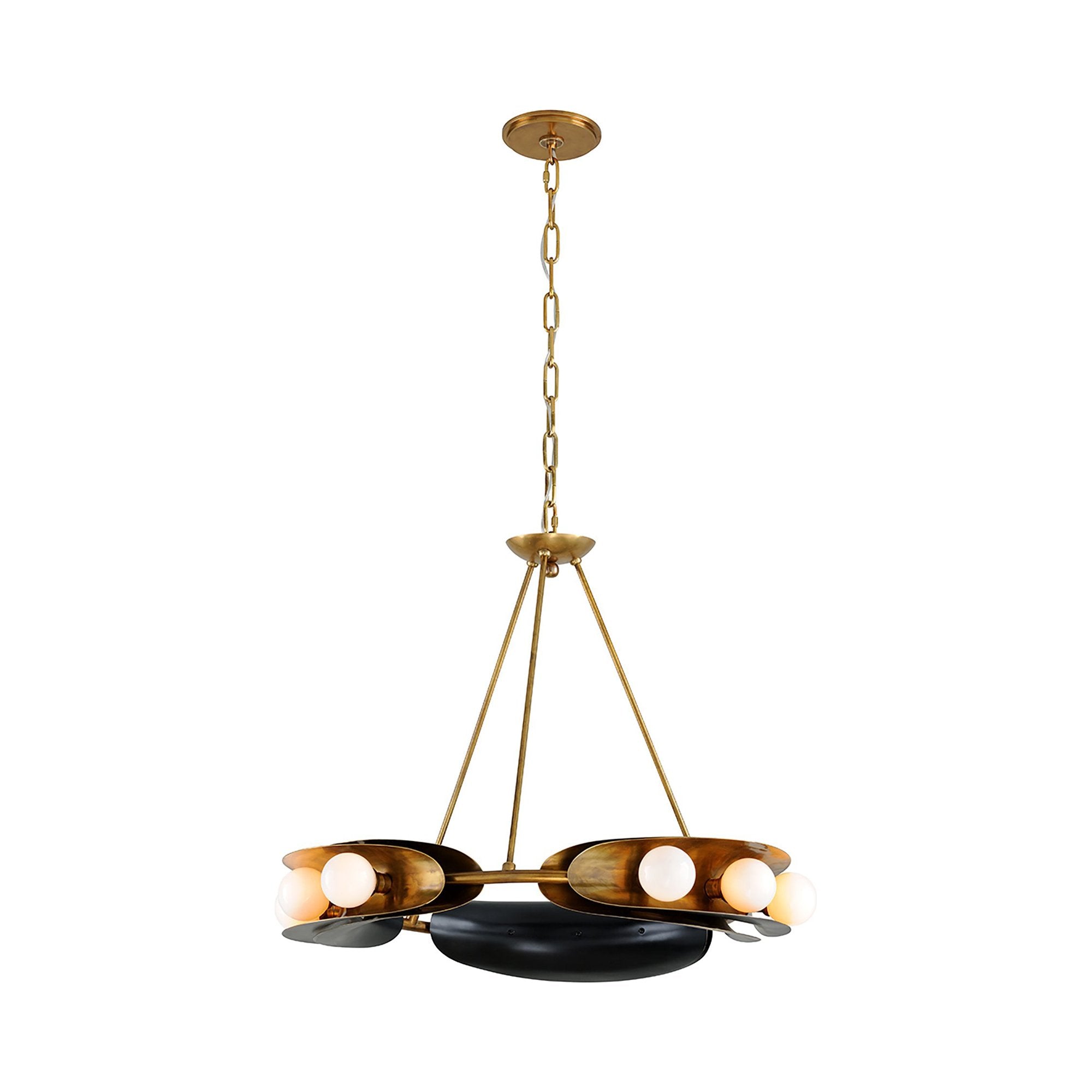 Borrowing from a retro aviation design motif, the Hopper Chandelier from Corbett Lighting delivers bold style and a cool blend of rustic finishes that highlight opal white glass orb shades.