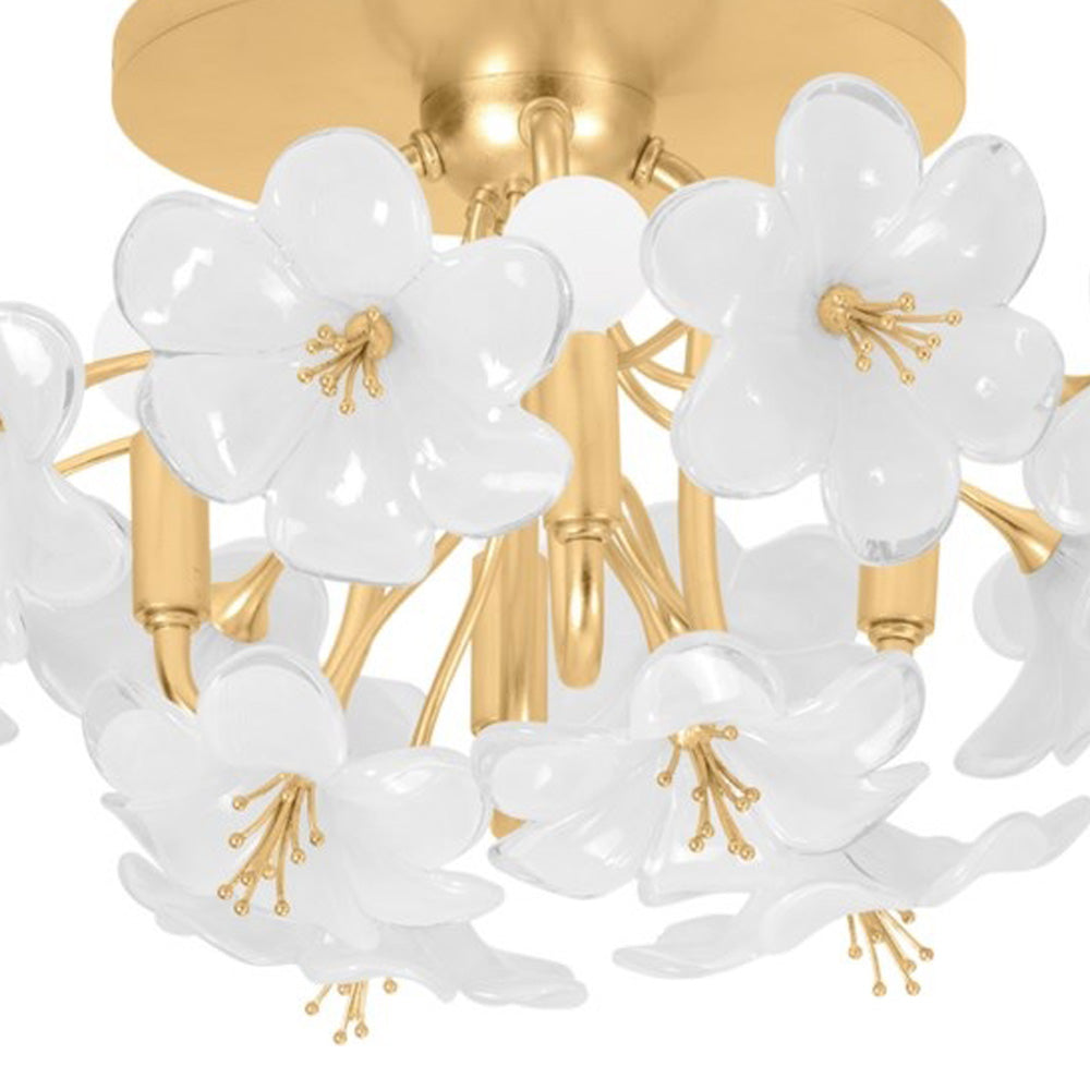 Inspired by the delicacy of the clouds and elegance of a summer garden, the Hygea Semi-Flush Mount Ceiling Light from Corbett Lighting creates an elegant but earthy centerpiece over a bedroom or breakfast nook. Smooth, glossy white glass flowers are dotted with gold leaf centers and reside on matching stems, creating contrasting warmth and character that brings impressive balance and harmony to a stunning light fixture.
