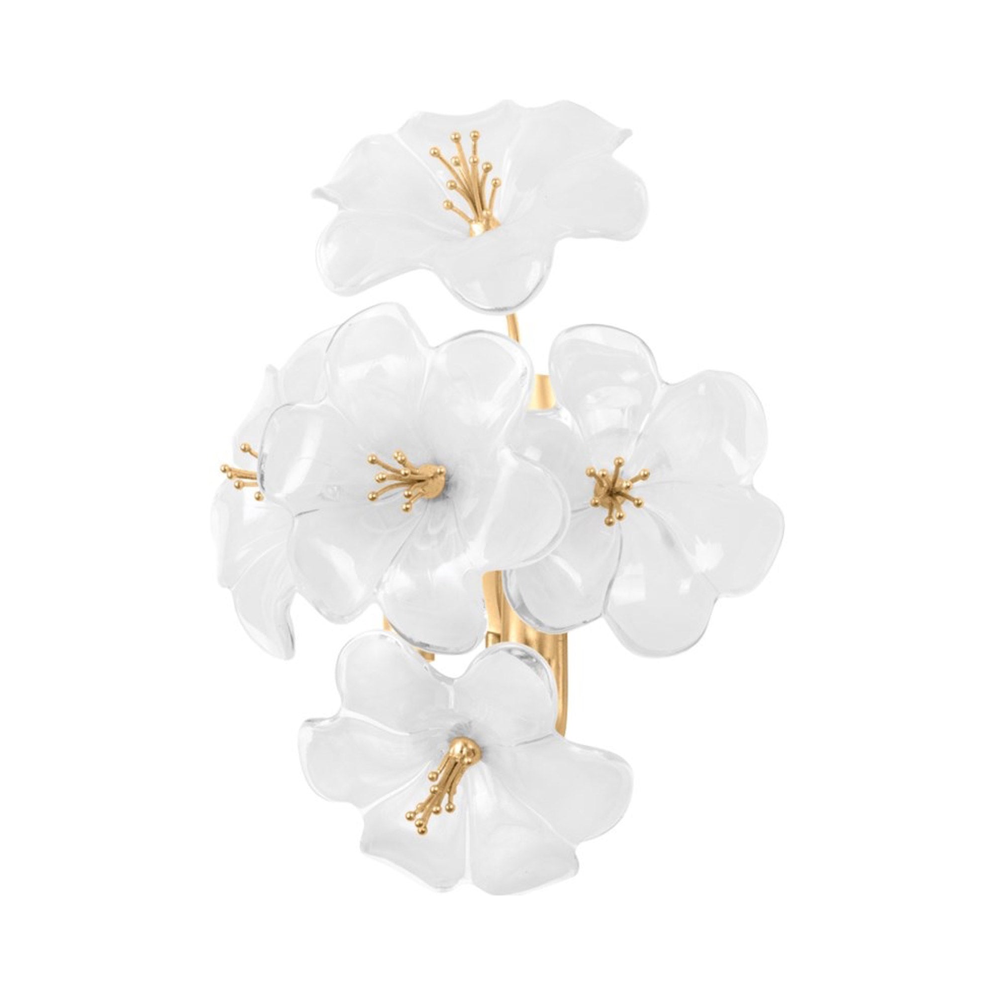 Fluffy cotton candy clouds and delicate florals create a striking blend of design inspirations for the Hygea Wall Light from Corbett Lighting. Romantic and elegant, it's a compelling spray of smooth white glass flowers intermingled with gold leaf stems and centers that create warmth and dimension. It's a stunning choice over a nightstand in the bedroom or gracing a cozy, refined reading nook in your den.