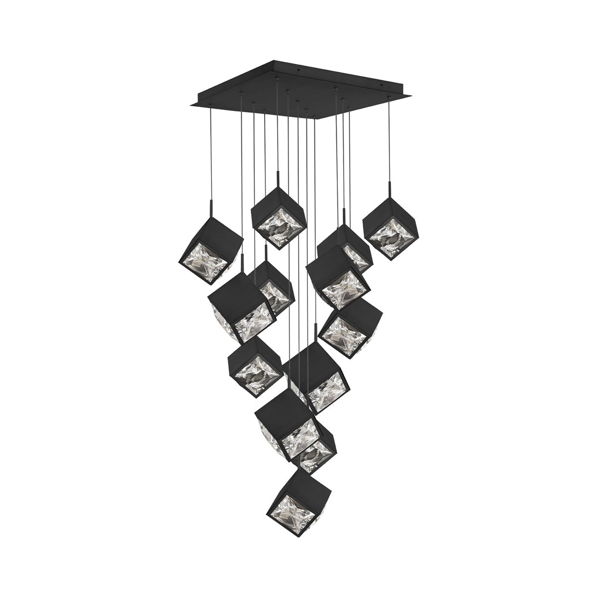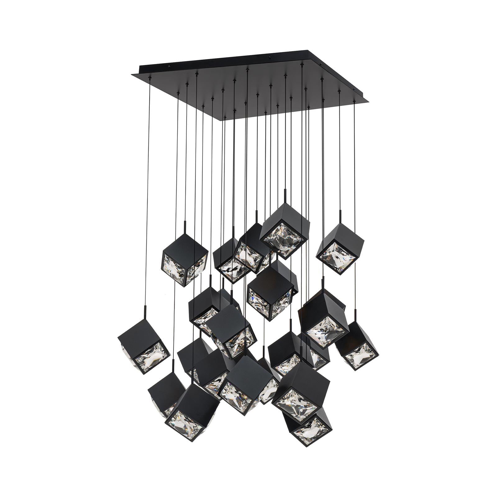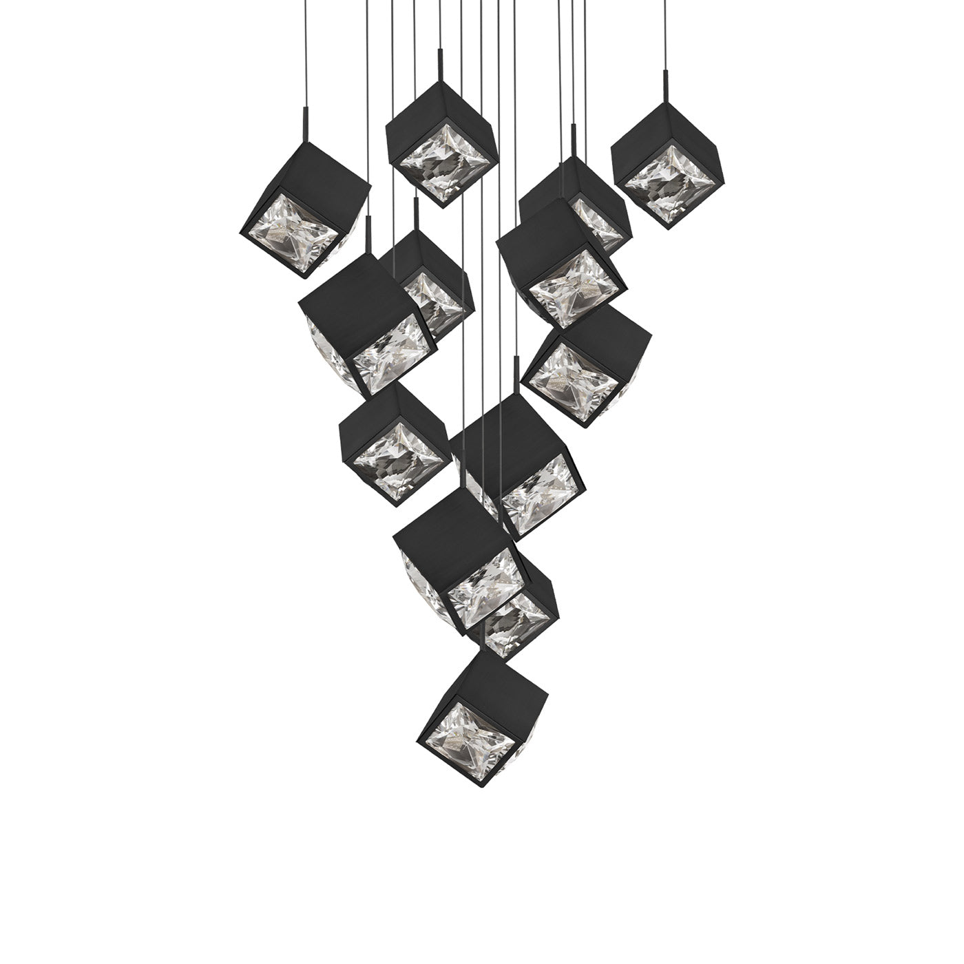 The Ice Cube Square LED Multi Pendant Light from dweLED turns conventional design on its head to fashion an artisan piece of its own. Dangling steel cubes descend from a square canopy, nestling K9 crystal diffusers filtering energy-efficient illumination pointing in multiple directions. This fixture is customizable to lend creative license for individual interior designers.