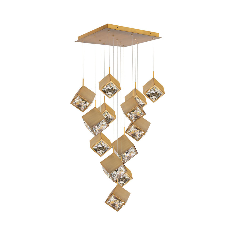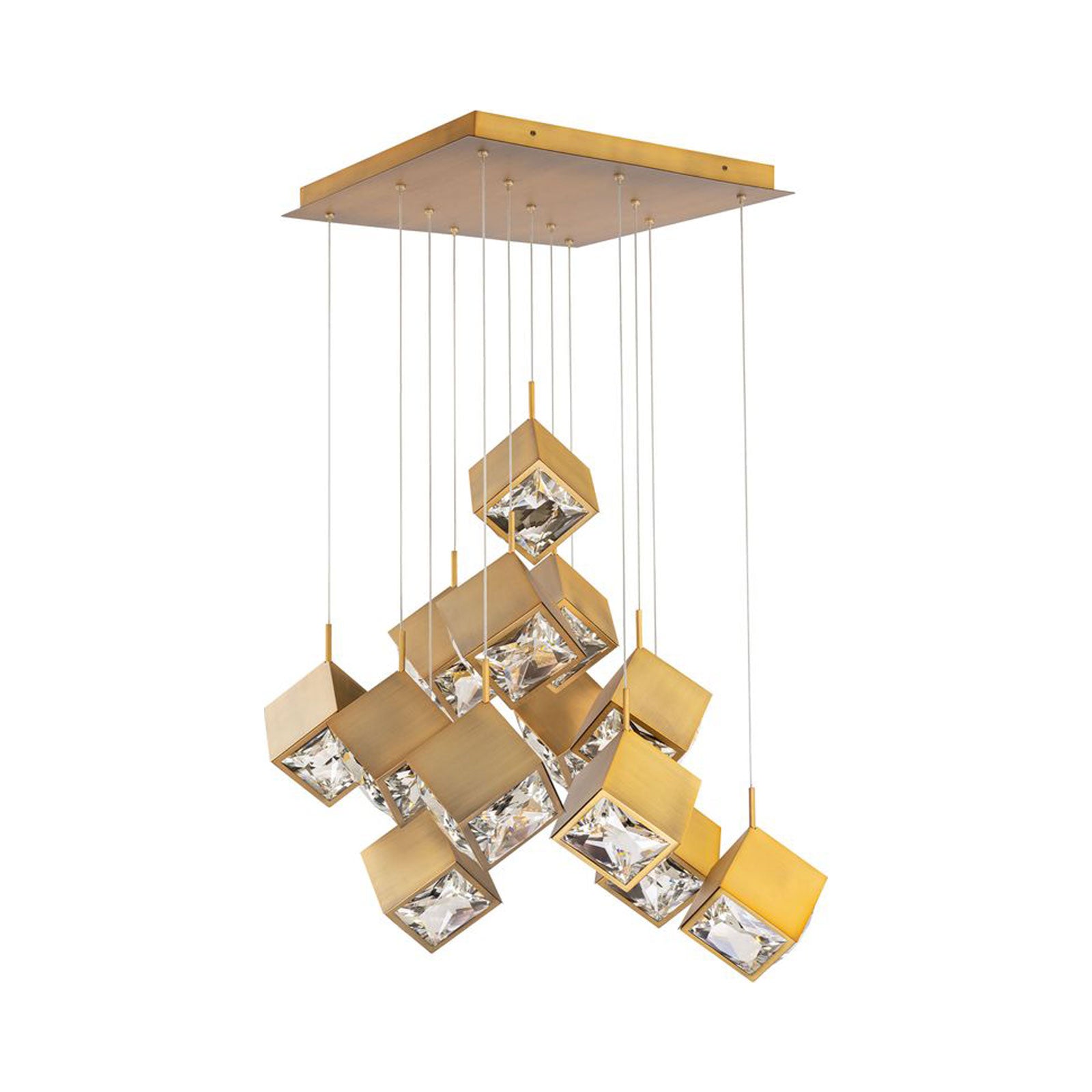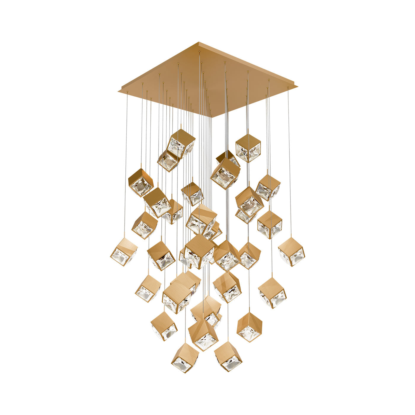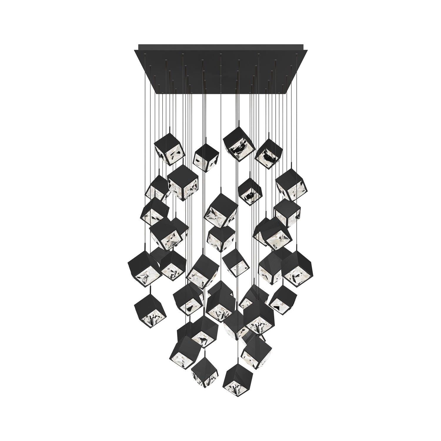 The Ice Cube Square LED Multi Pendant Light from dweLED turns conventional design on its head to fashion an artisan piece of its own. Dangling steel cubes descend from a square canopy, nestling K9 crystal diffusers filtering energy-efficient illumination pointing in multiple directions. This fixture is customizable to lend creative license for individual interior designers.