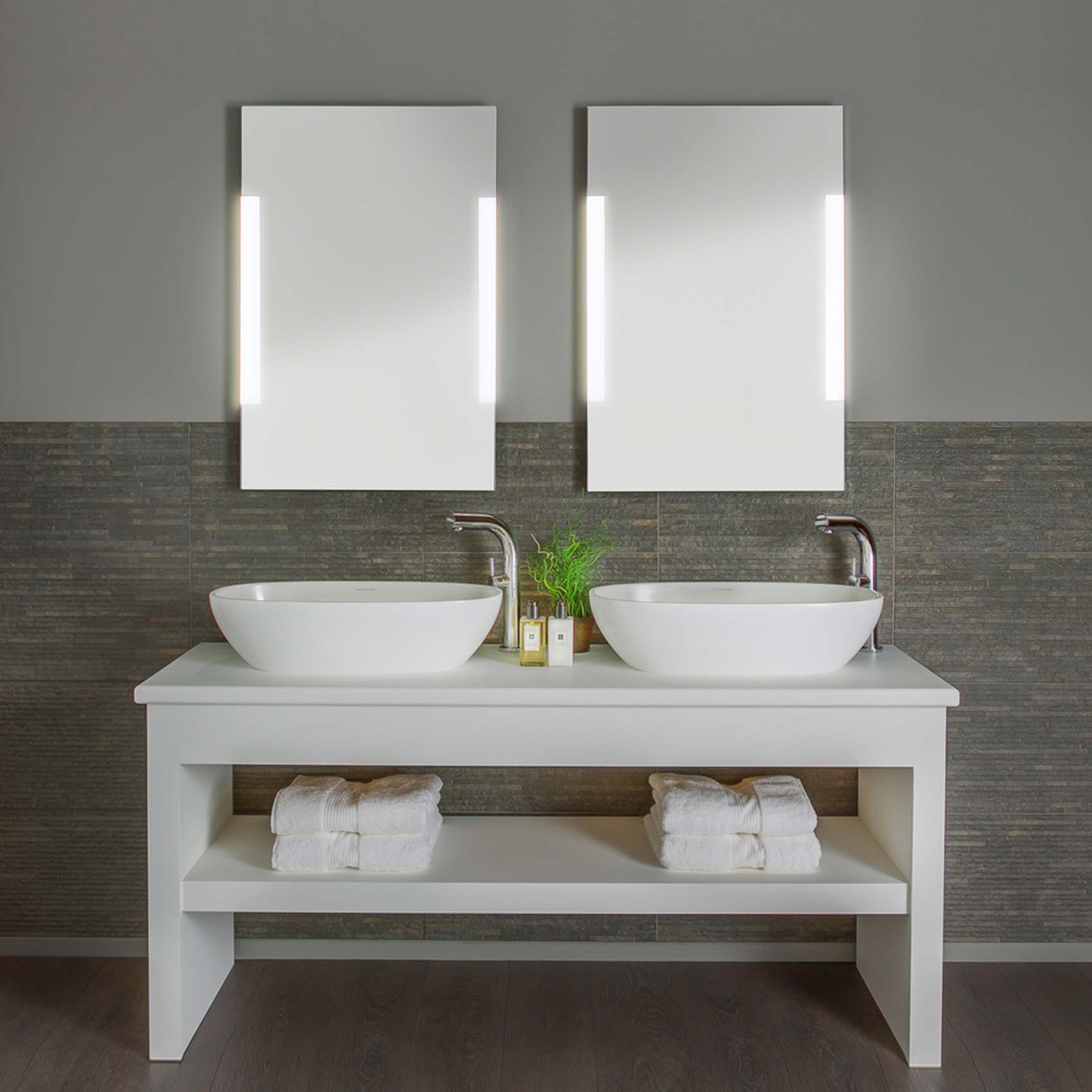 Indulgent contemporary elegance defines the design scheme producing a fresh update to modern bath spaces. Choose the Imola LED Illuminated Mirror from Astro Lighting to incorporate illumination with mirror functionality, adding a utilitarian component to décor. Integrated LED lighting offers energy-saving benefits, complementing the gleaming aesthetic of a rectangular mirror.