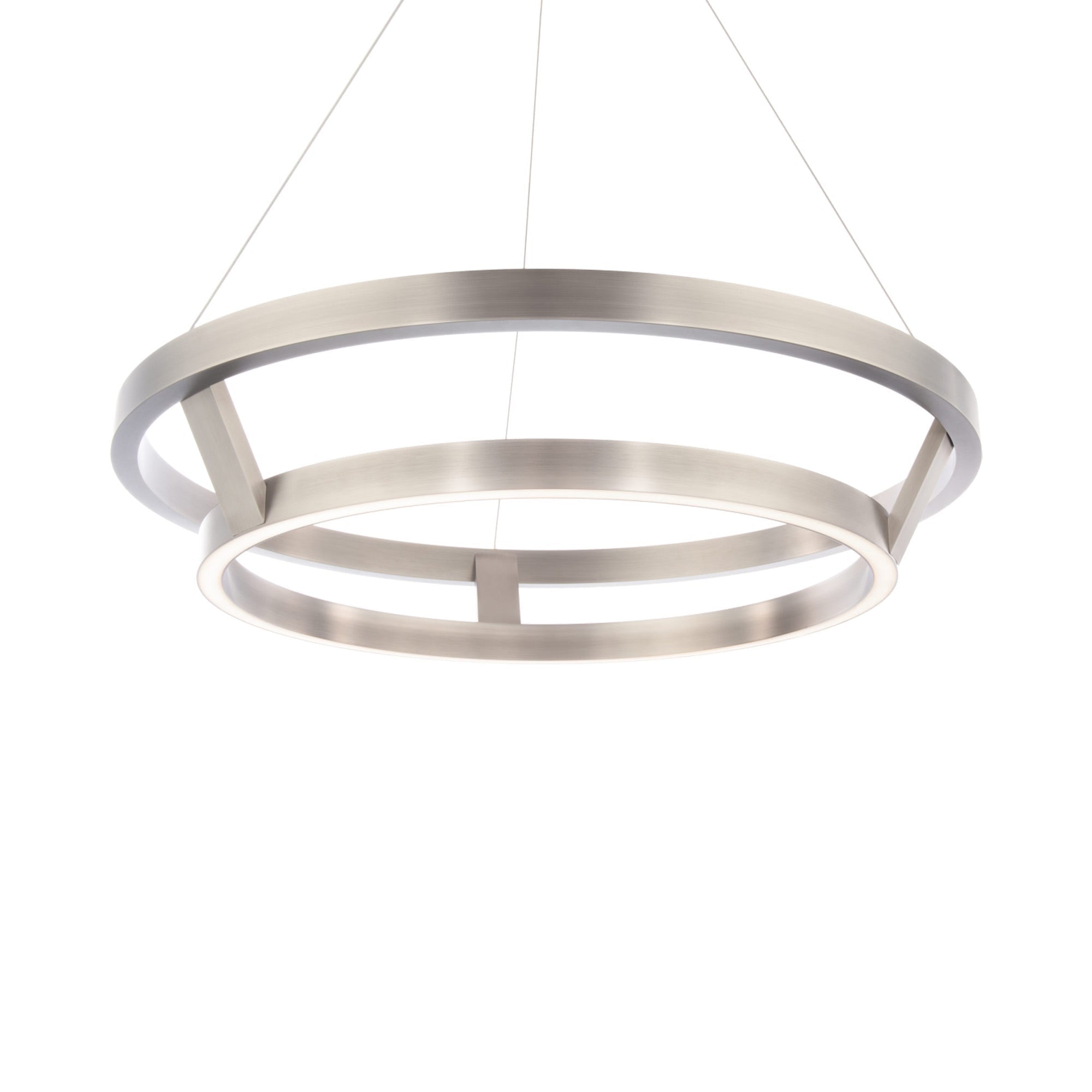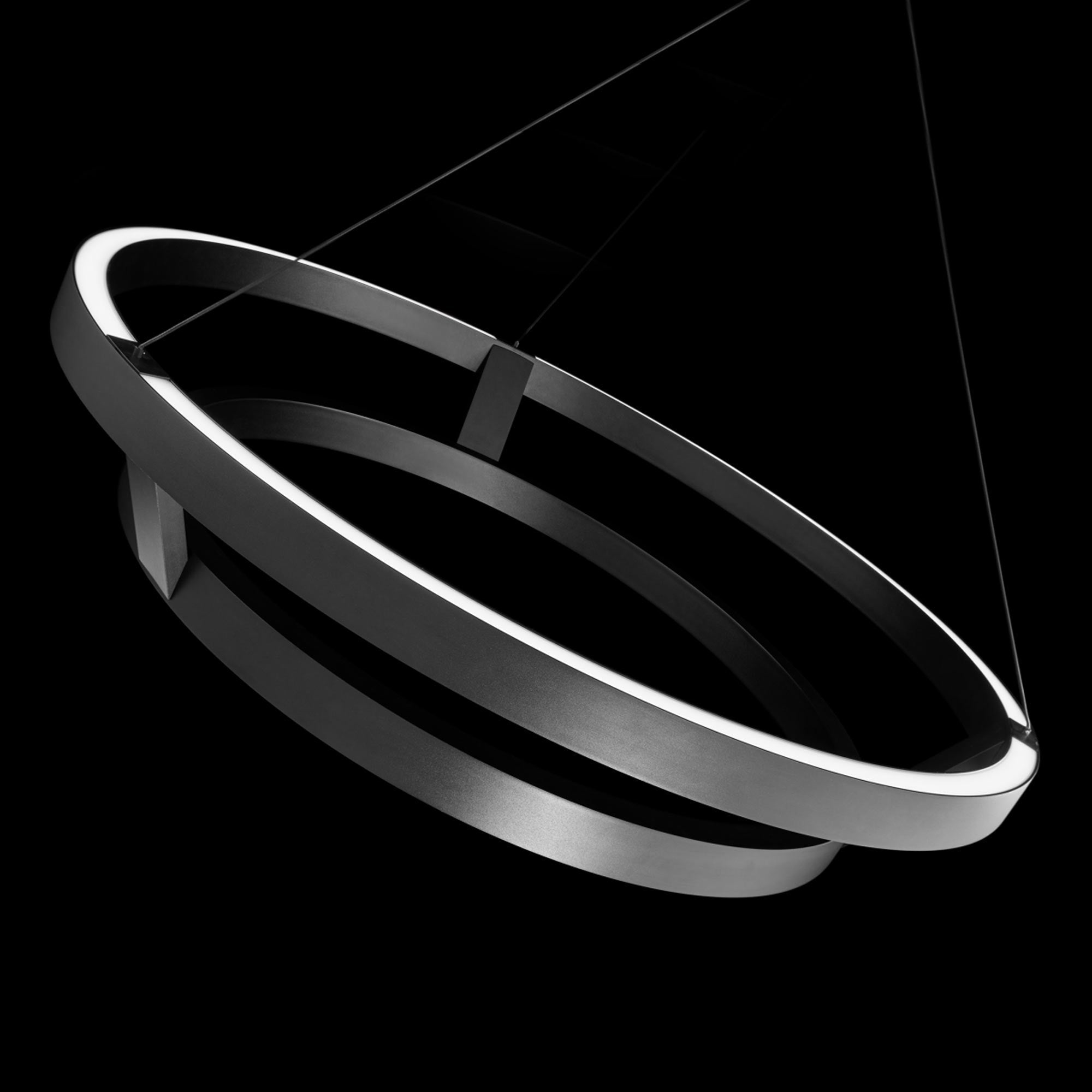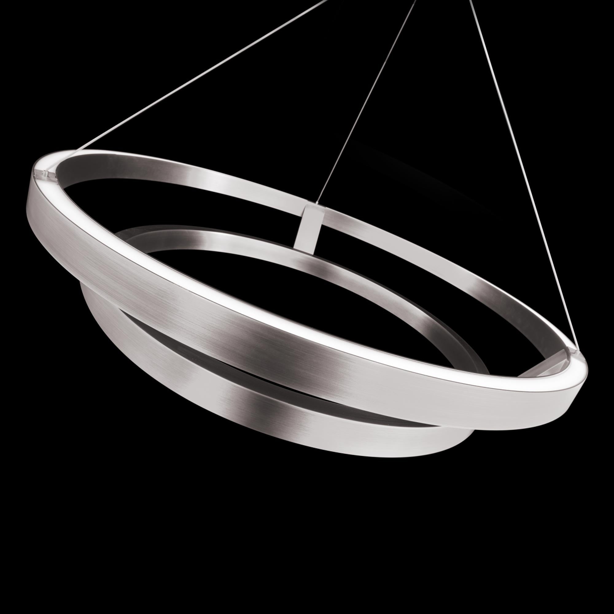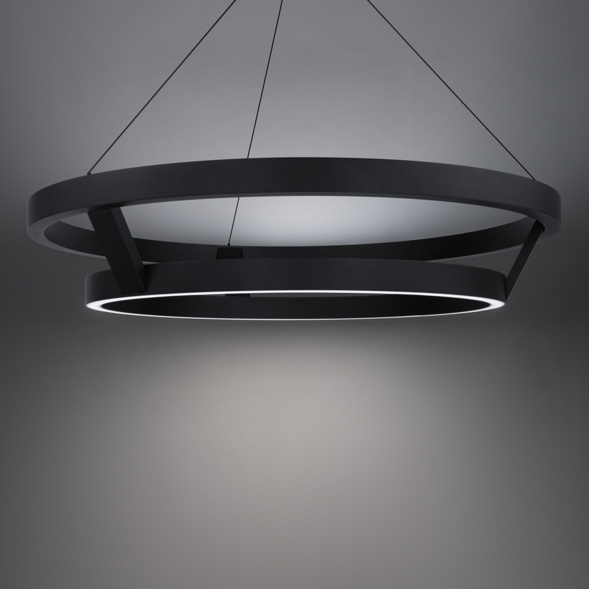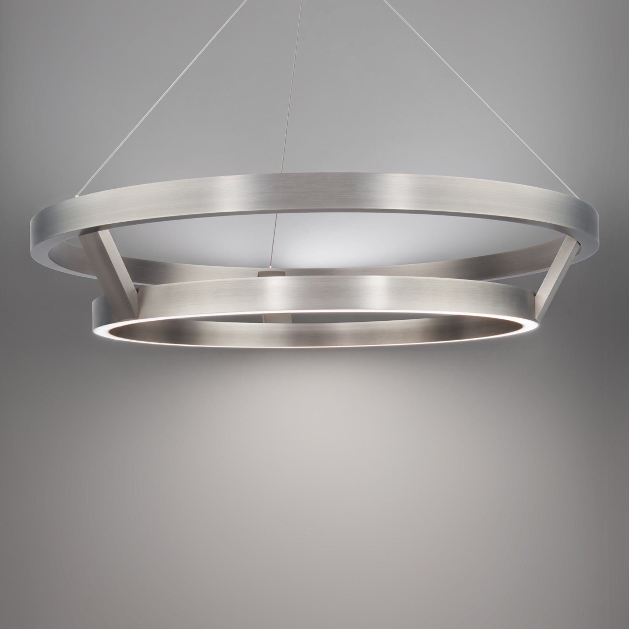An architecturally scaled, two tiered pendant offering both upward and downward illumination from energy efficient LEDs. Clean curvaceous lines from the streamlined silhouette complement the best in today's upscale interiors.