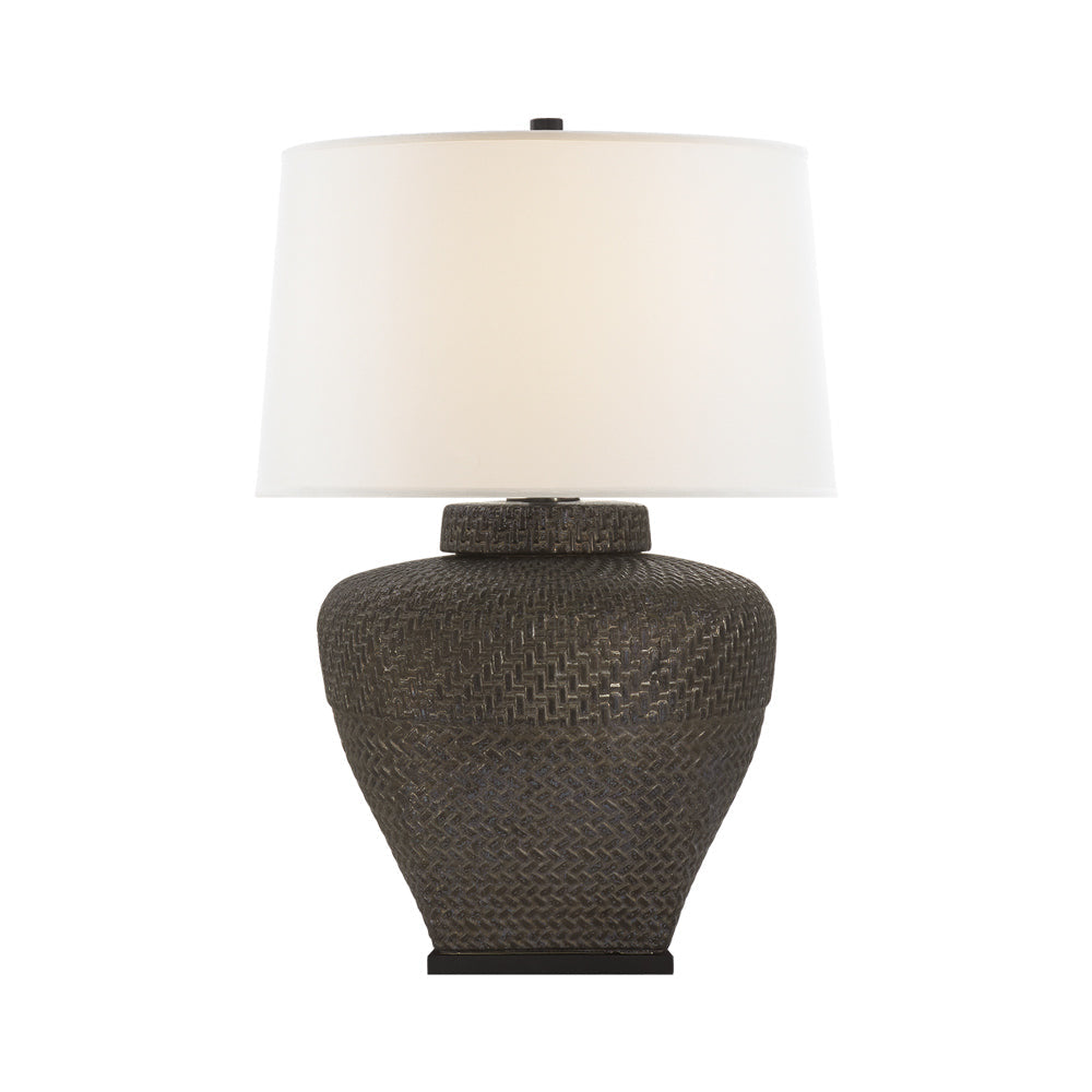 Boastful exotic and dramatic personality is softened with a romantic silhouette as the Isla Table Lamp from Visual Comfort Signature slips in a bit of coastal attitude. Ceramic construction is embellished with sleek textural impact, as a subtle base and linen shade provide essential style support.