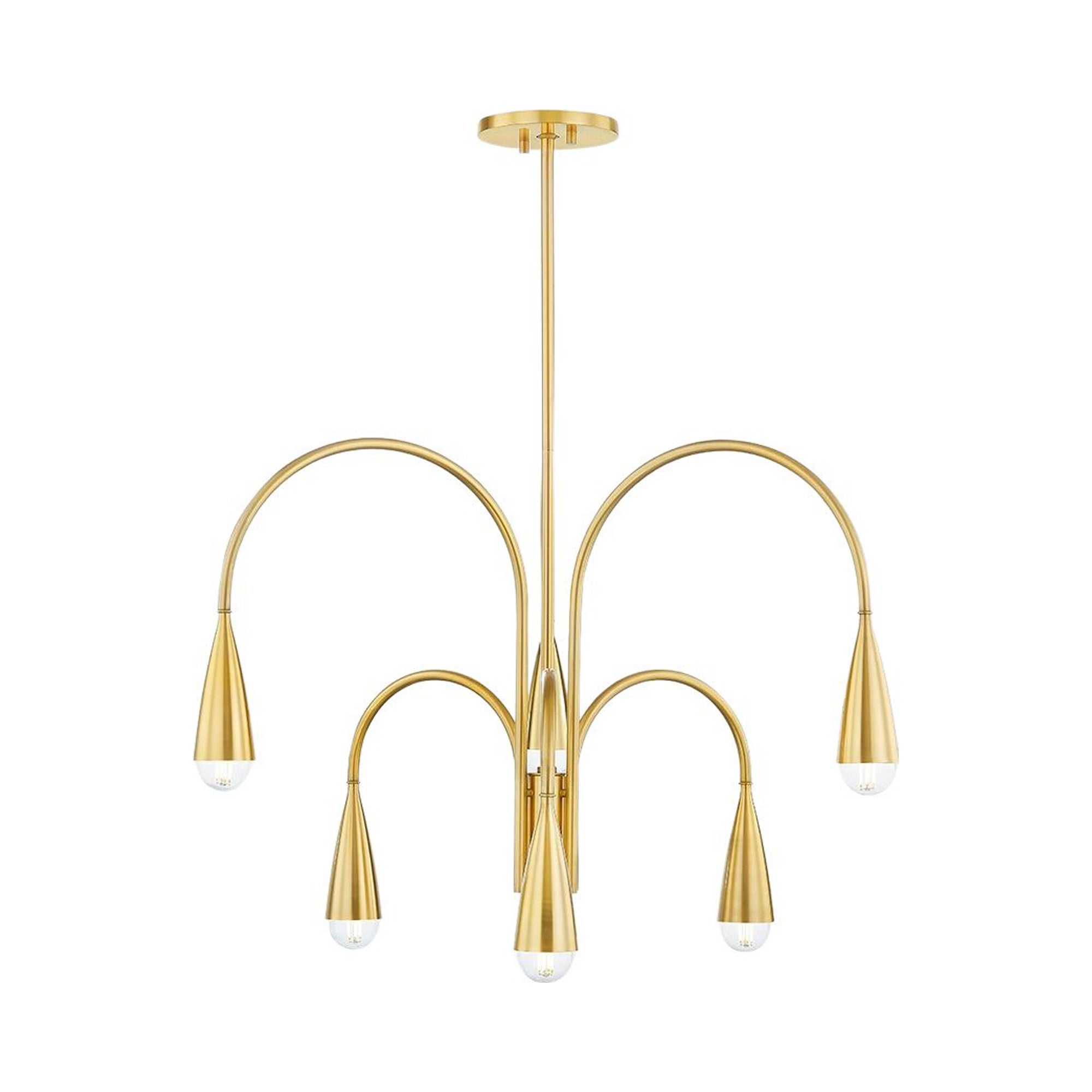 Willow branch inspirations take center stage in the Jenica Chandelier from Mitzi. Its impressive simplicity features swopping downward arms, each capped with a botanically inspired tapered cup and exposed globe bulb. Infused with warmth, its aged brass finish is a chic finishing touch over a dining table or in your foyer.