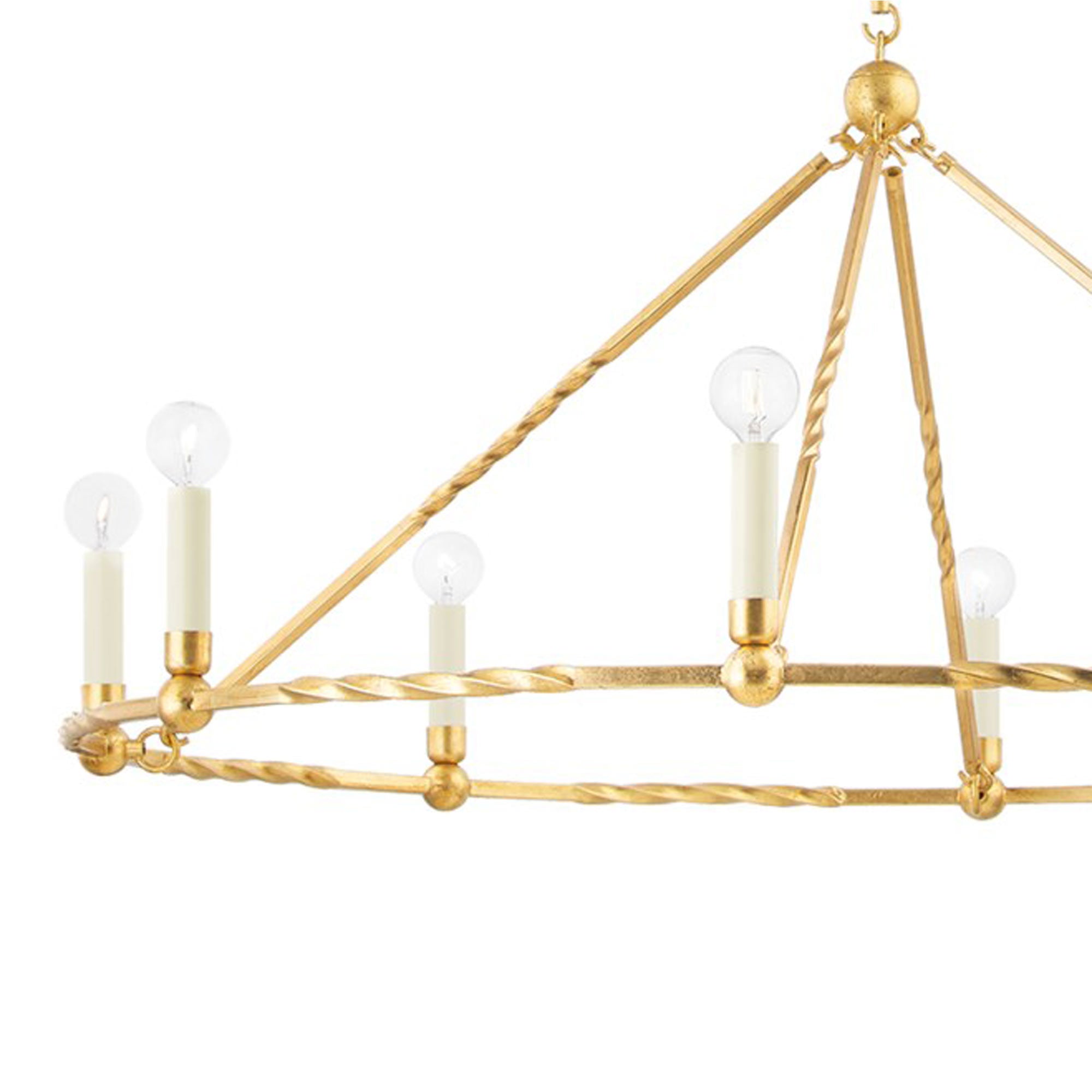 Embrace a captivating castle-inspired aesthetic with glam spirit, adding the Josephine Chandelier from Mitzi to an updated custom space. The epic traditional motif of this delectable fixture retains sufficient simplicity yet adds intricate elements including a twisted ring frame fashioned of vintage gold leaf finish metal and charming clasp cables that form a triangular silhouette. Make a dining ensemble or entryway come to life with this gallery-influenced light source.