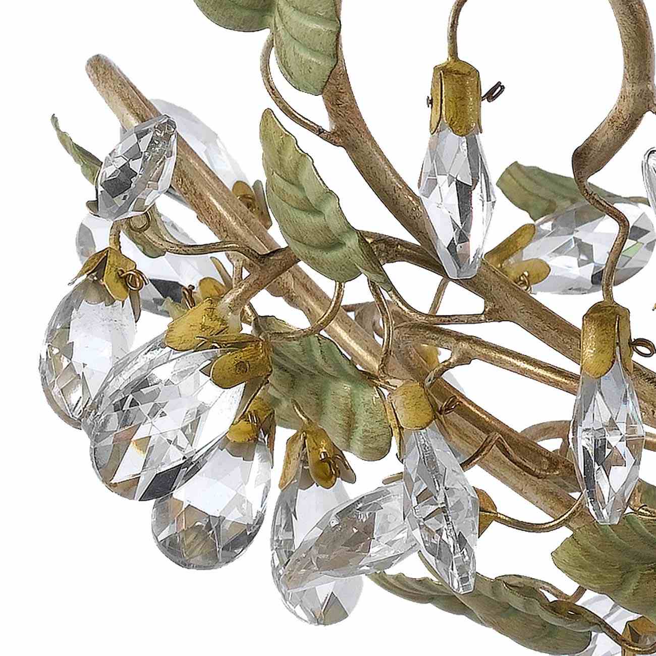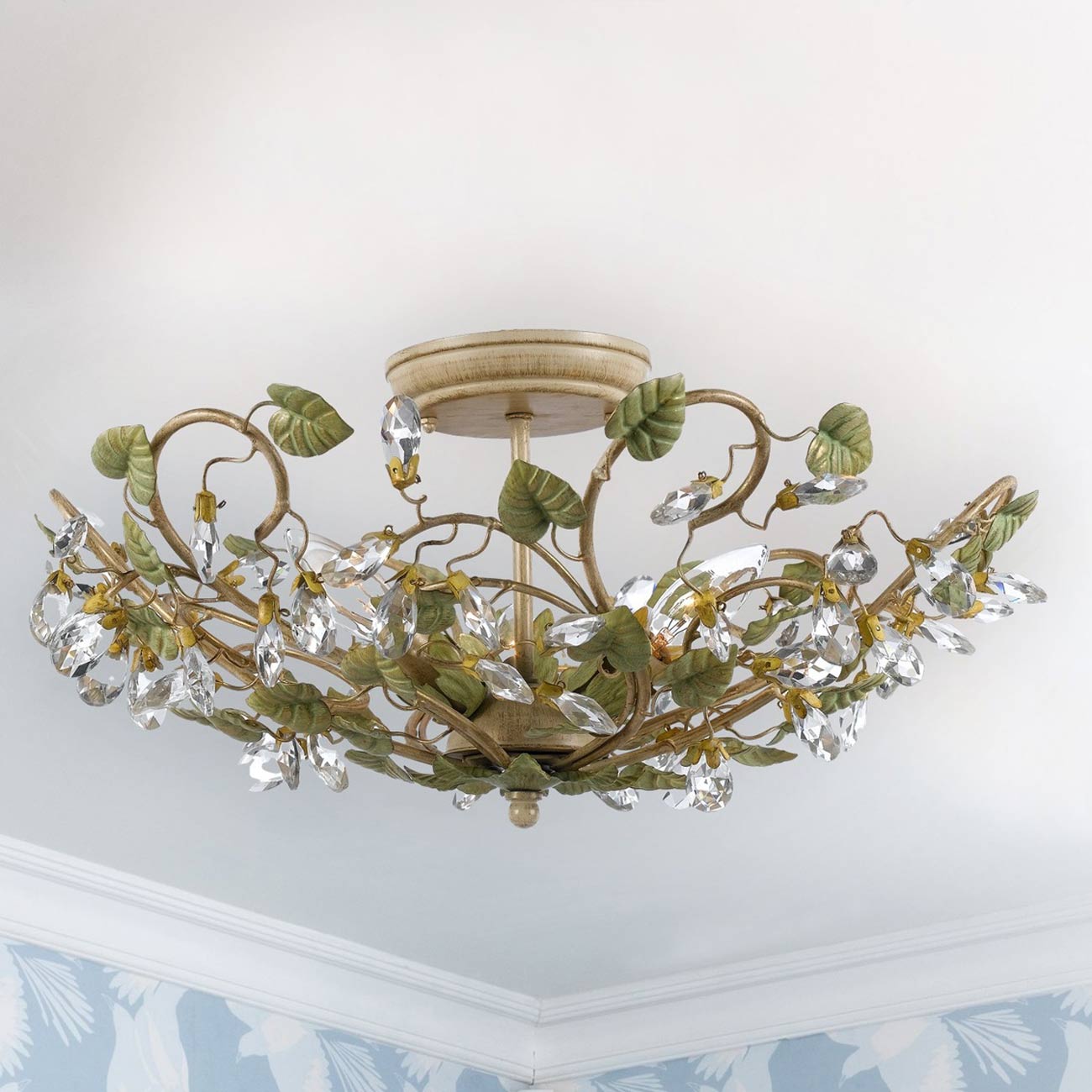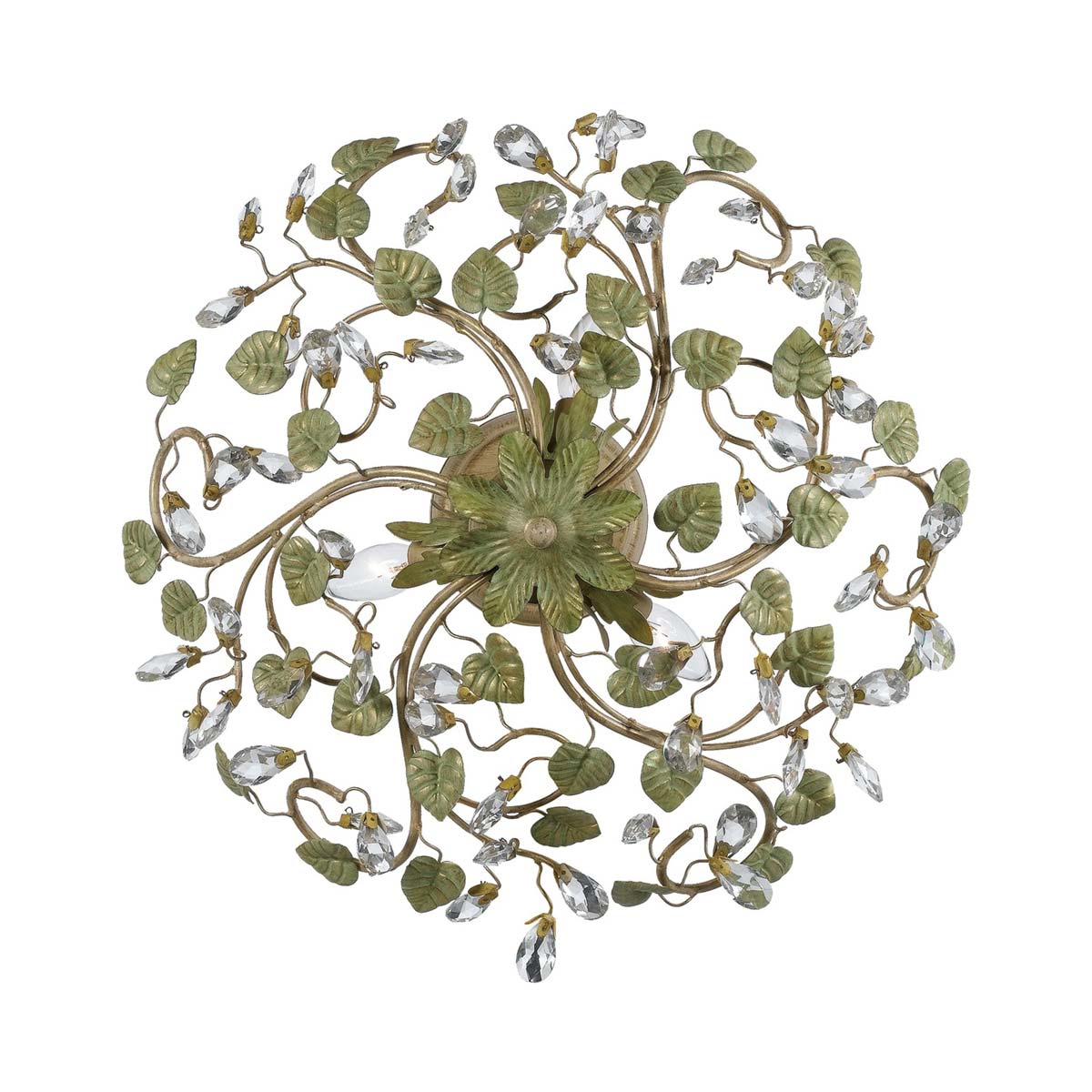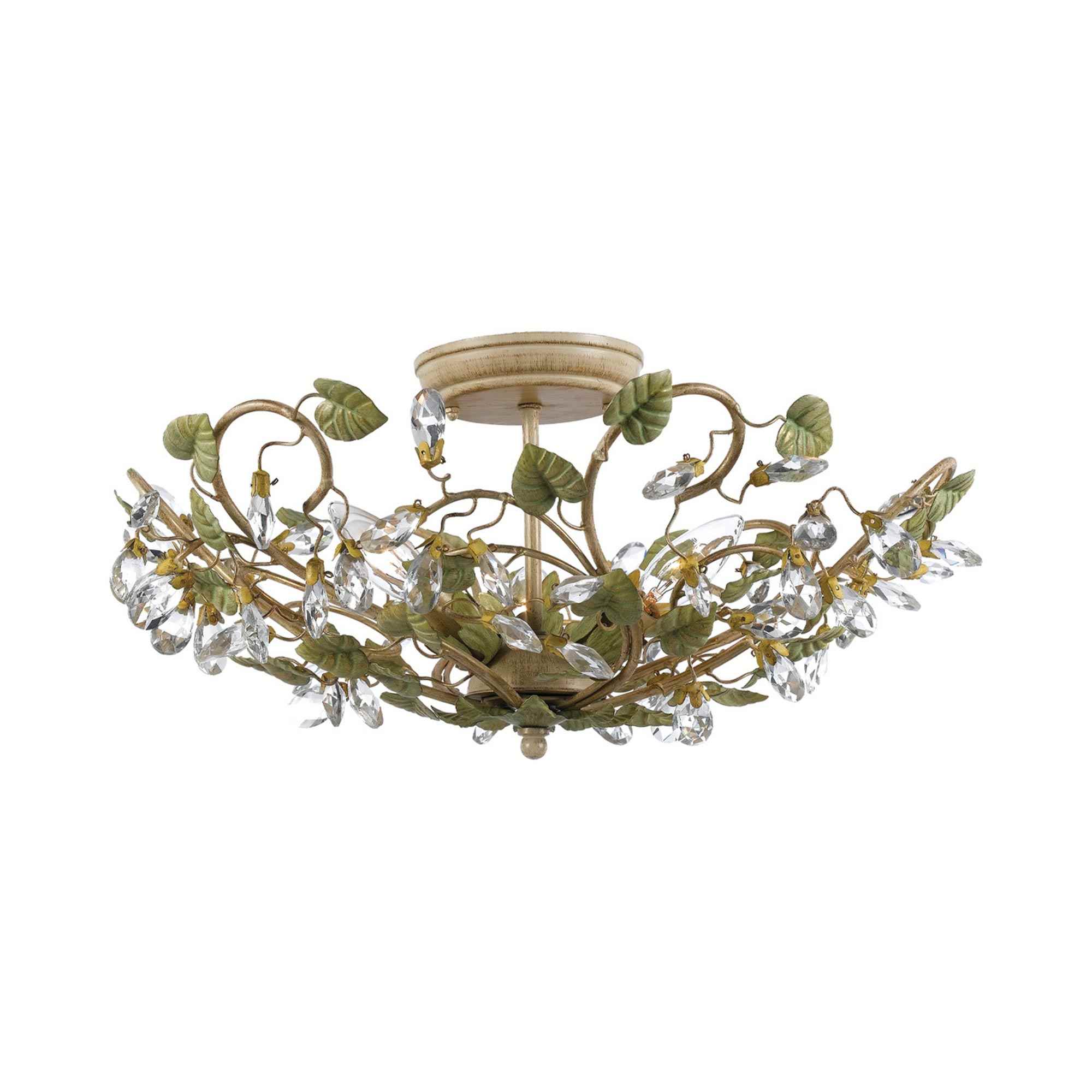 A stunning display of organic beauty creates delicate and natural vibes as the Josie Semi Flush Mount Ceiling Light from Crystorama adds a novel twist in lighting. This fixture turns conventional design on its head with champagne green tea finish leaf elements appearing extraordinarily authentic. Crystal drops offer a surprisingly glam feel to a ceiling light that changes the mood in any space.