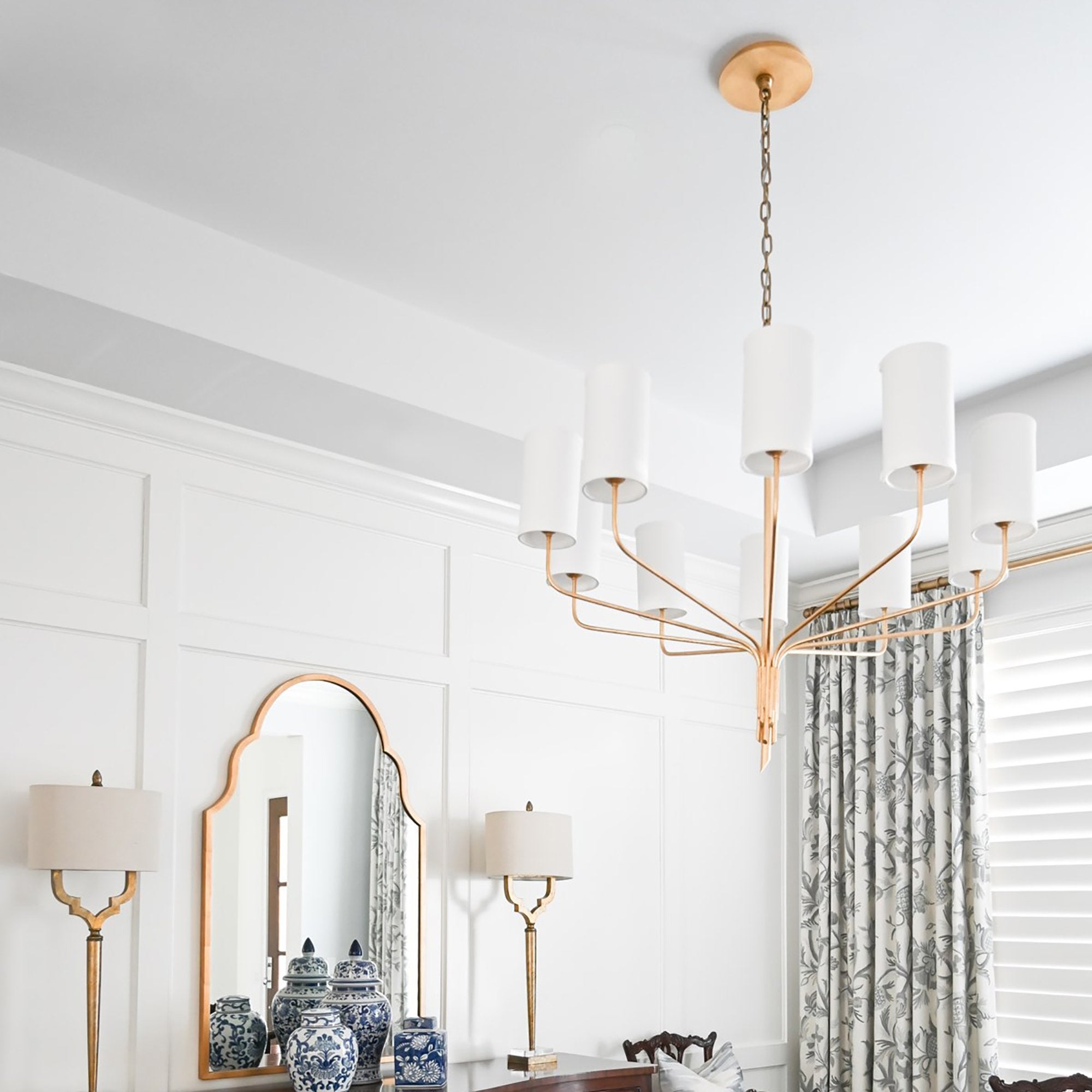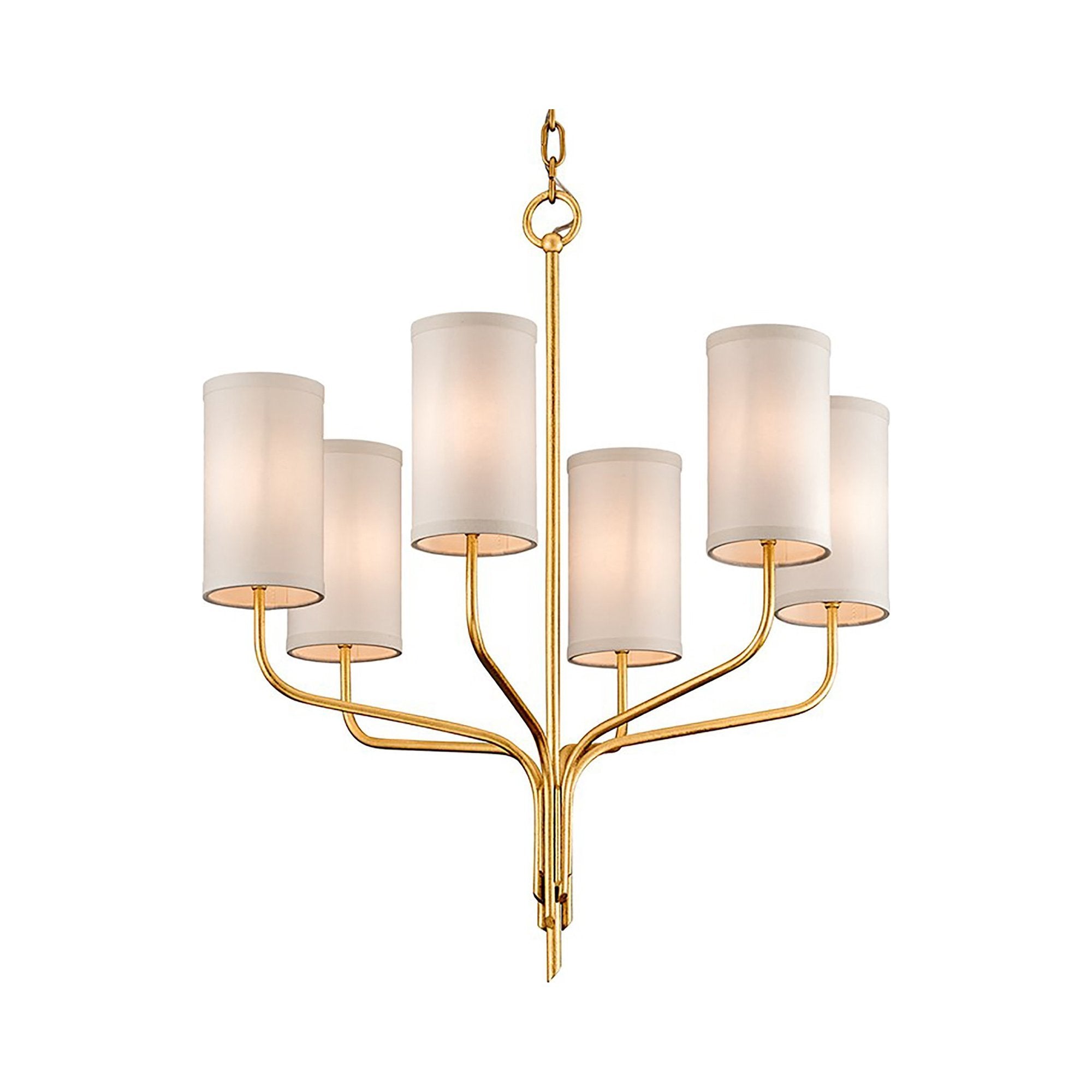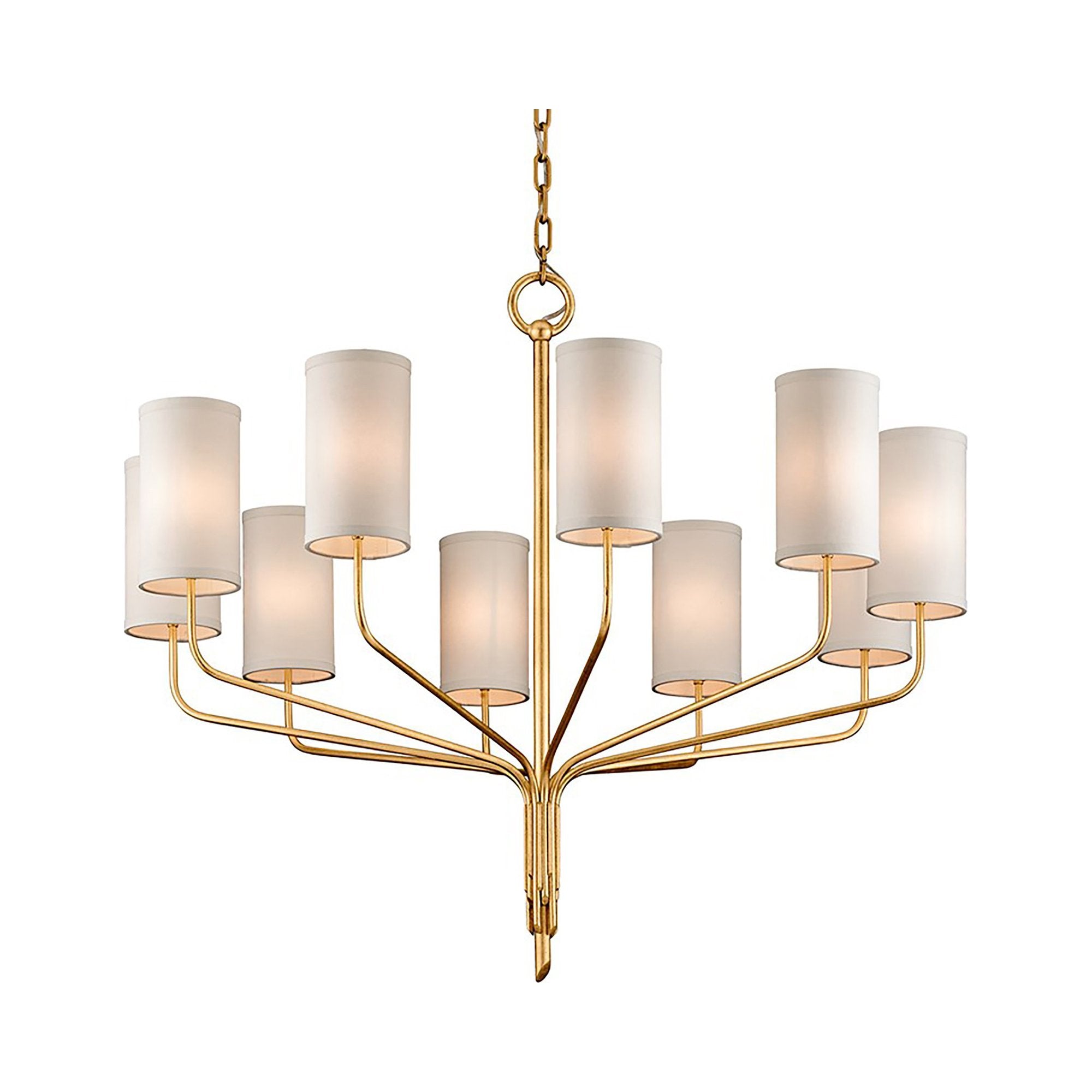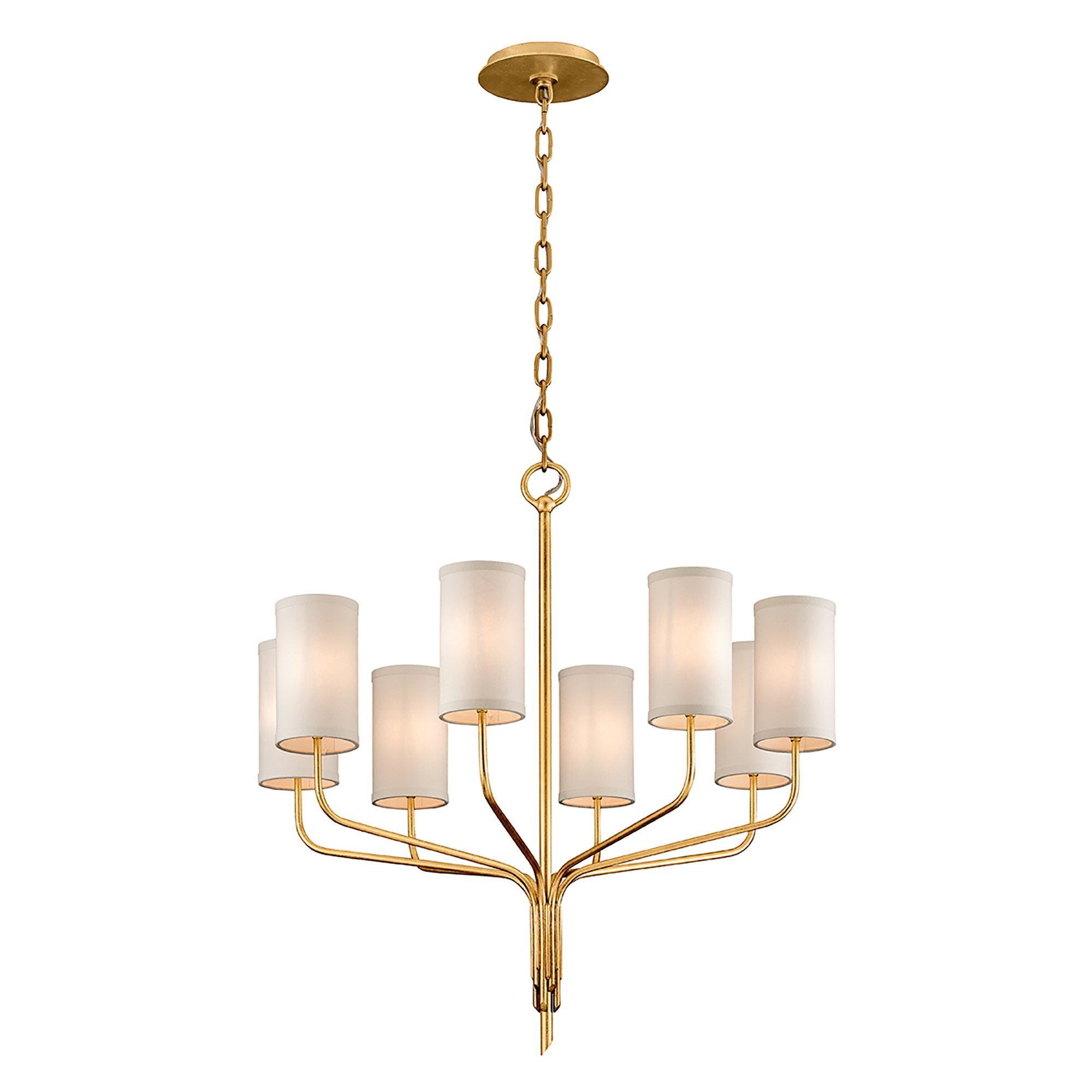 Embrace an artistic silhouette and style in the Juniper Chandelier from Troy Lighting, enjoying off-white hardback linen cylinder shades mounted to a metal tree-style frame.