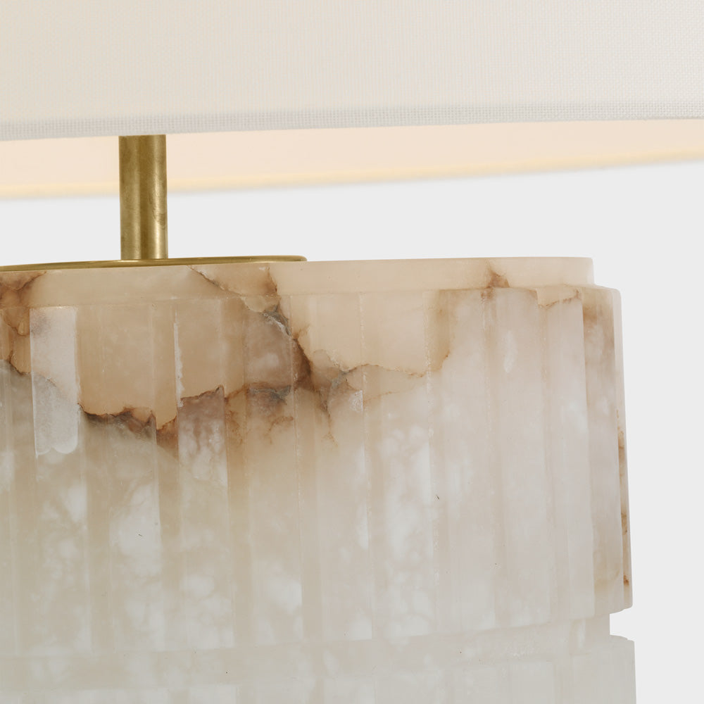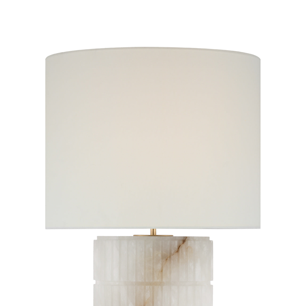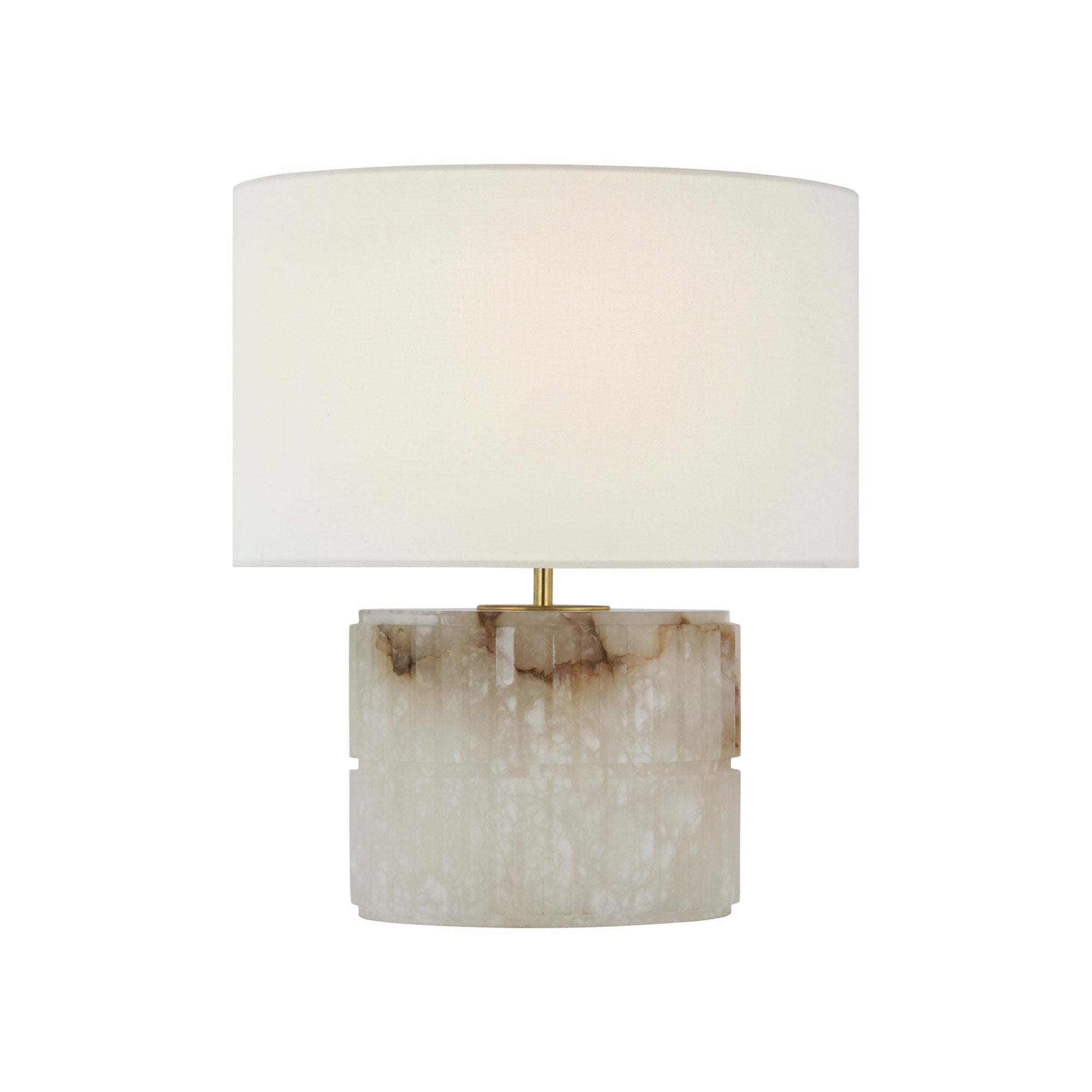 Organic influence is at once glam-inspired and earthy as the Kapittel Table Lamp from Visual Comfort Signature presents a chic aesthetic perfect for bedrooms and living rooms. An alabaster body is chiseled with definitional intrigue as its natural markings serve as a reminder of origins dating back eras. Metal accents and an oversized linen shade perfectly capture the dramatic intent of an artisan designer.