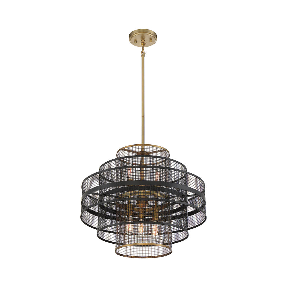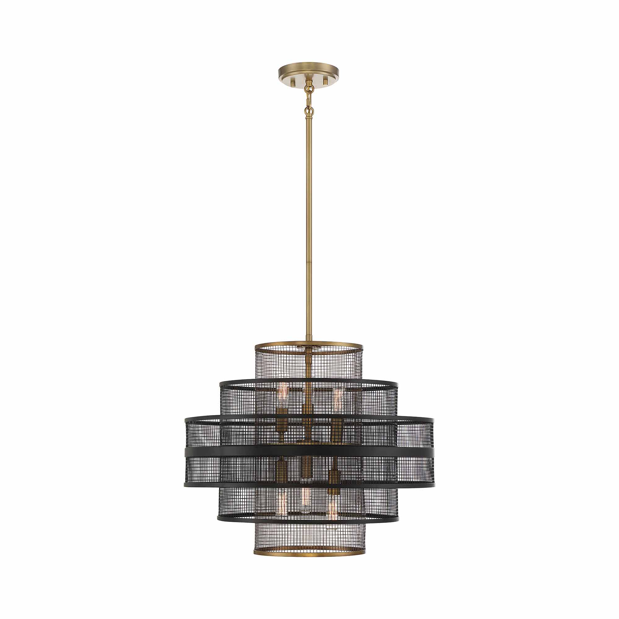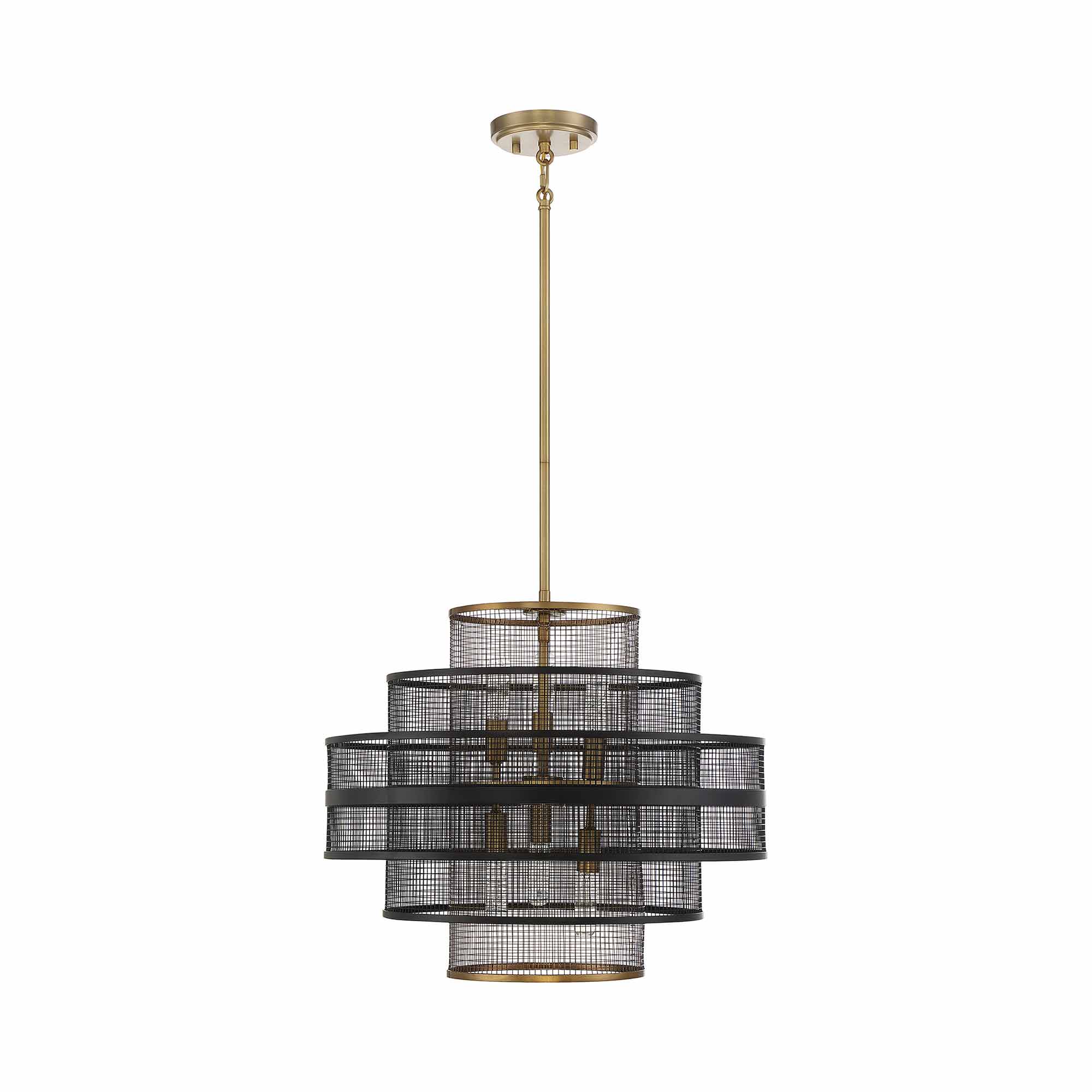 Visually enticing layers of matte black mesh create a sensation in interior design and function as the Kelvin Pendant Light from Savoy House serves as a primary focal point. Dress up a dining ensemble or foyer with this chic industrial-inspired fixture devoted to a stylish form of geometry. Multiple interior lights are partly visible as they radiate off of gold accents and create sensational illumination.