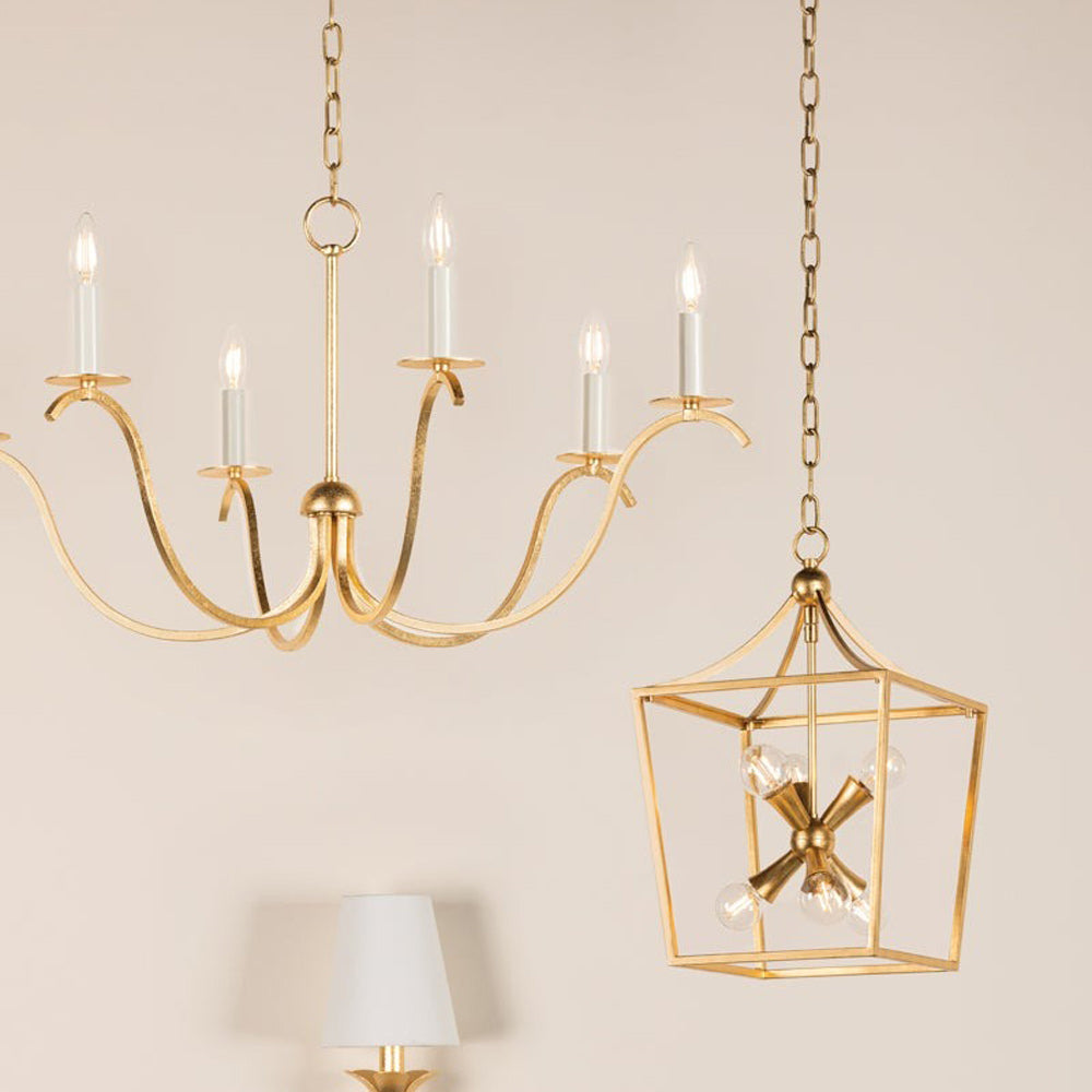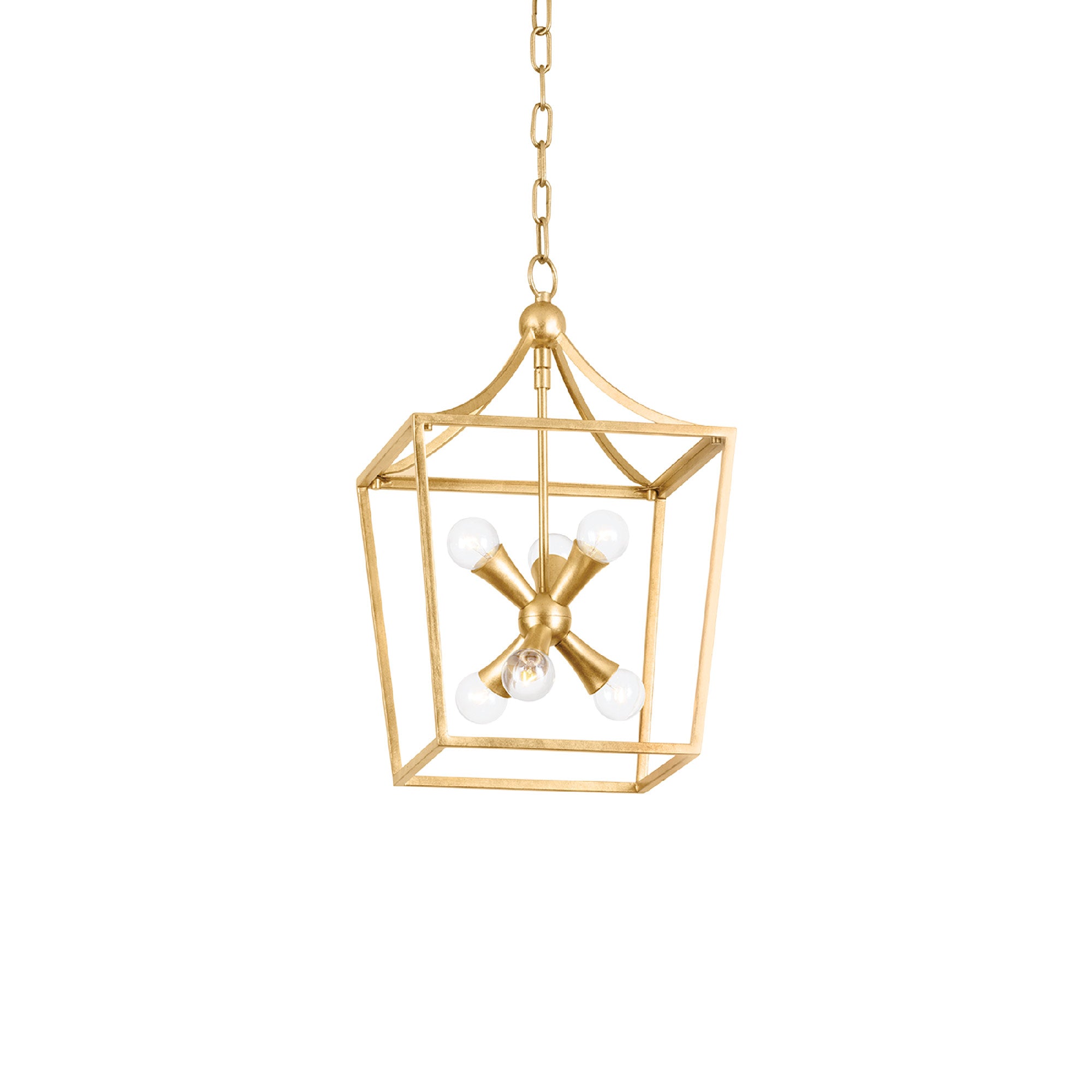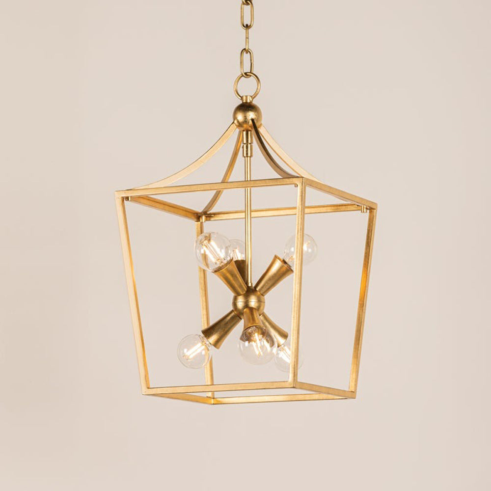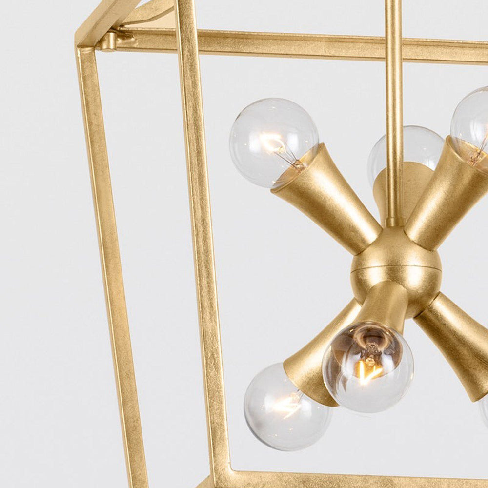 Blending motifs, the Kendall Lantern Pendant Light from Mitzi features an open lantern cage and a Sputnik-inspired light cluster within. It's a bright, bold addition over a dining table or living room seating group, with a gleaming vintage gold leaf that's sure to enchant. The light cluster casts illumination in every direction, with intriguing shadow effects created by its surrounding framework.