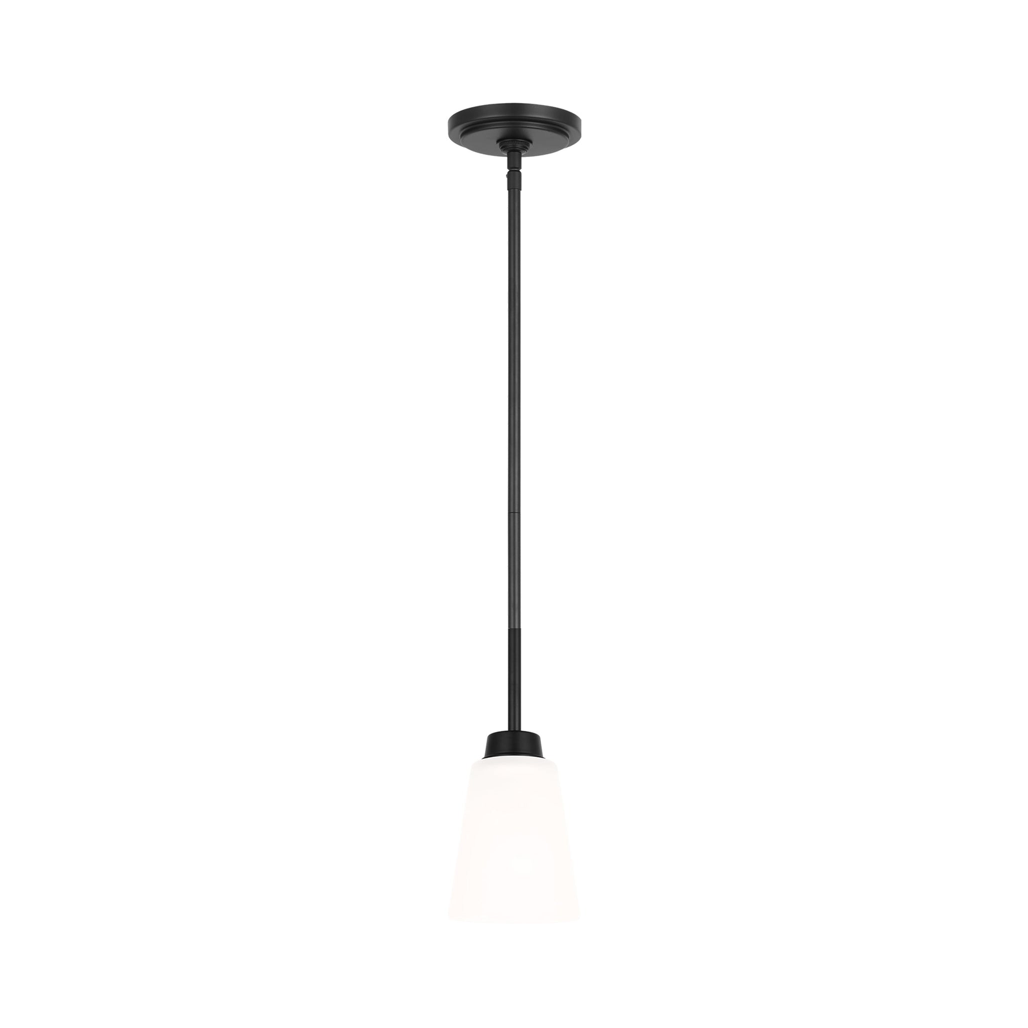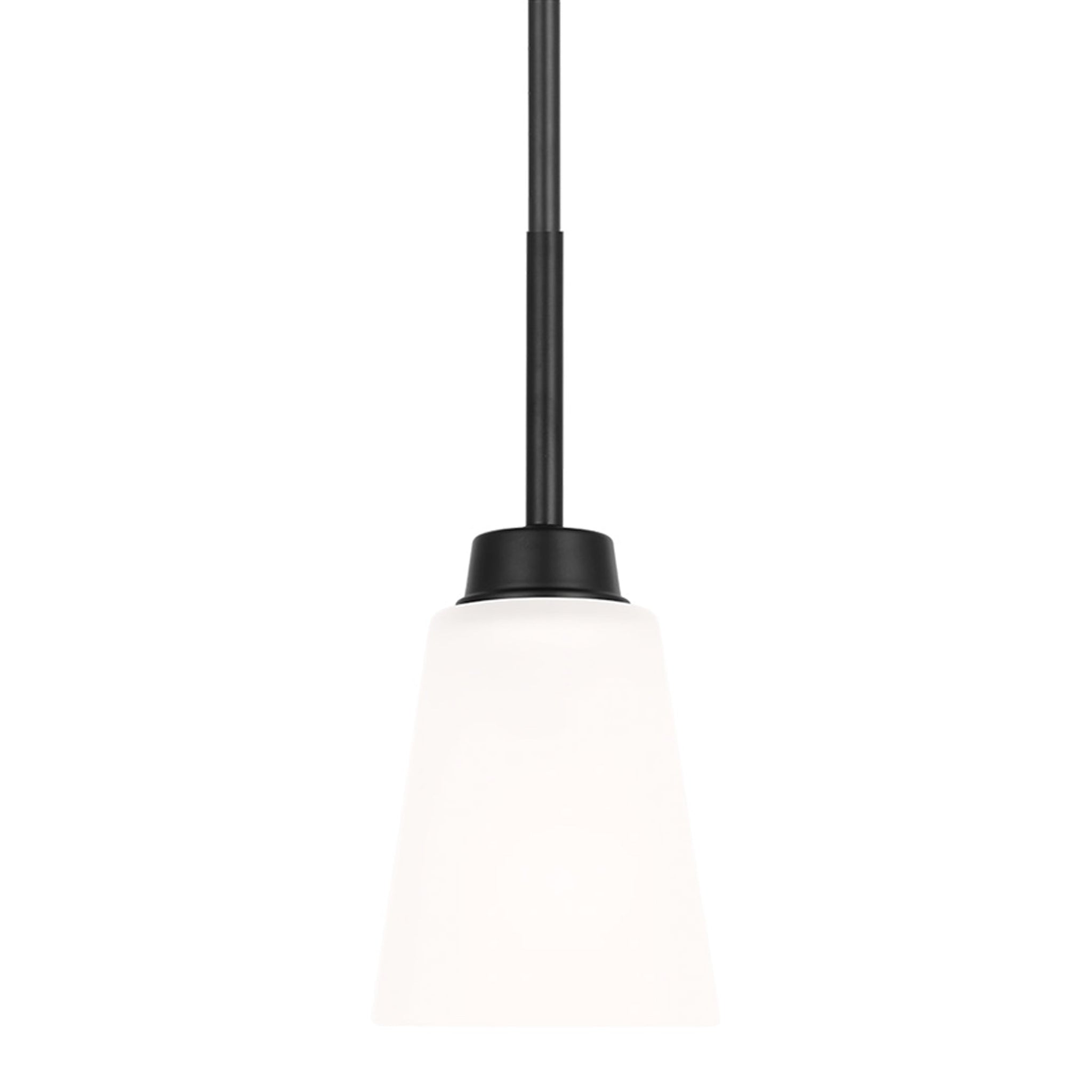 Making a statement with a timeless twist, the Kerrville Mini Pendant Light from Generation Lighting embraces minimalism to shift focus to surrounding décor. A contrasting palette of deep finish metal framing and a romantic milky glass shade introduces a notable updated custom look, casting soft illumination in a contemporary or transitional setting.