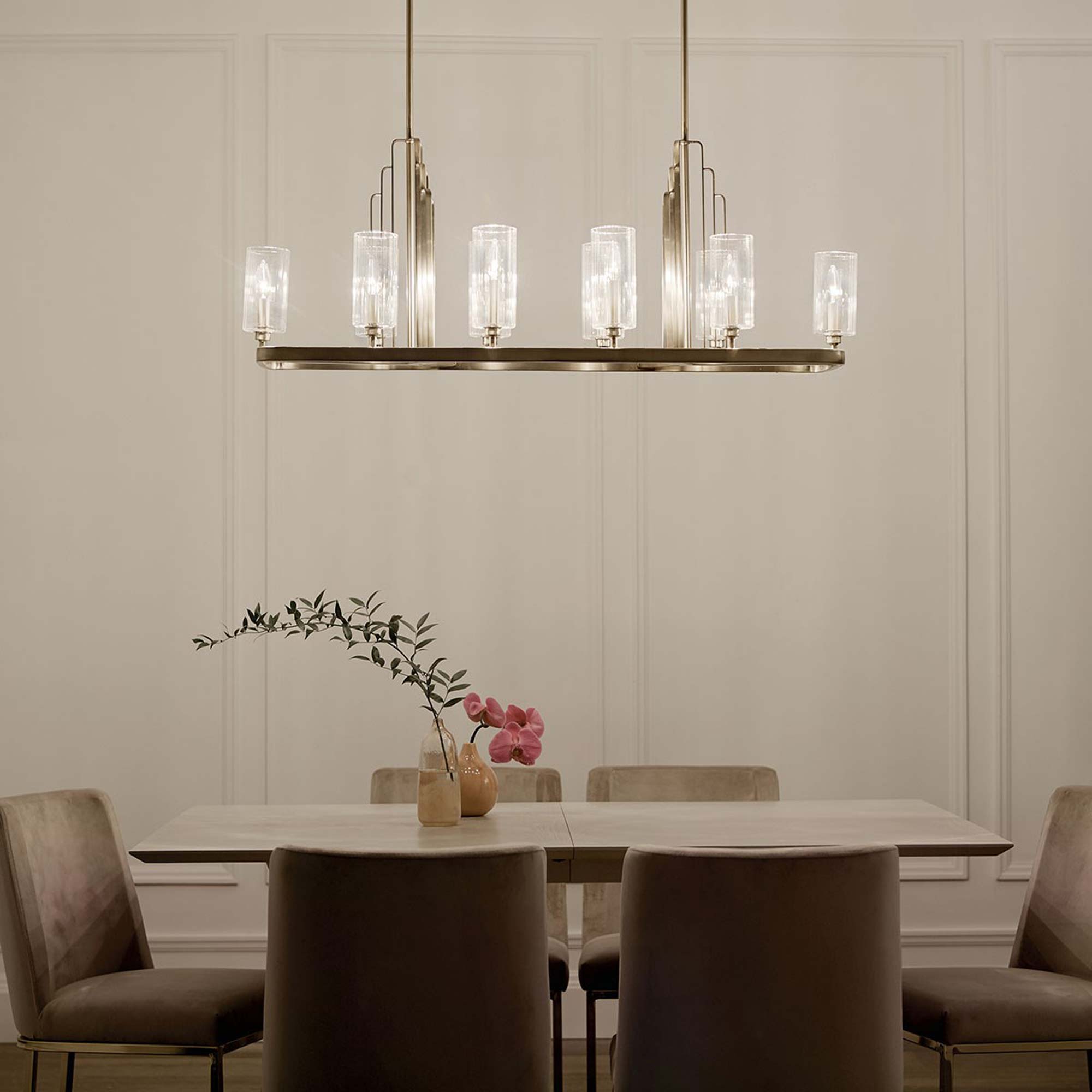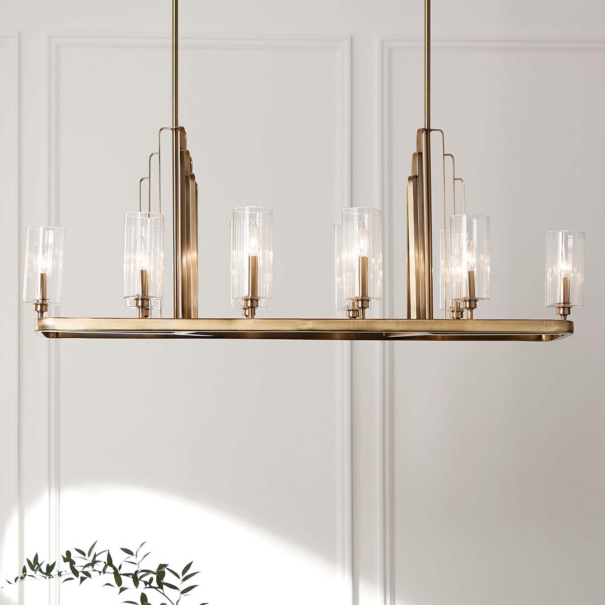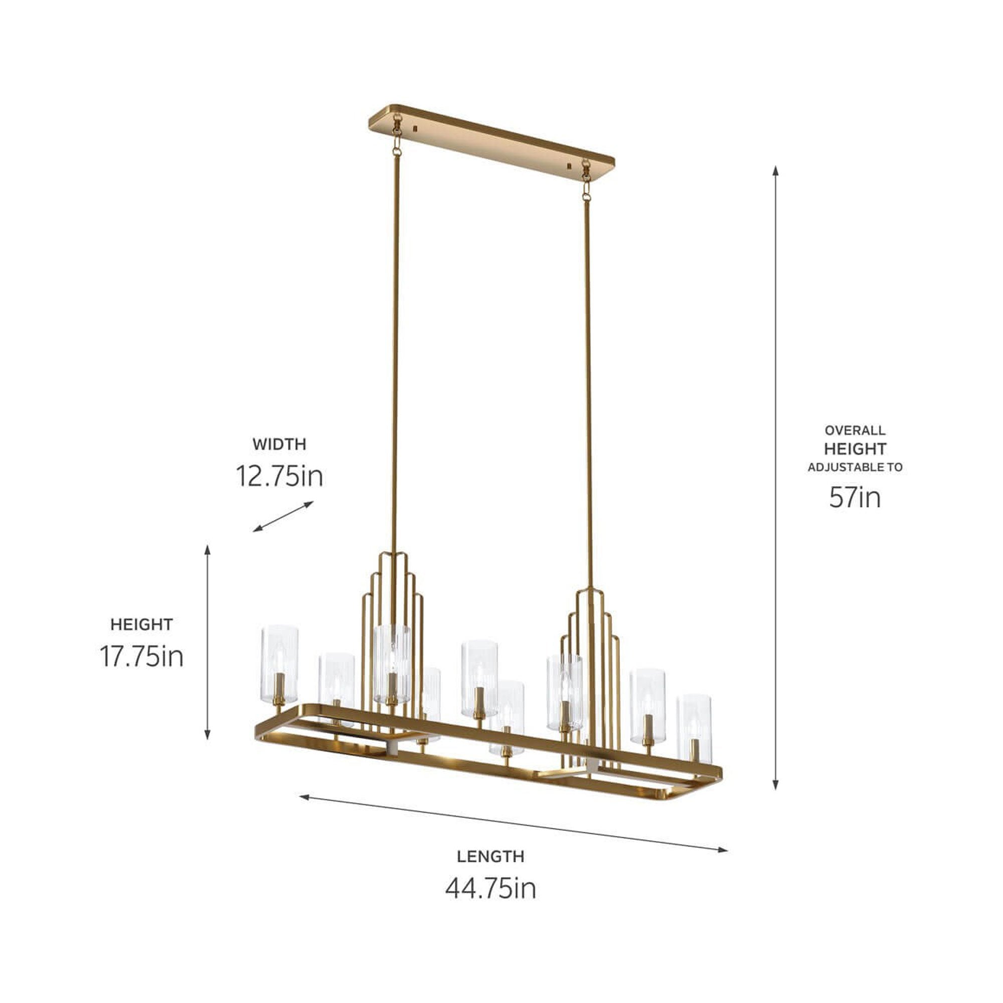The Kimrose™ 10 light linear chandelier is an Art Deco masterpiece. Its geometric shapes take center stage in a gorgeous Brushed Natural Brass and Polished Nickel finish. The shades are Clear Fluted Glass, meaning they're ribbed gently with vertical grooves to produce a subtle lighting effect. For lighting without the effect, simply remove the shades.