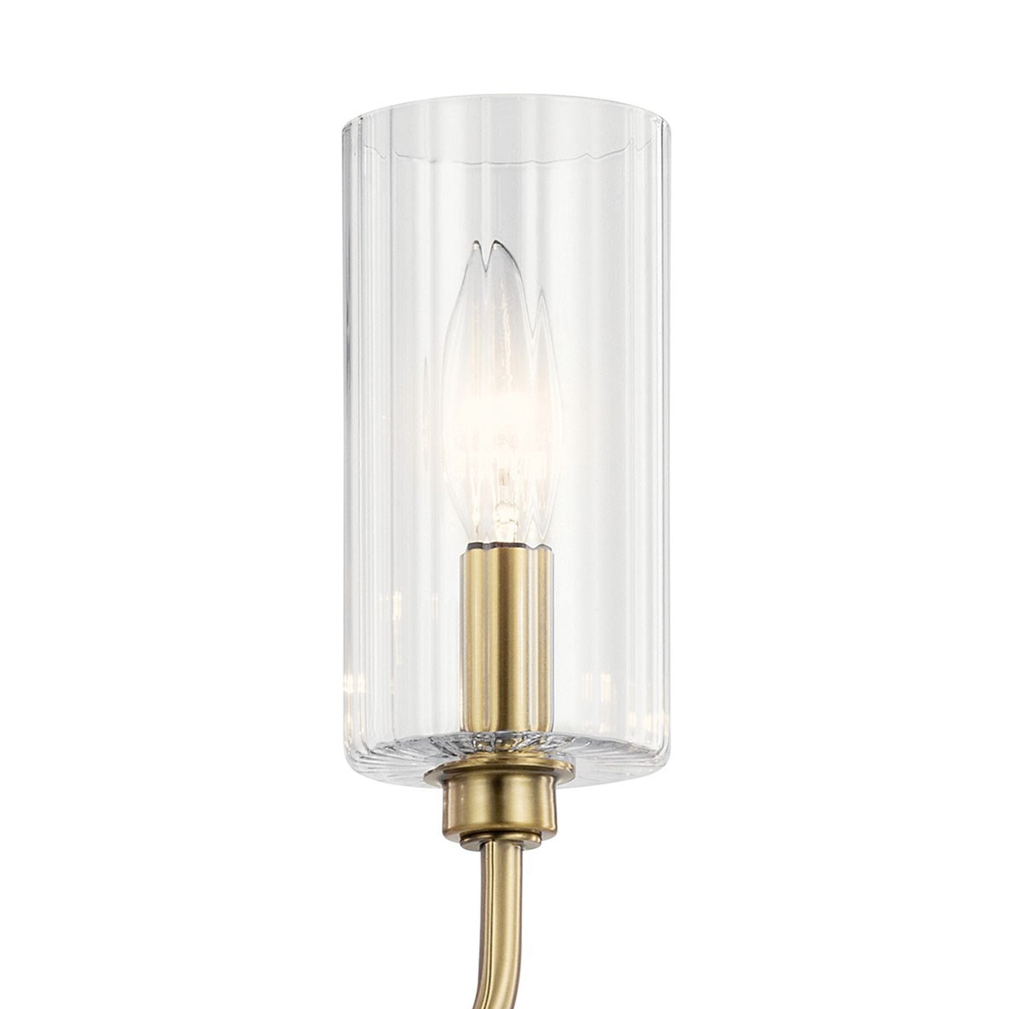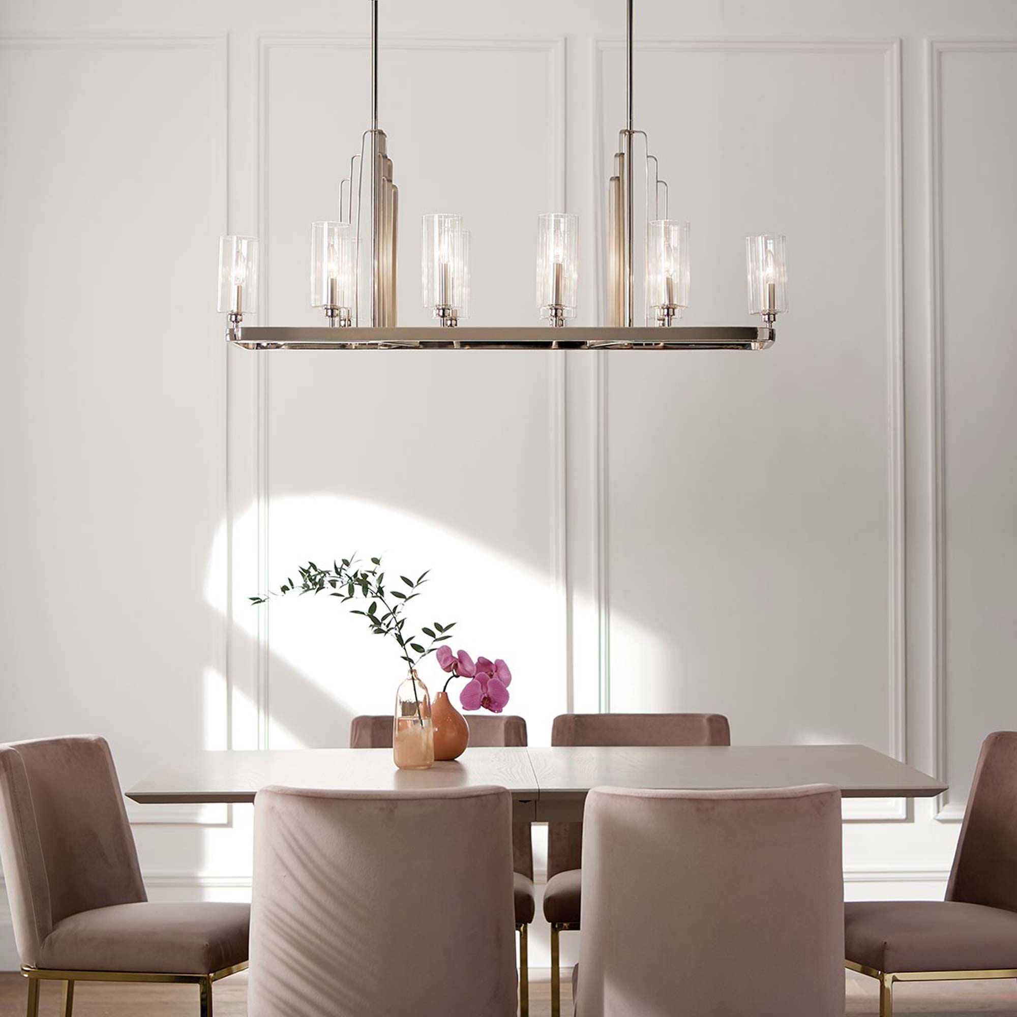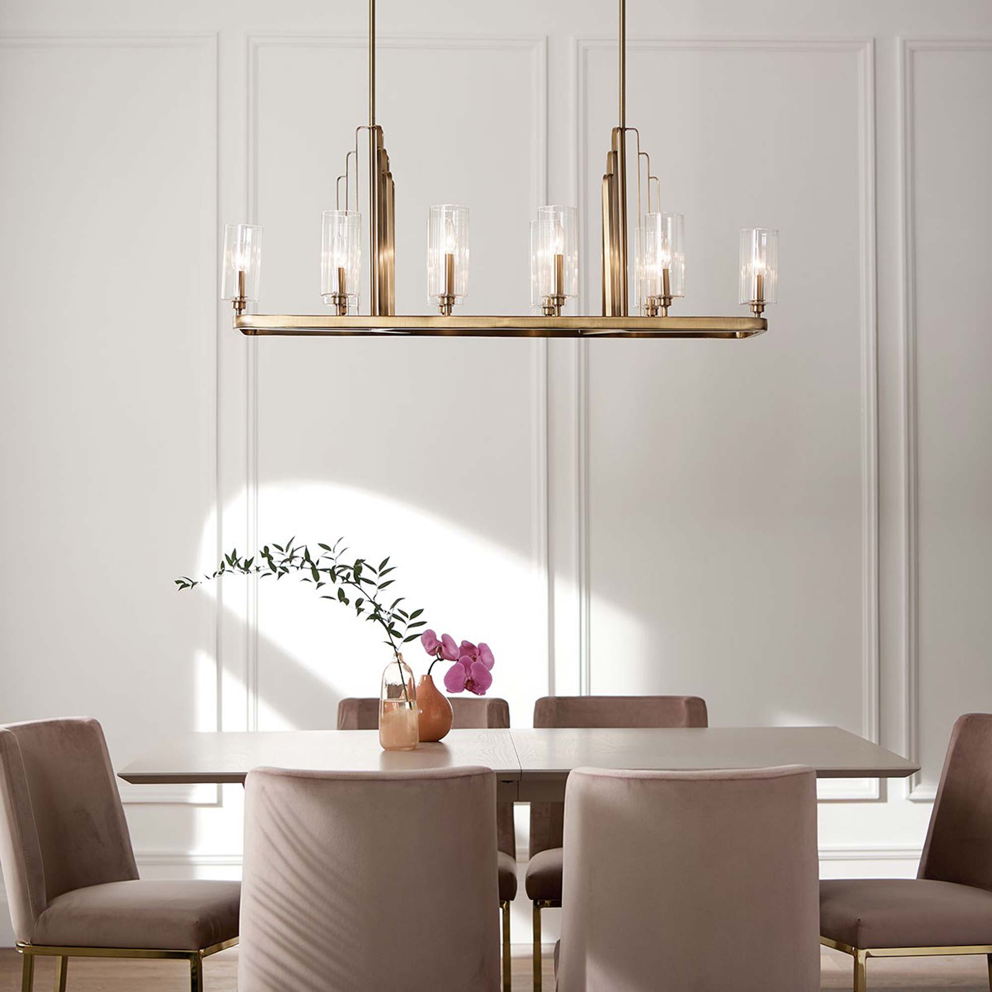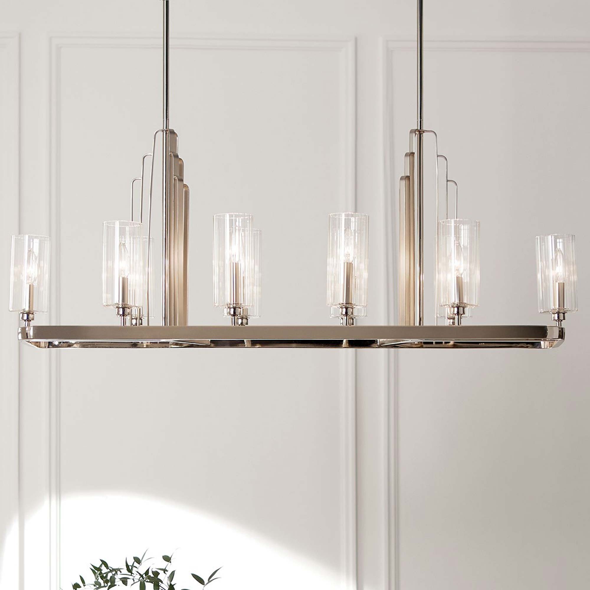 The Kimrose™ 10 light linear chandelier is an Art Deco masterpiece. Its geometric shapes take center stage in a gorgeous Brushed Natural Brass and Polished Nickel finish. The shades are Clear Fluted Glass, meaning they're ribbed gently with vertical grooves to produce a subtle lighting effect. For lighting without the effect, simply remove the shades.