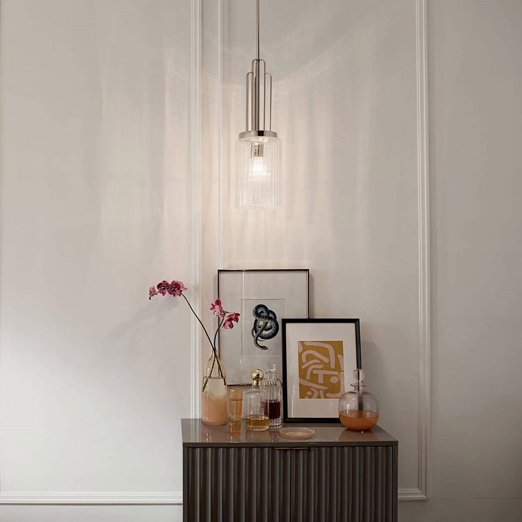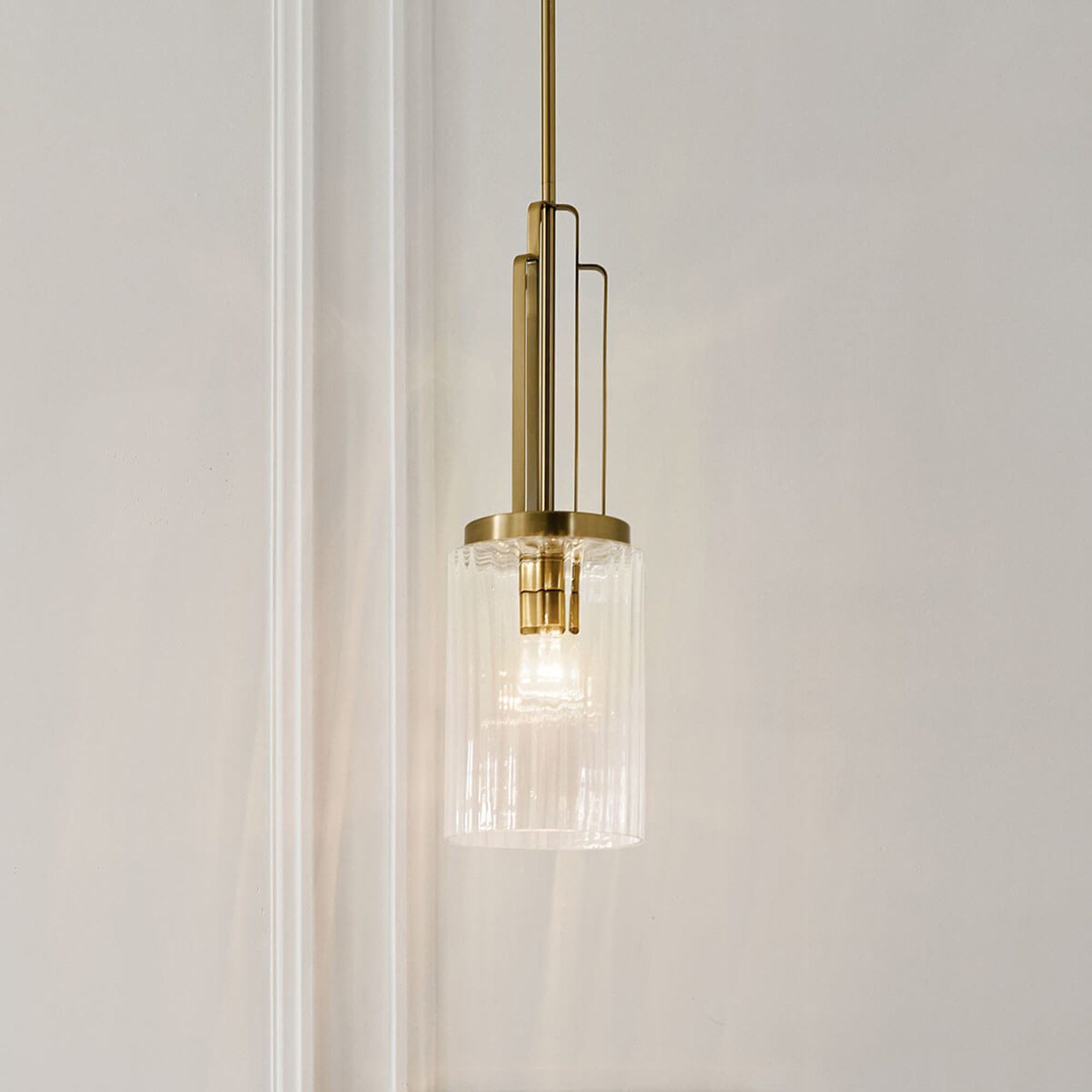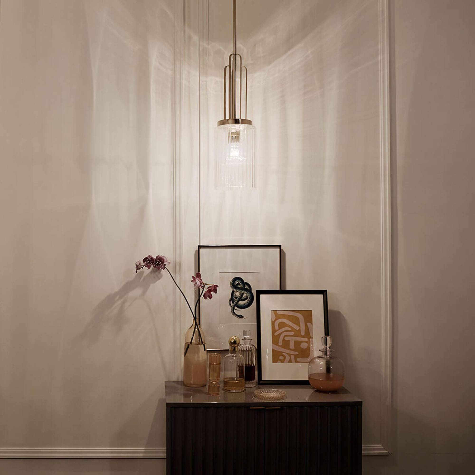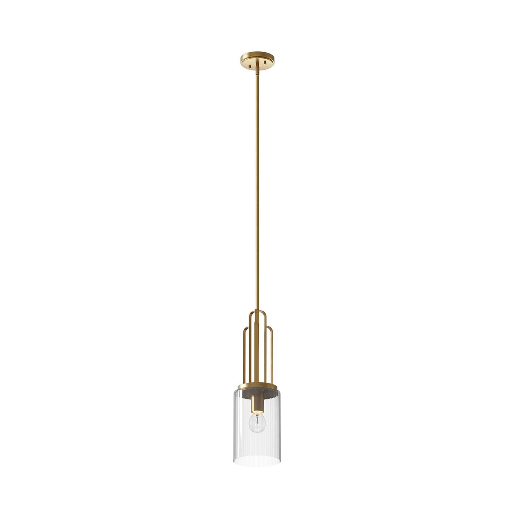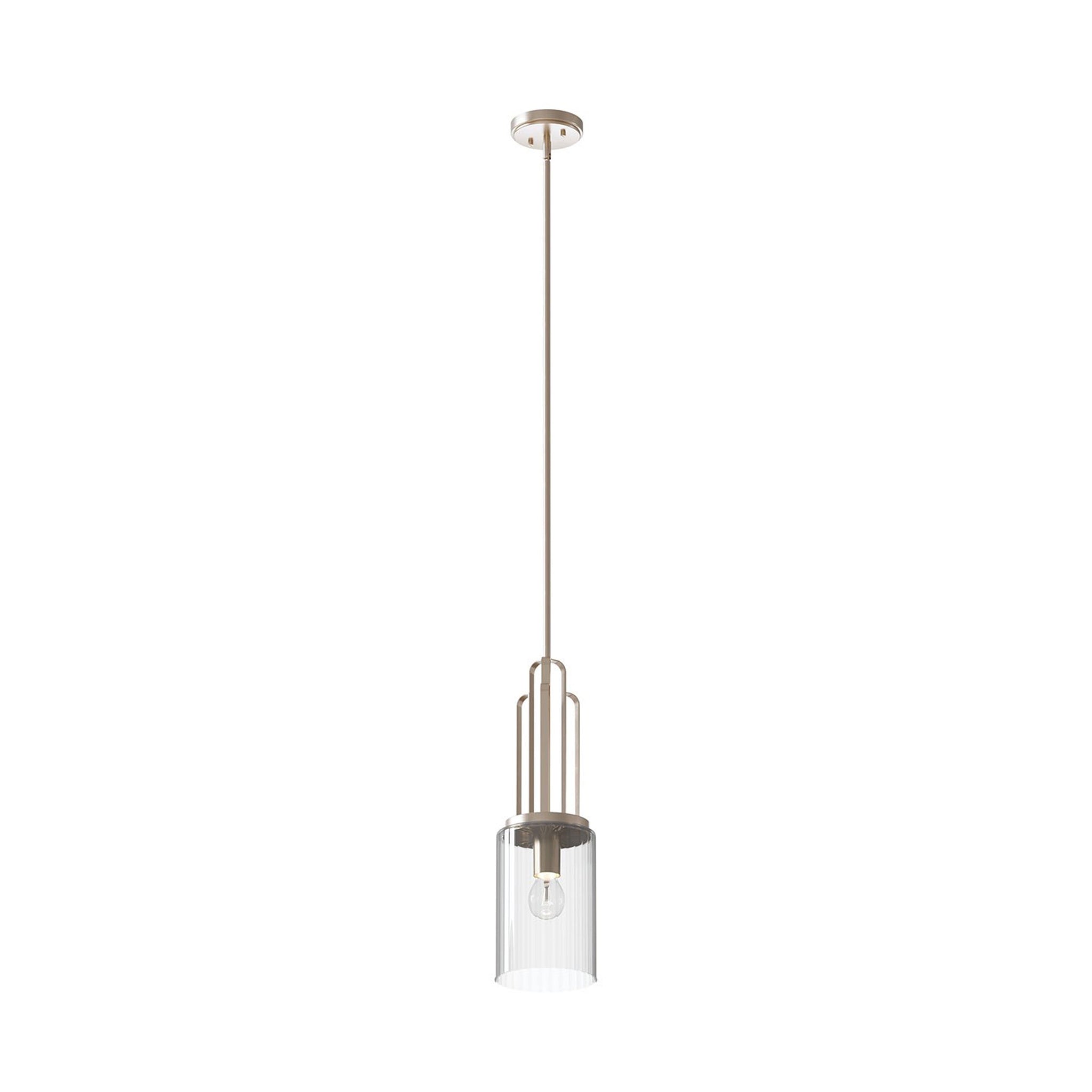 The Kimrose™ 1 light pendant features Art Deco-inspired geometric shapes in a gorgeous Brushed Natural Brass and Polished Nickel above a glass shade. The shade is Clear Fluted Glass, so it's ribbed gently with vertical grooves to produce a subtle lighting effect. For lighting without the effect, simply remove the shade.