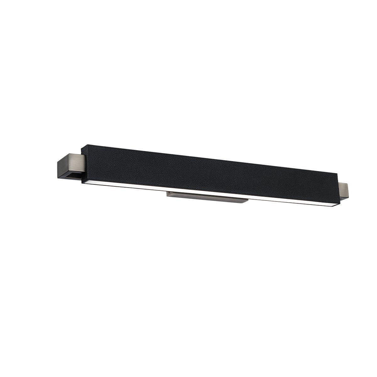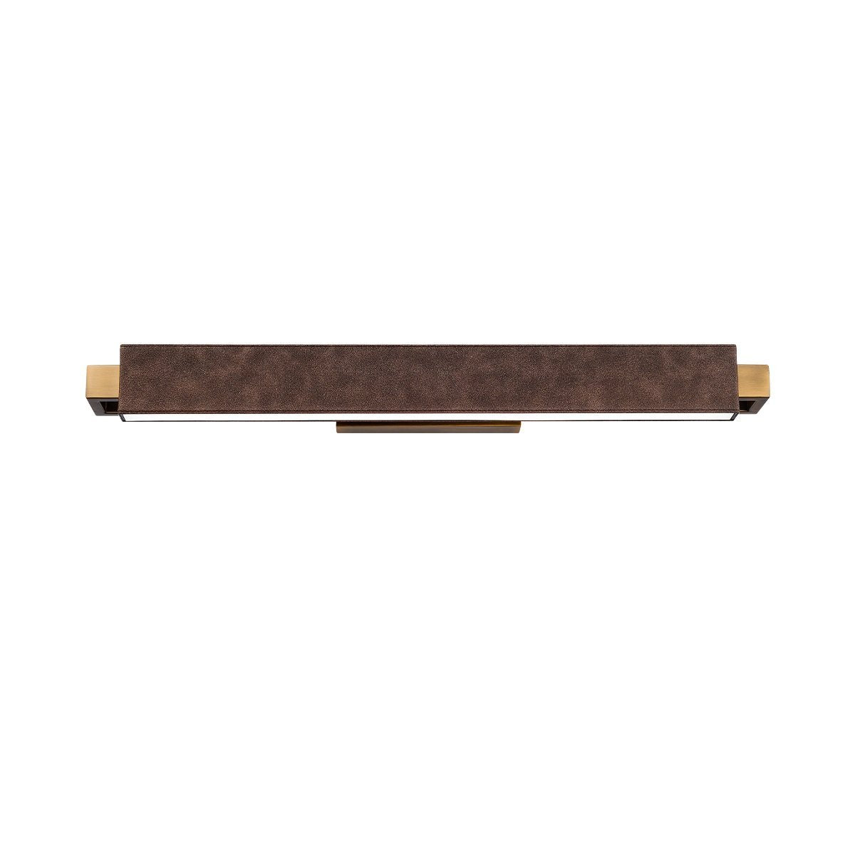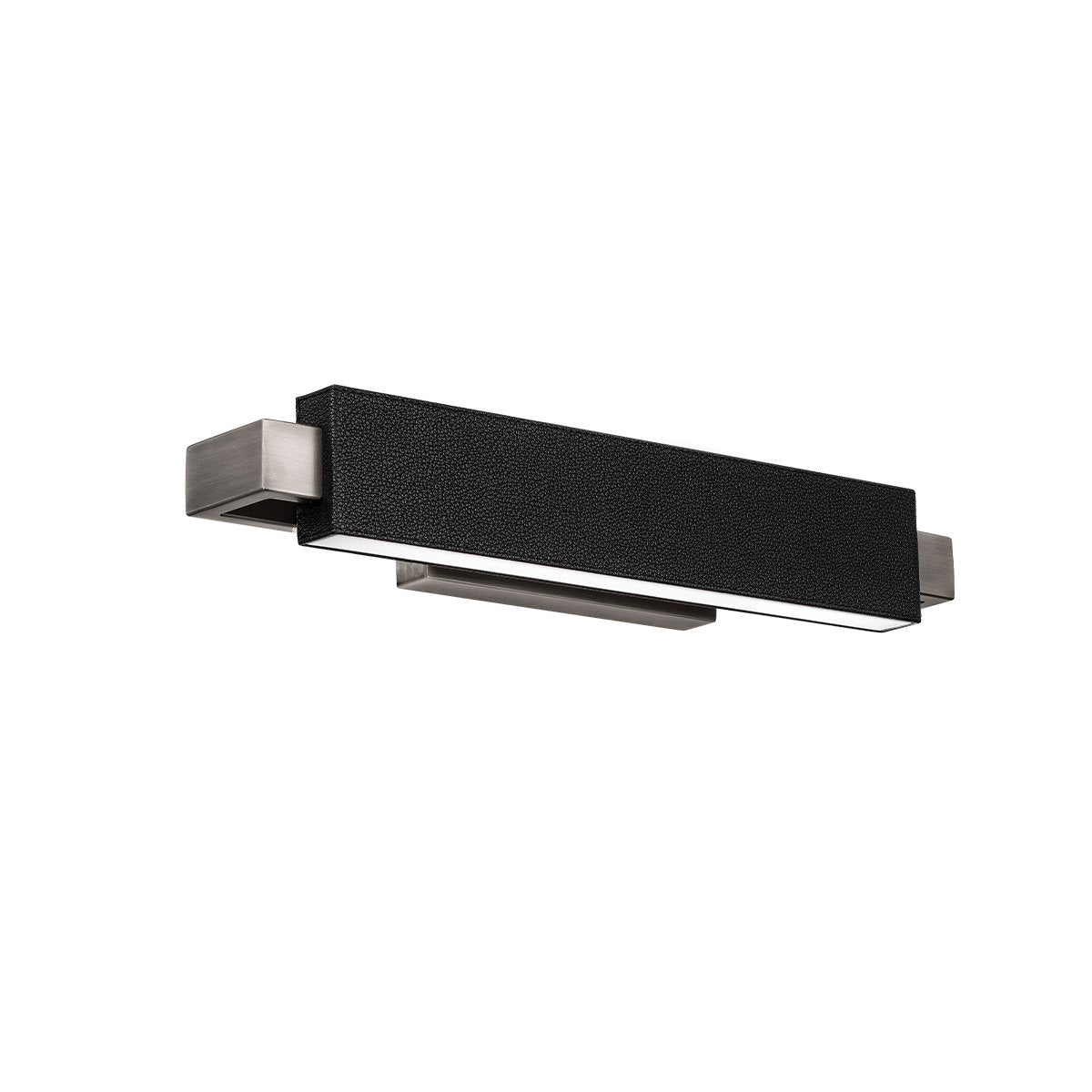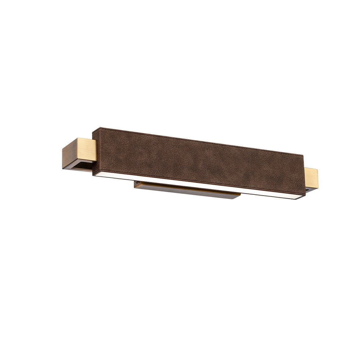 Illuminating couture for interiors. Elegant contrasting pebbled black leather and brushed nickel or combinations of warm brown leather and aged brass exude fashion runway references. This handsome luminaire adds upward and/or downward illumination. Perfect in a formal powder room or mounted over built-in library shelves in a study, this versatile light orients both vertically and horizontally. CCT selectable to choose any of three color temperatures to complement coordinating finishes.