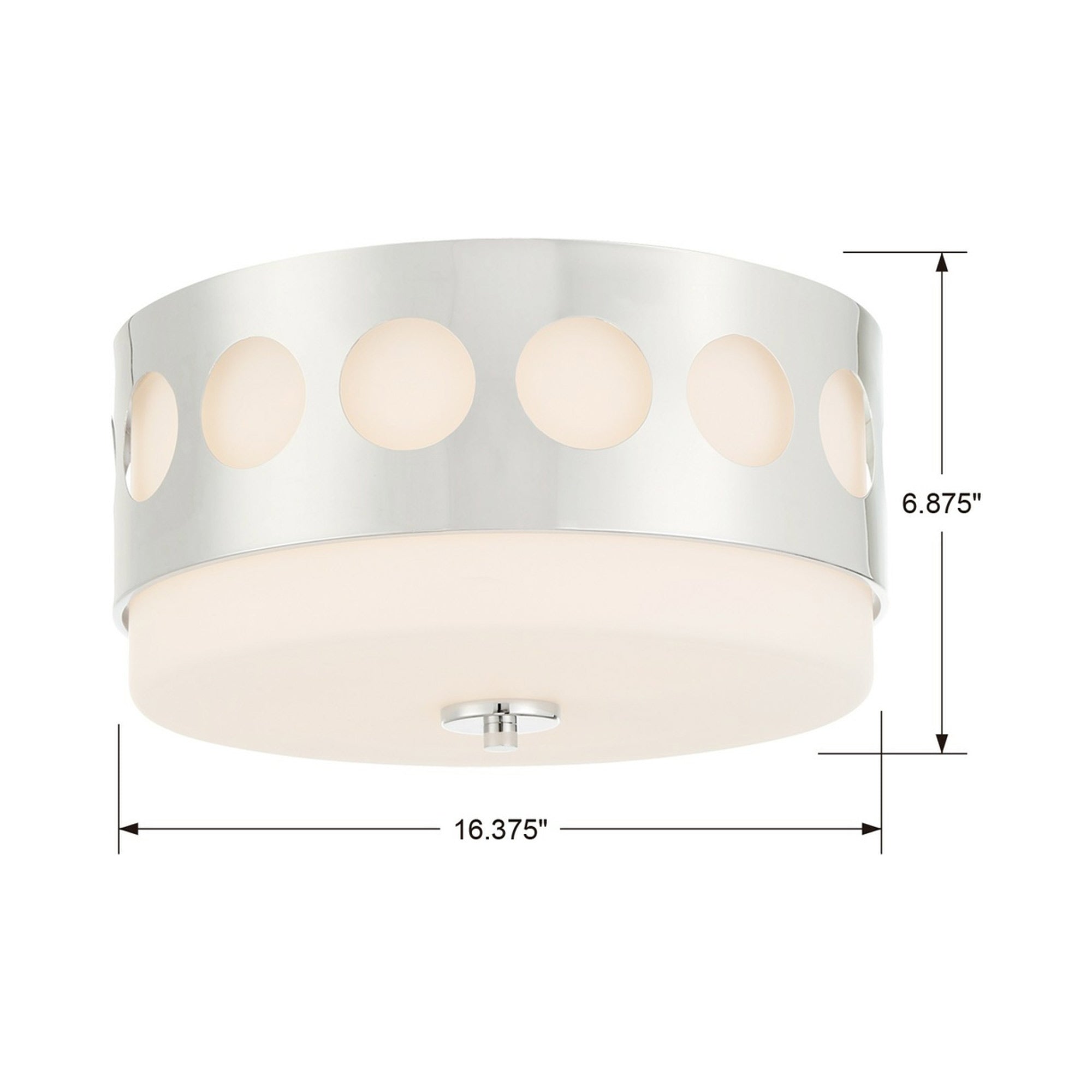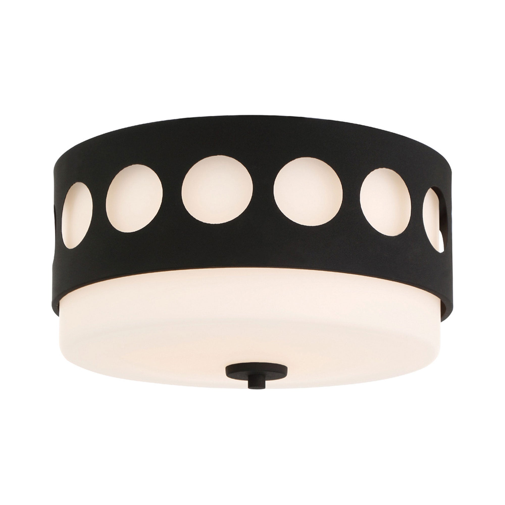 Revisit a retro era of stylish design with the Kirby Flush Mount Ceiling Light from Crystorama. Sassy and artful, its metal frame features prominent circle cutouts adding a bold flavor. Its solid white glass shade dresses up this fun fixture with an elongated depth.