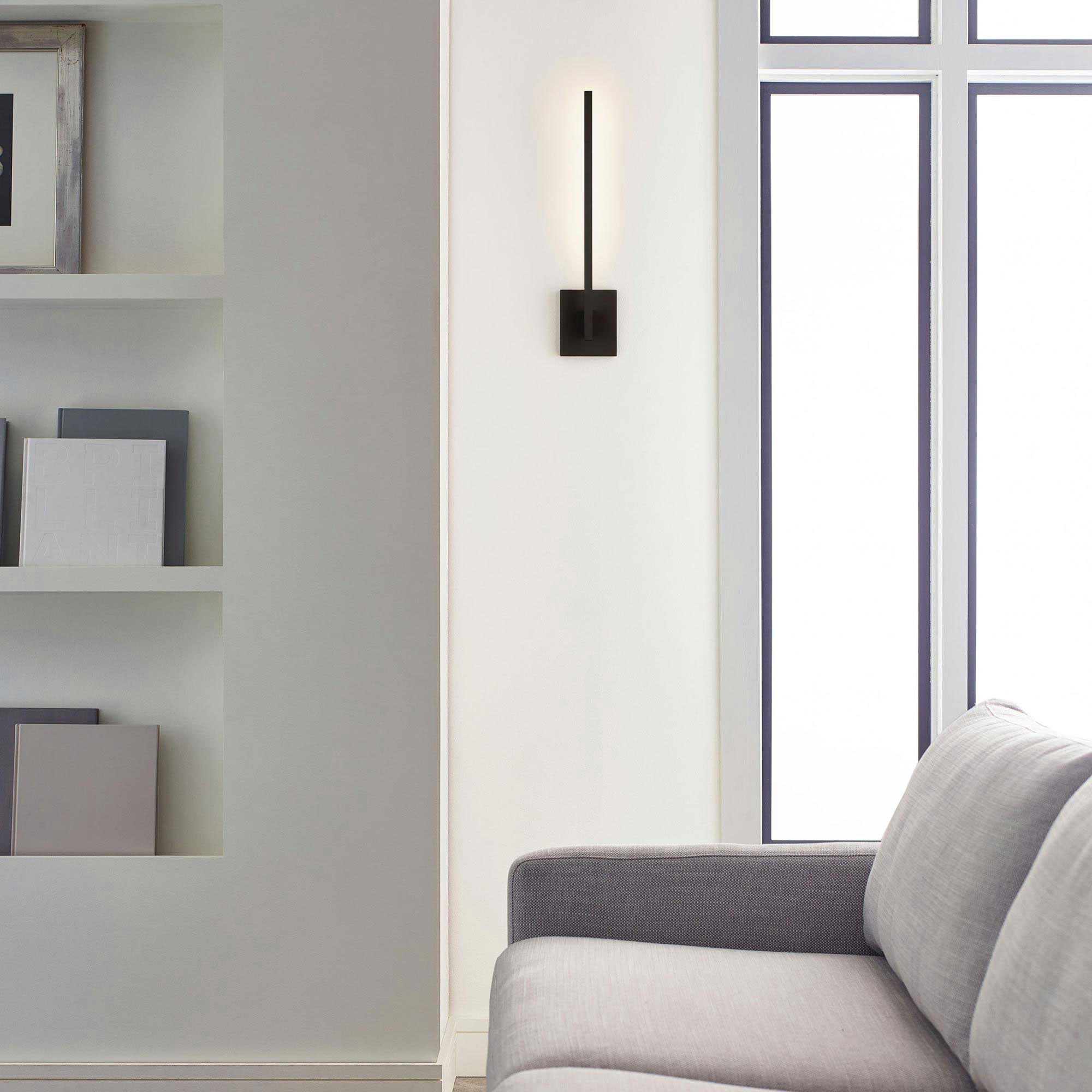 Klee LED Wall Light by Sean Lavin for Visual Comfort Modern features a modern minimalist design with clean, geometric lines inspired by the Bauhaus movement. A thin backplate holds a sleek light guide panel and integrated LEDs providing a glow of indirect 3000K illumination. Available in three finishes, a White Marble Backplate accented with Polished Nickel or Natural Brass that will patina over time and a Nightshade Black finish. Complete the look with the entire Klee collection, including Chandelier, Table Lamp and Floor Lamps.