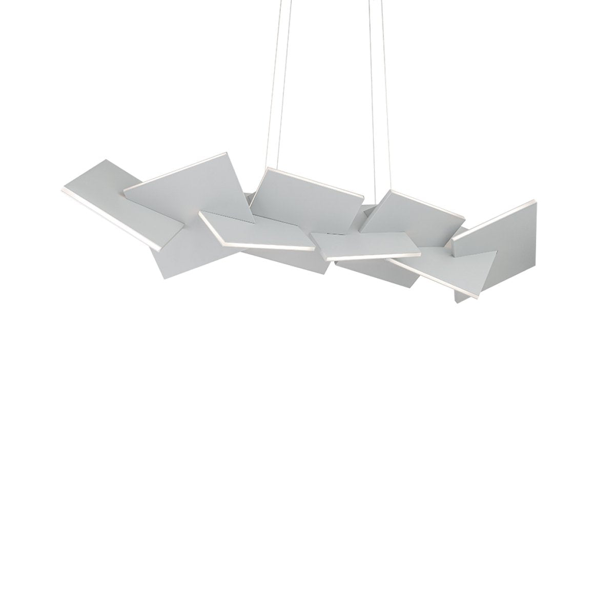 A sculpture of interlocking panels render a thought-provoking aesthetic. Barely visible power aircraft cables add intrigue. The subtle ambient illumination draws attention to this floating work of modern art.